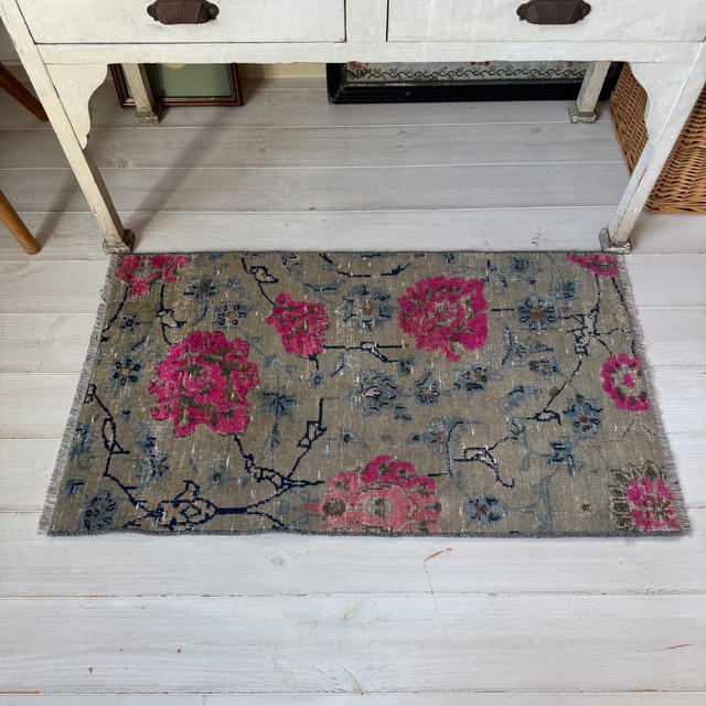 久々、ラグが入荷でございます♪ ショッキングピンクの大輪のお花にブルーの小さなお花達。 なんという絶妙カラーで素敵な組み合わせ! 小さいながらもお部屋のアクセントとなってくれる、とっても可愛い1枚です。 玄関や、チェスト前、椅子の足元、などに♪ 本当に可愛い! 大変申し訳ございませんが、沖縄又は離島のお客様には発送出来ません。 別途送料をお支払いいただけましたら発送対応 も可能ですので、お気軽にお問い合わせください。 size 約90×50cm 素材は、天然のウールとコットン。 手織りの絨毯です。 ビンテージラグは、ほとんどの物がダメージや使用感のある物となっております。 ウール独特の匂いがある場合がございます。 天日干しをしたり、使用していくうちに薄れていくものではございますが、匂いに敏感な方は注意が必要かと思われます。 こちらで扱うラグは全て、クリーニング作業が成された物です。 時を経て、ダメージさえもその物の良さとなり、次の持ち主へと繋がれていく、そんなビンテージラグの良さをお楽しみ頂ける方にぜひ。 ※画面上と実際の色の印象が違って見える場合がございます。 ※ビンテージのお品につき、傷や、スレ、使用感等がございます。ご了承下さい。