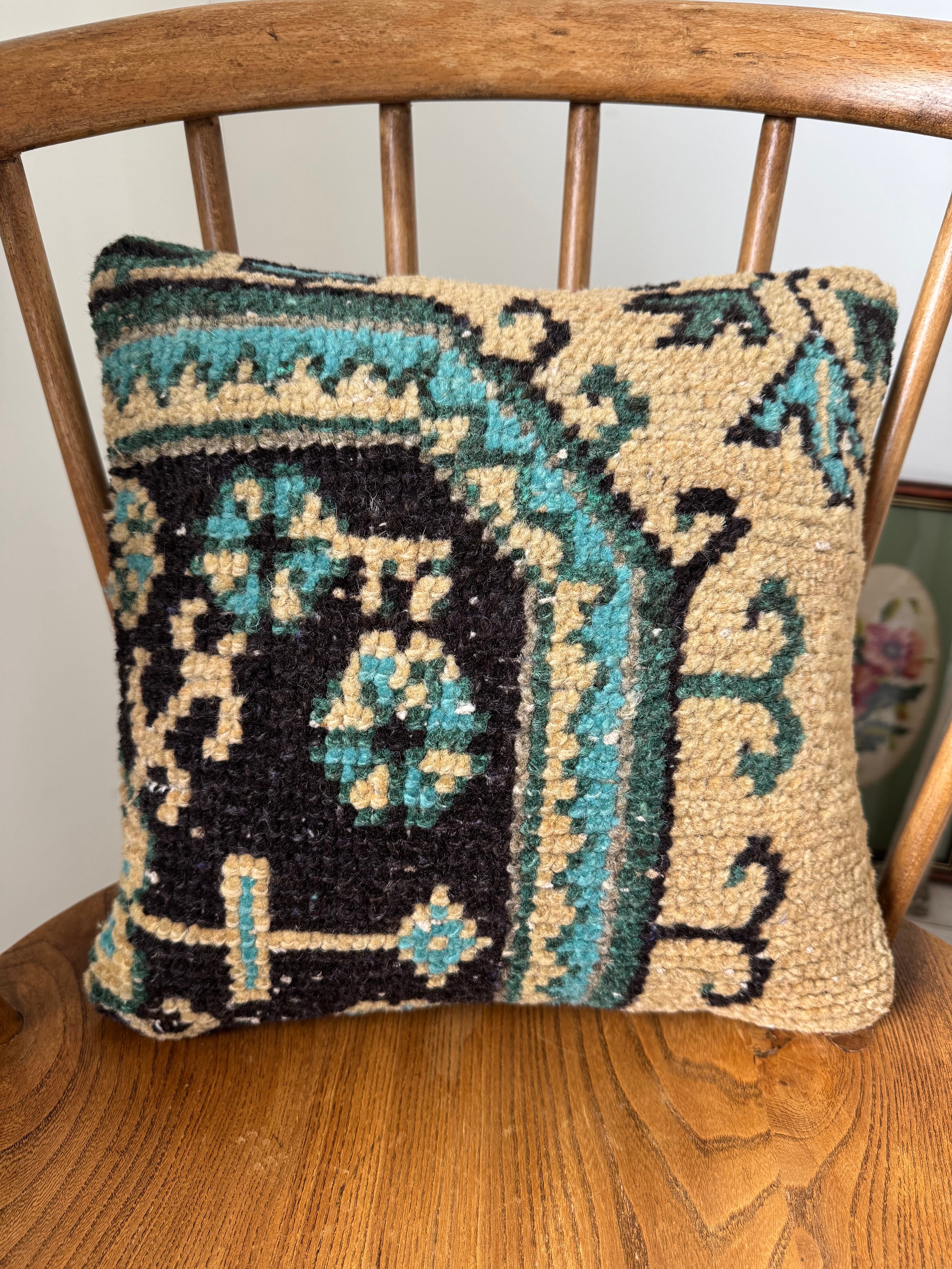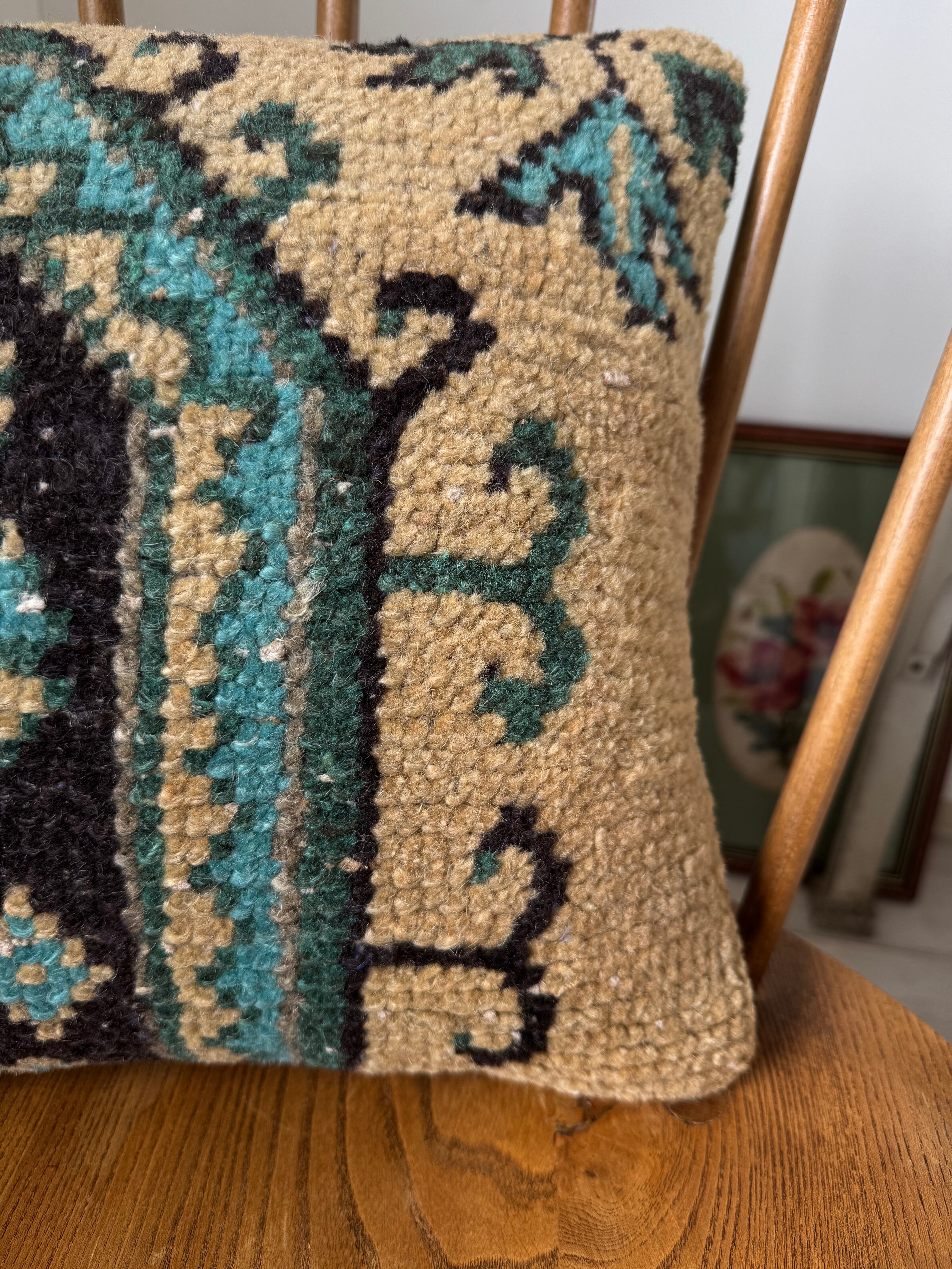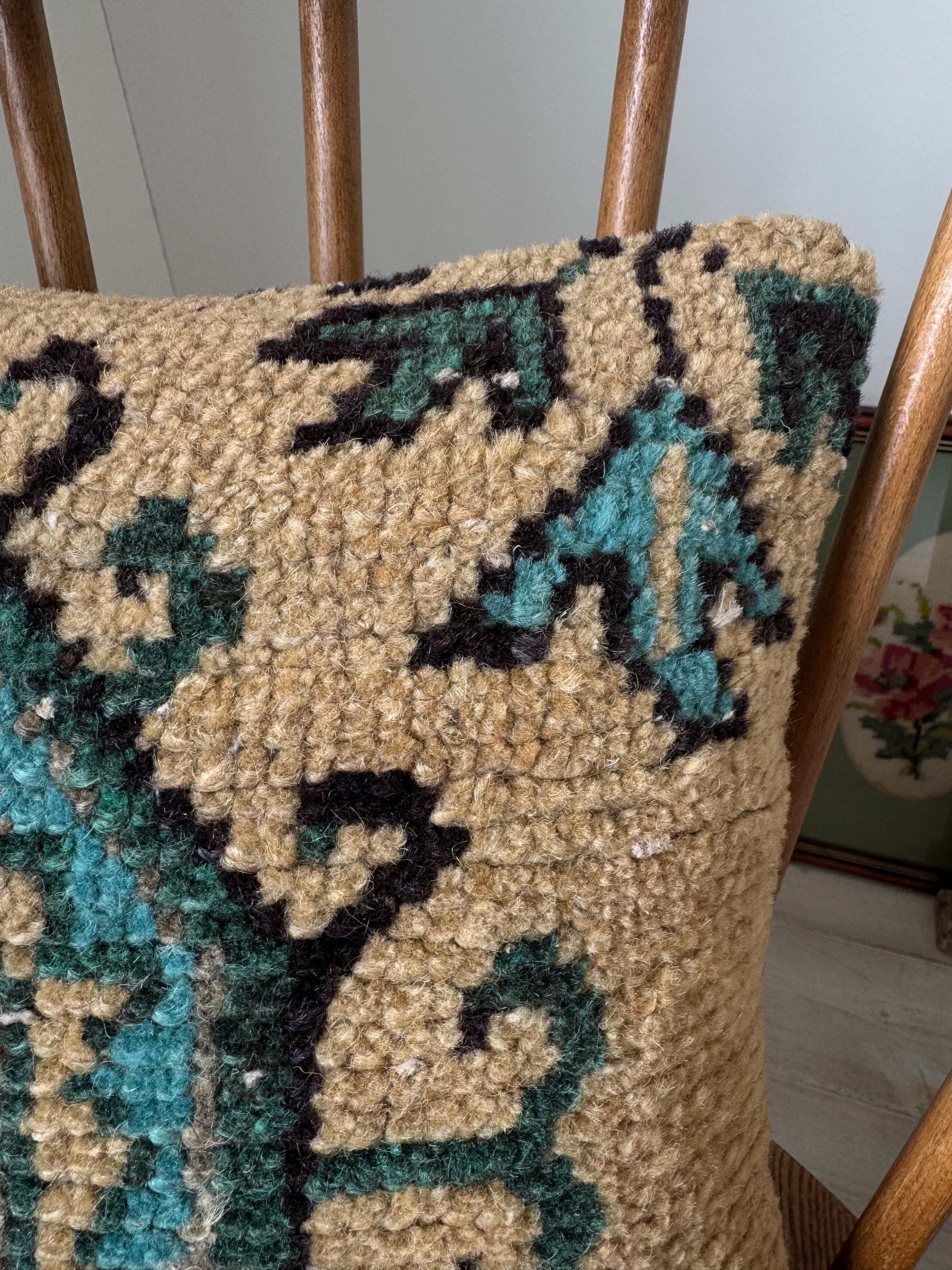 こちら、30年以上前のトルコ絨毯をリメイクしてクッションカバーにした物ですので、ダメージや使用感のある物となっております。