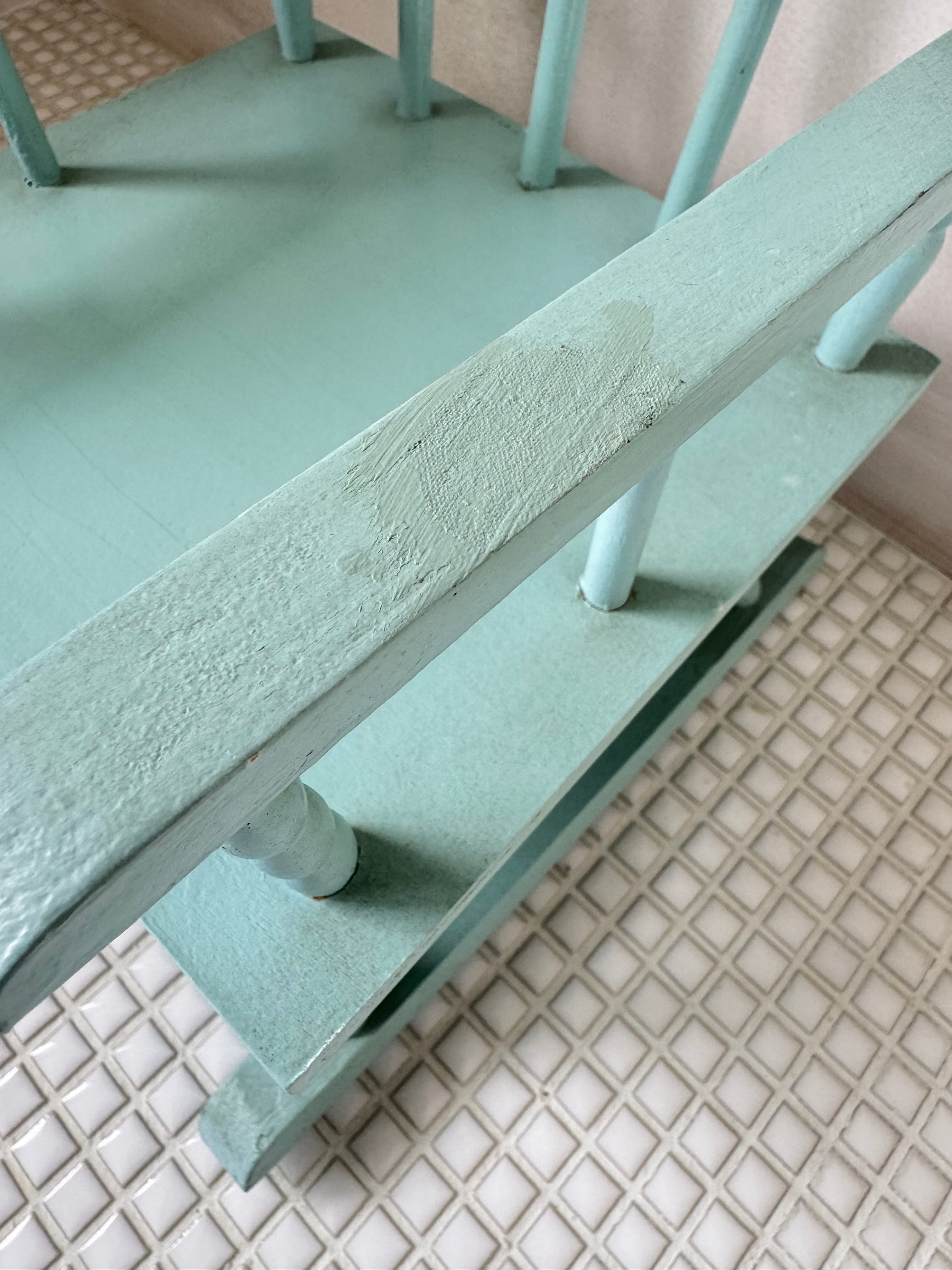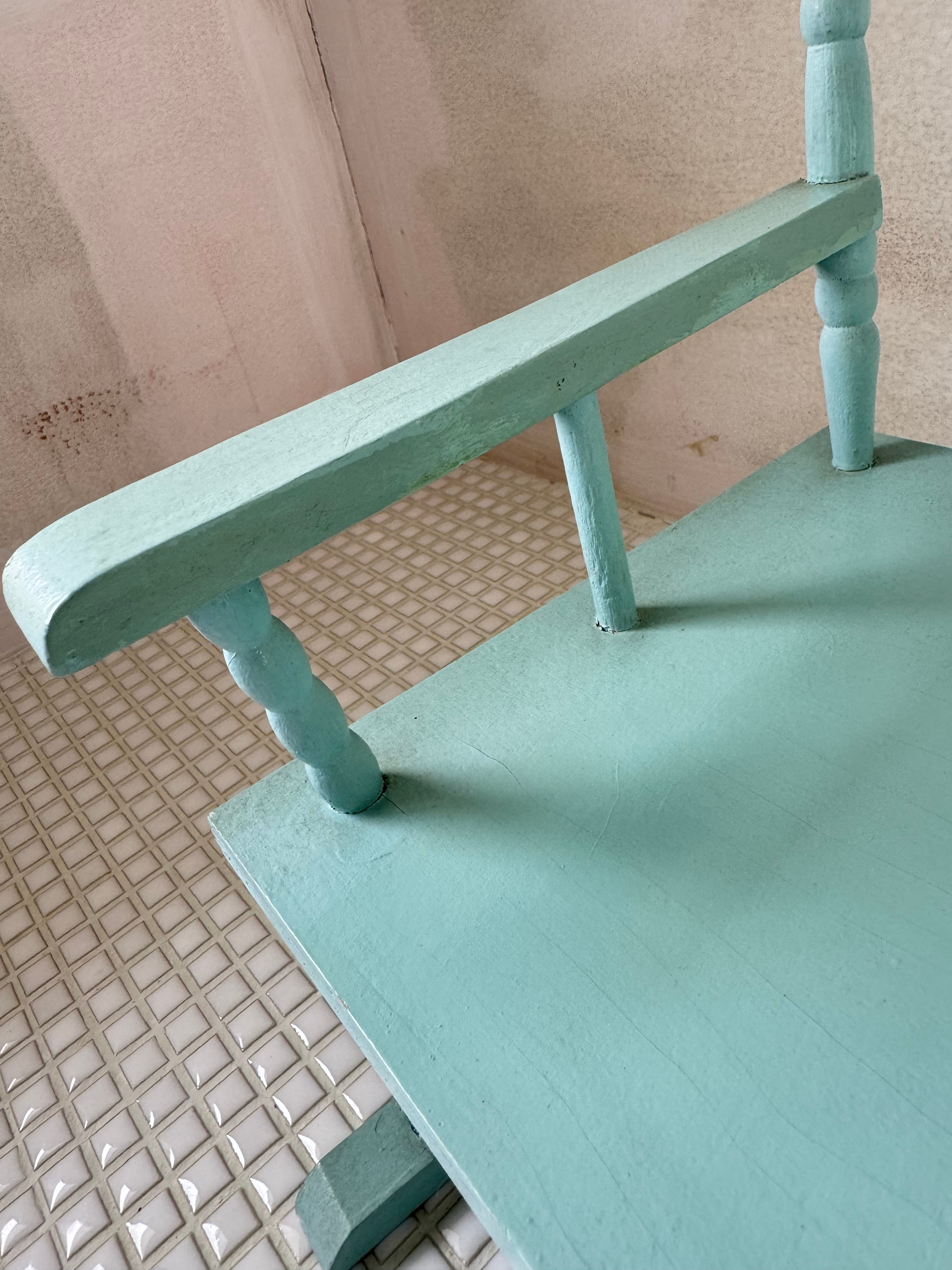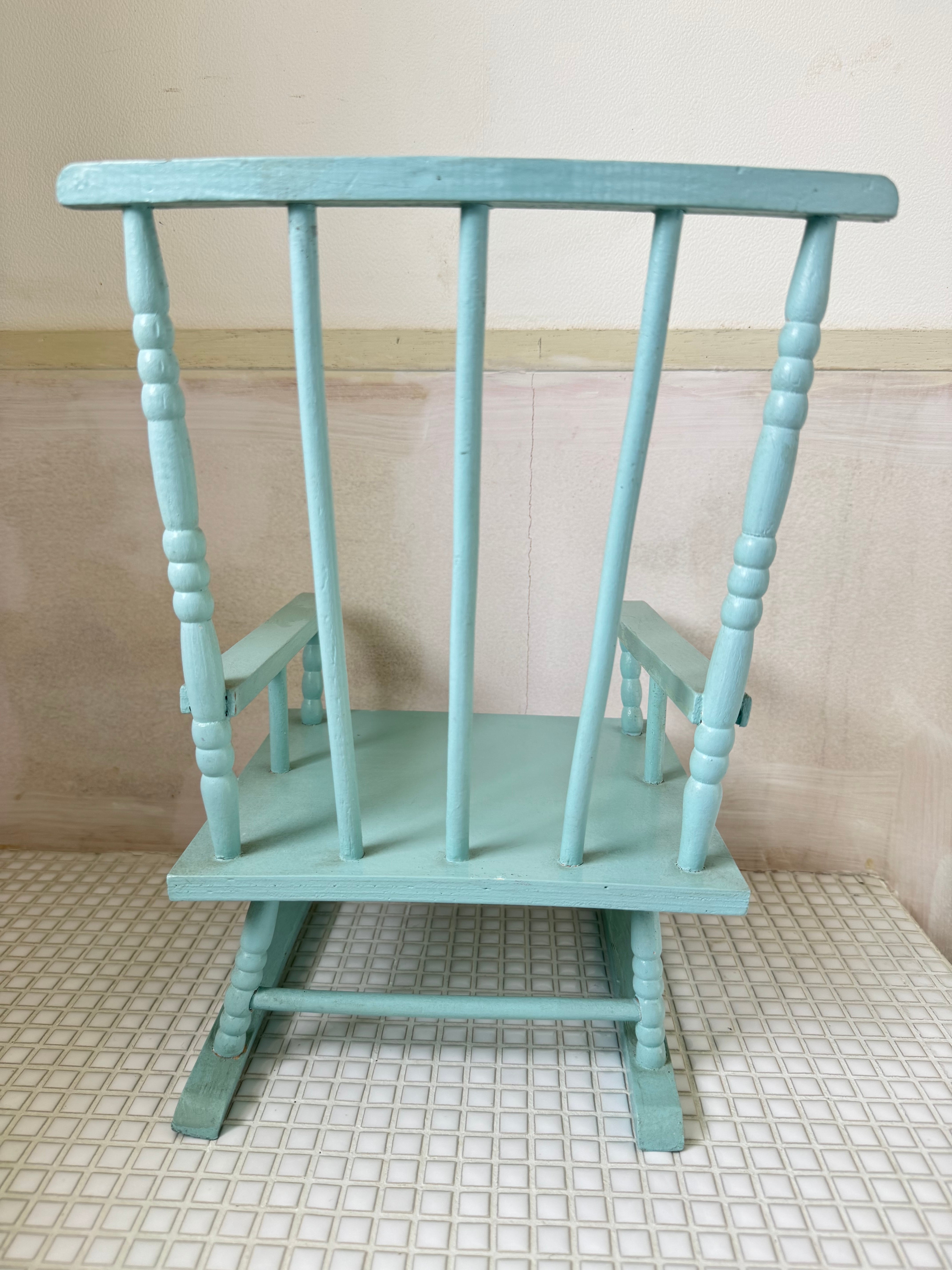 色と言い、形と言い、少し古びた感じと言い、ものすごく可愛い水色のドールチェア。