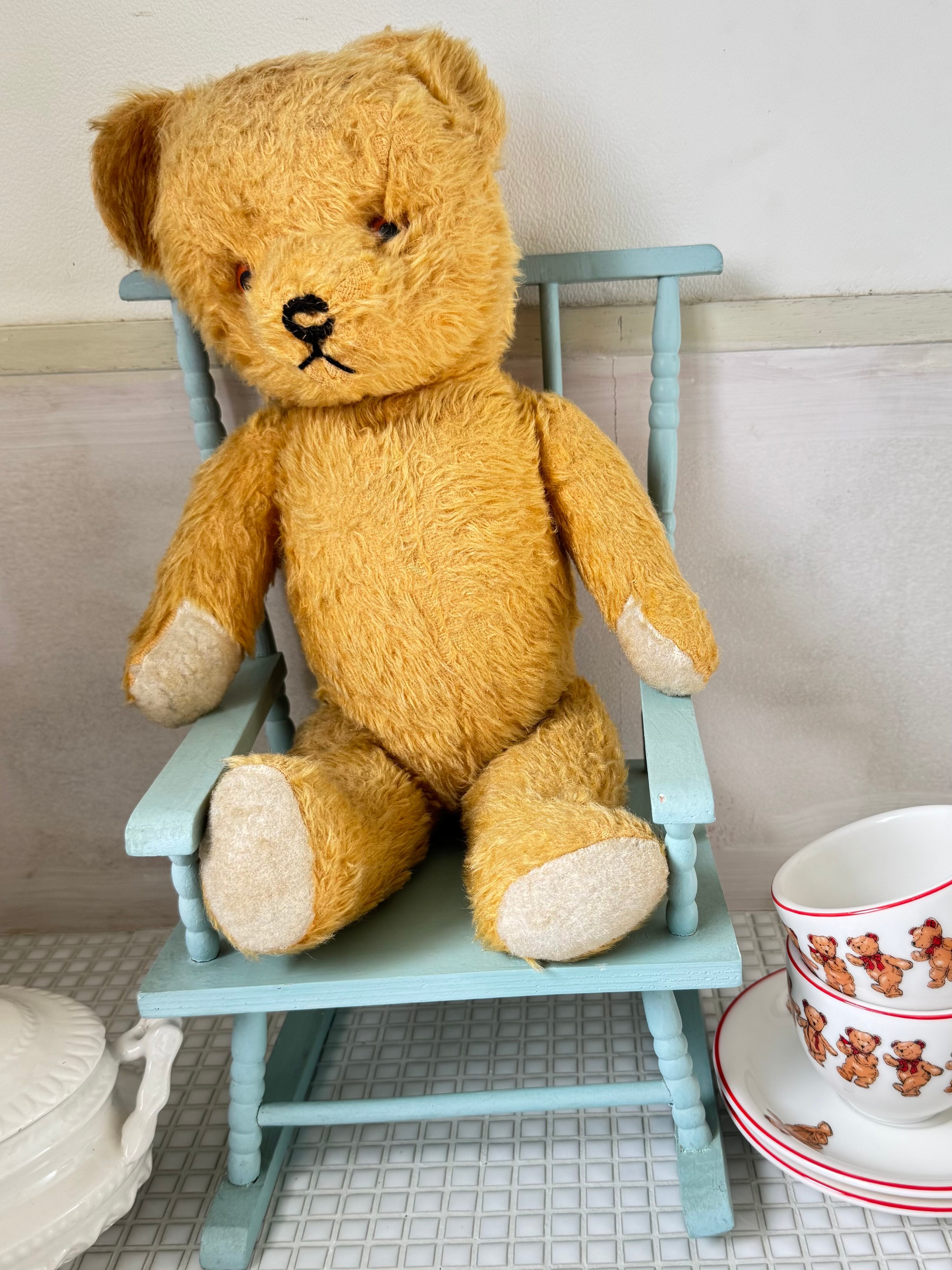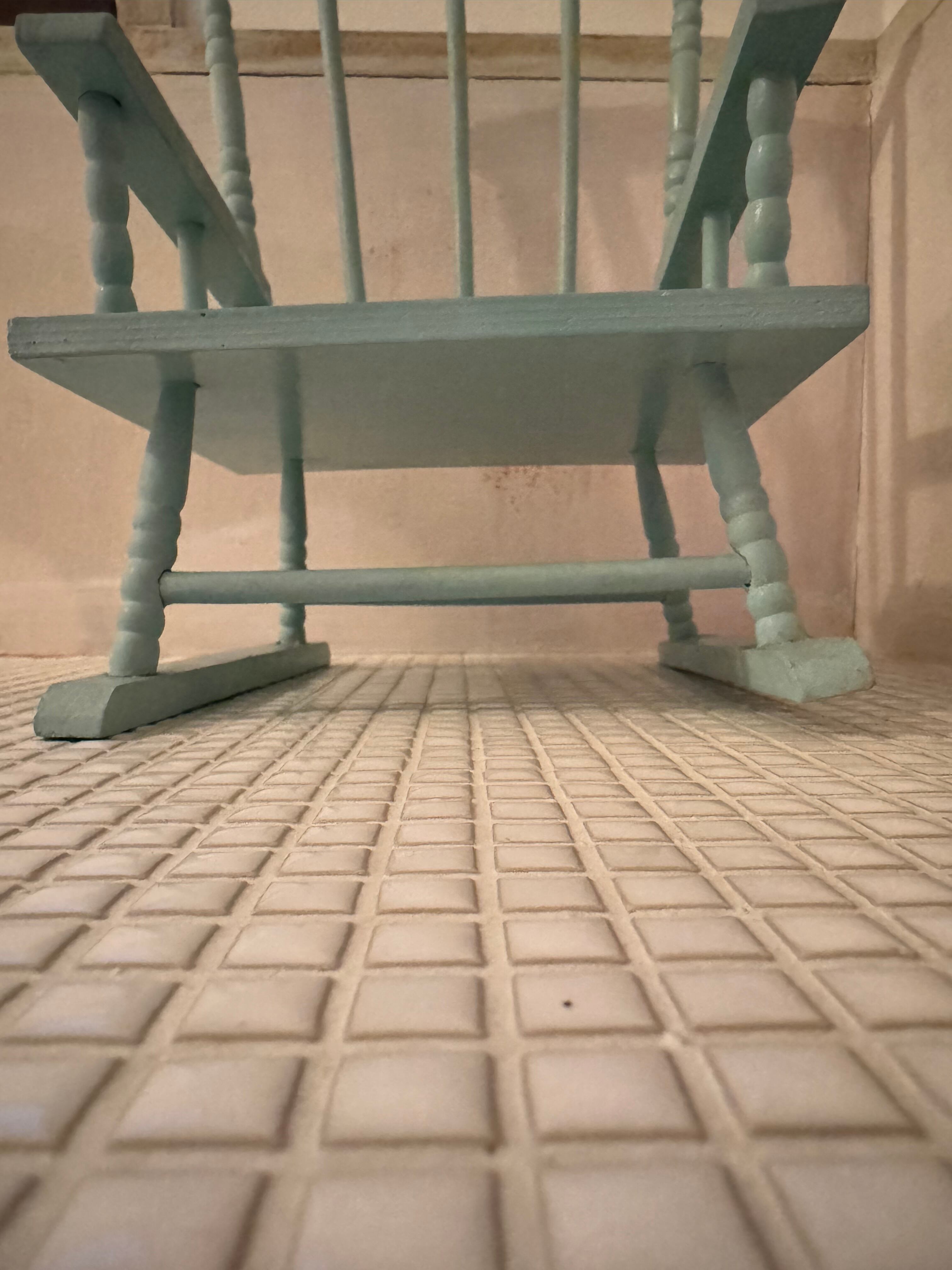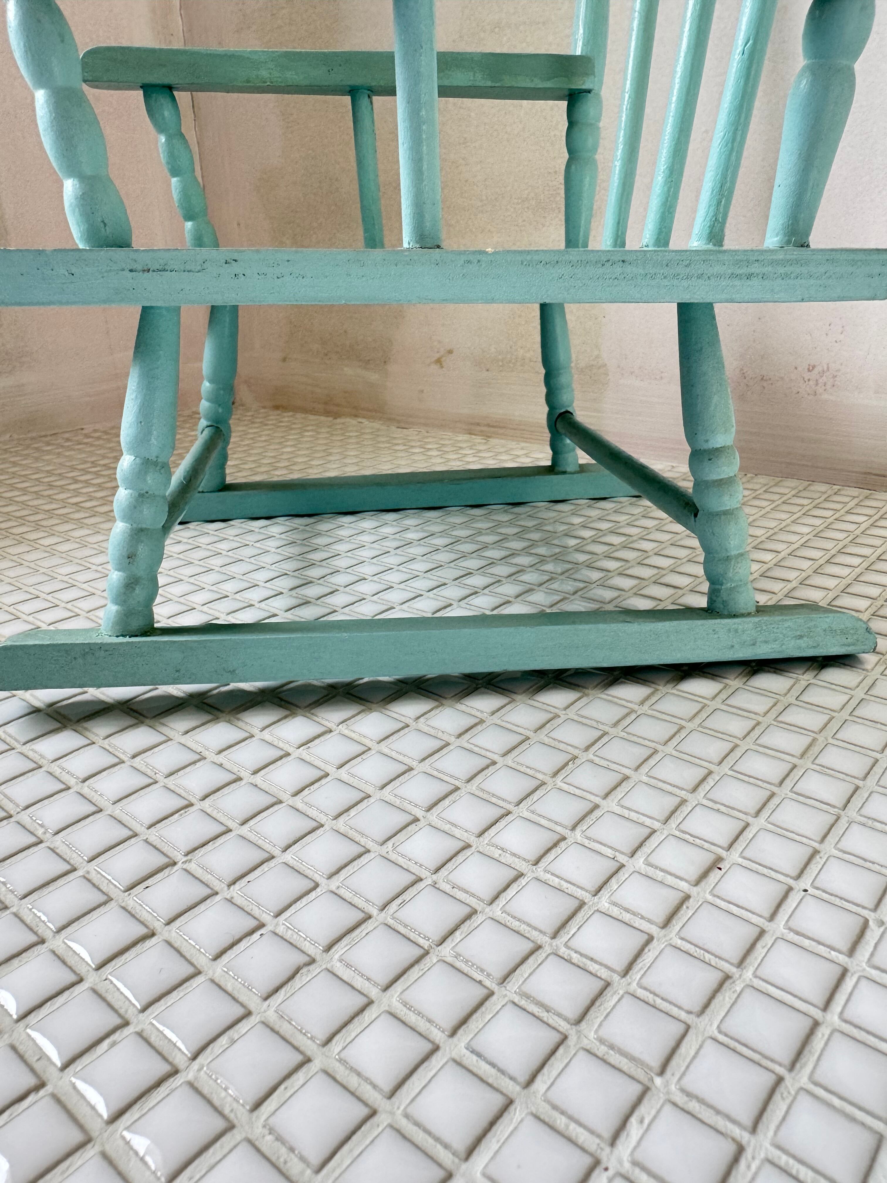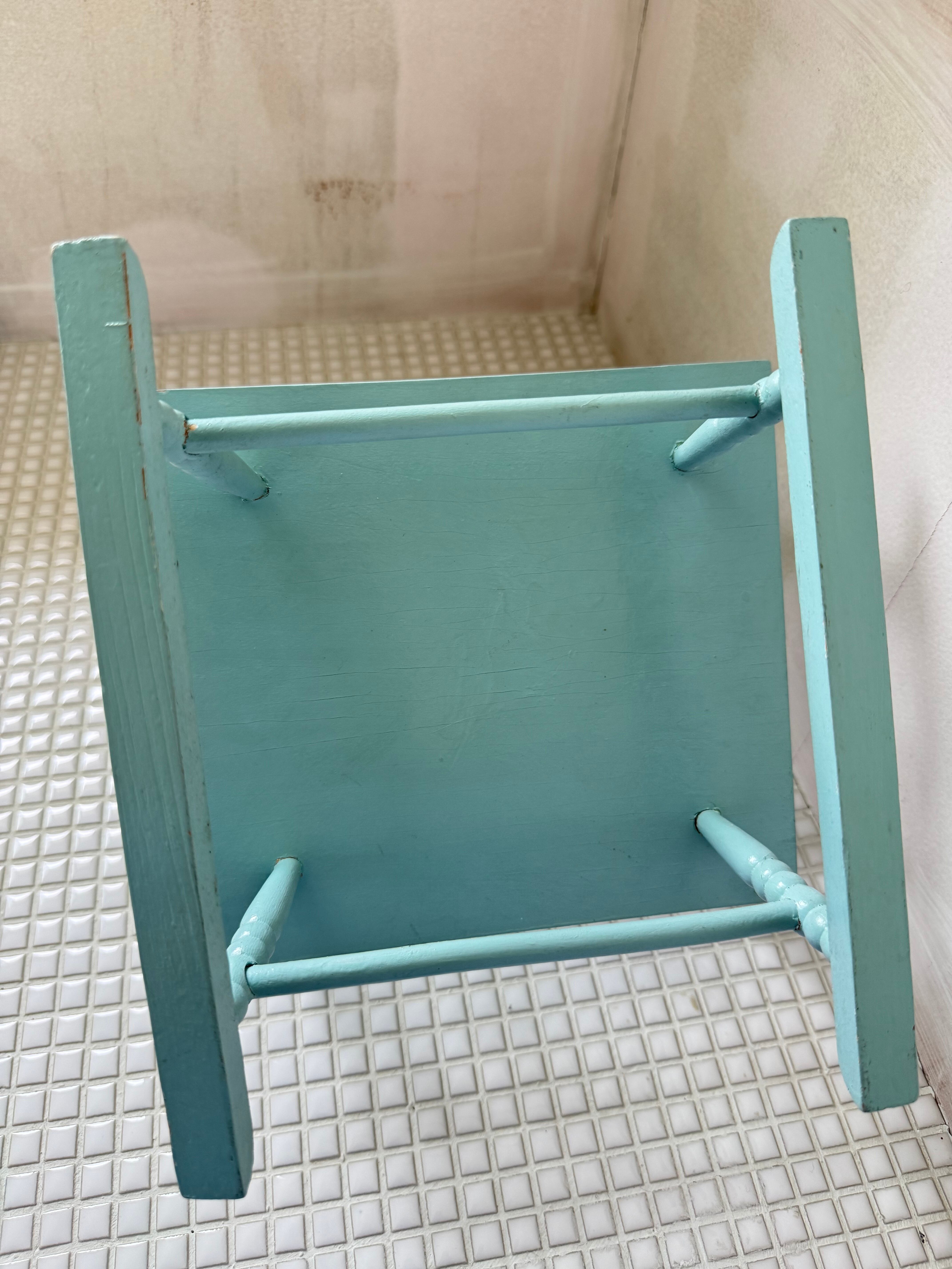 色と言い、形と言い、少し古びた感じと言い、ものすごく可愛い水色のドールチェア。