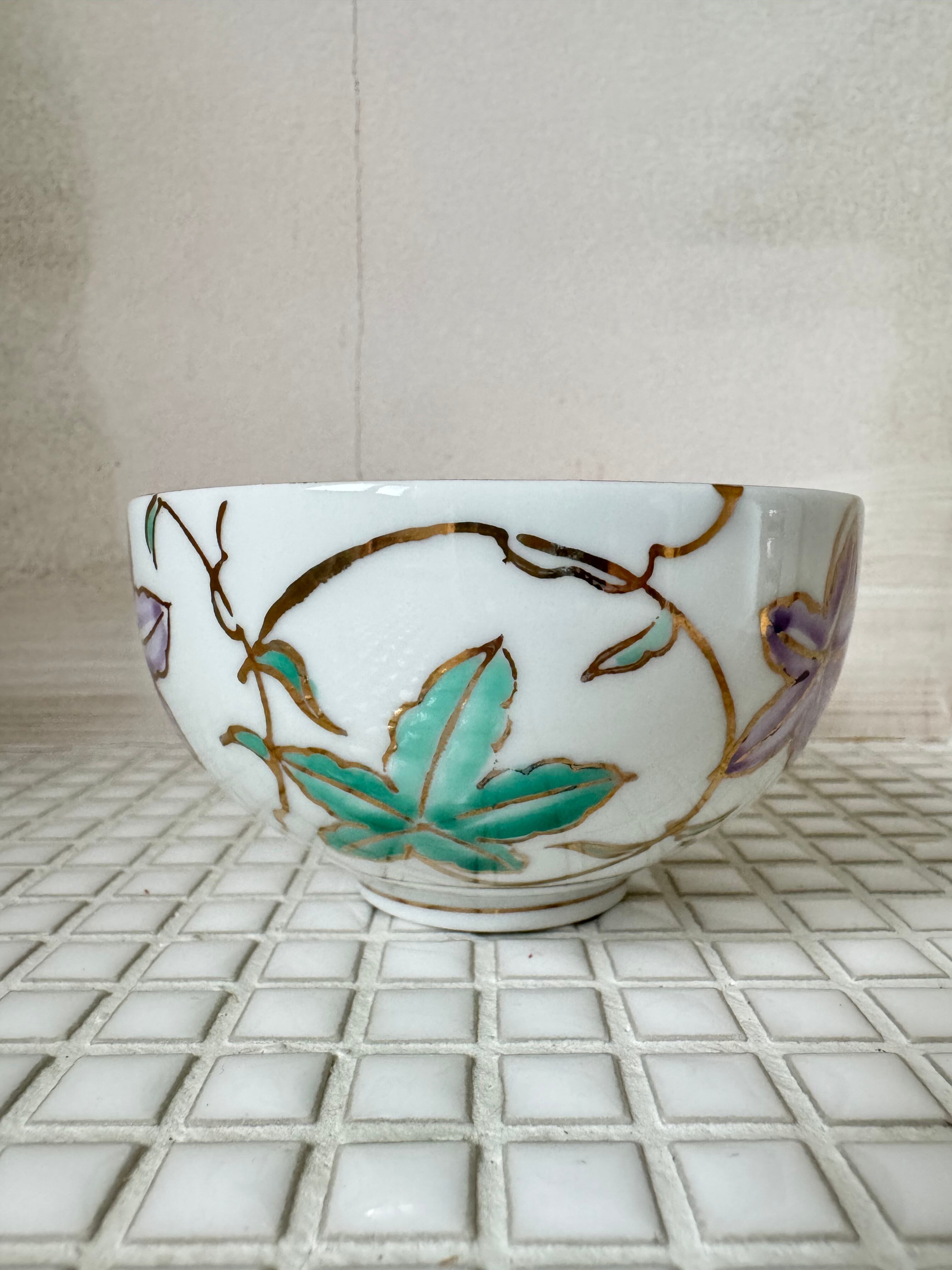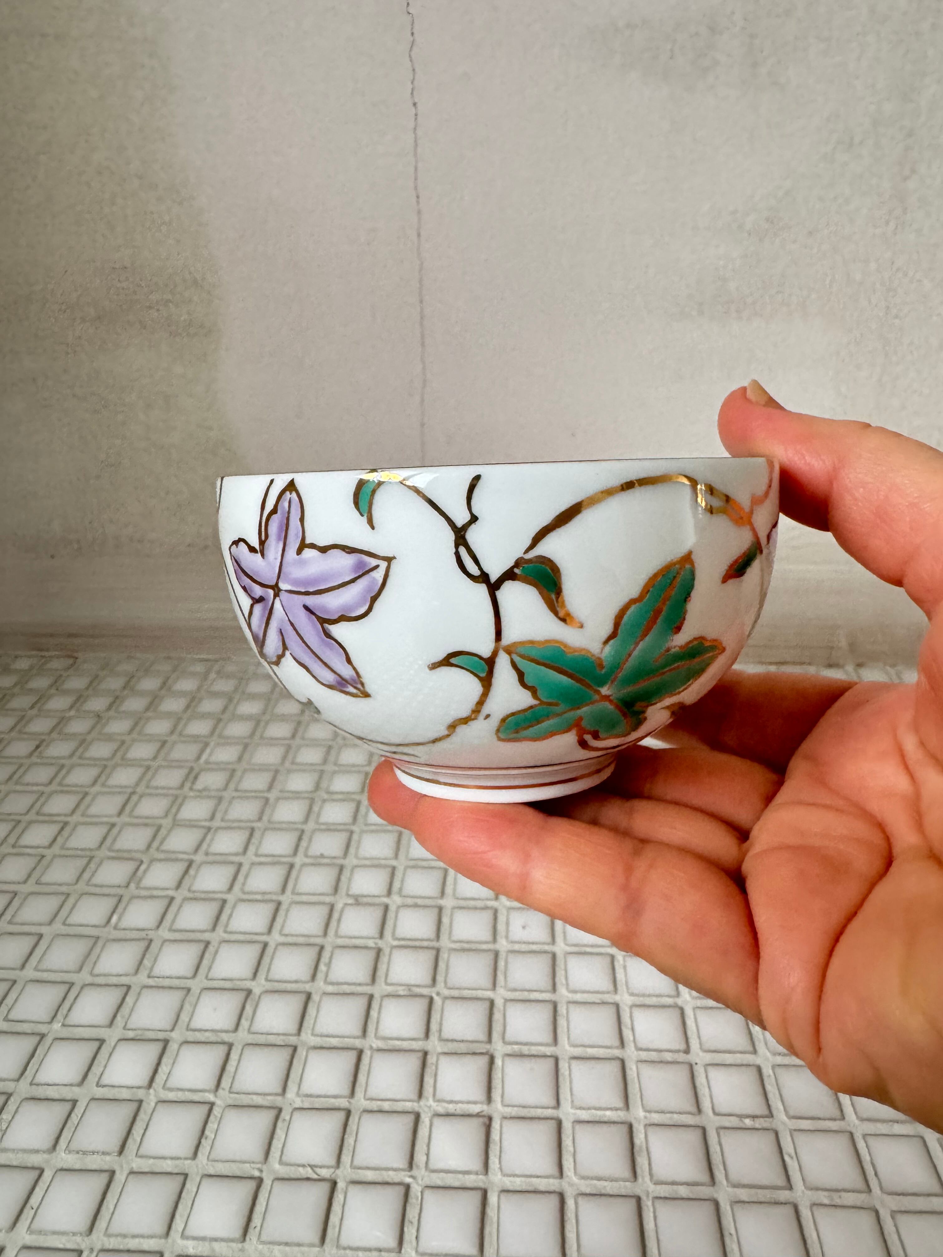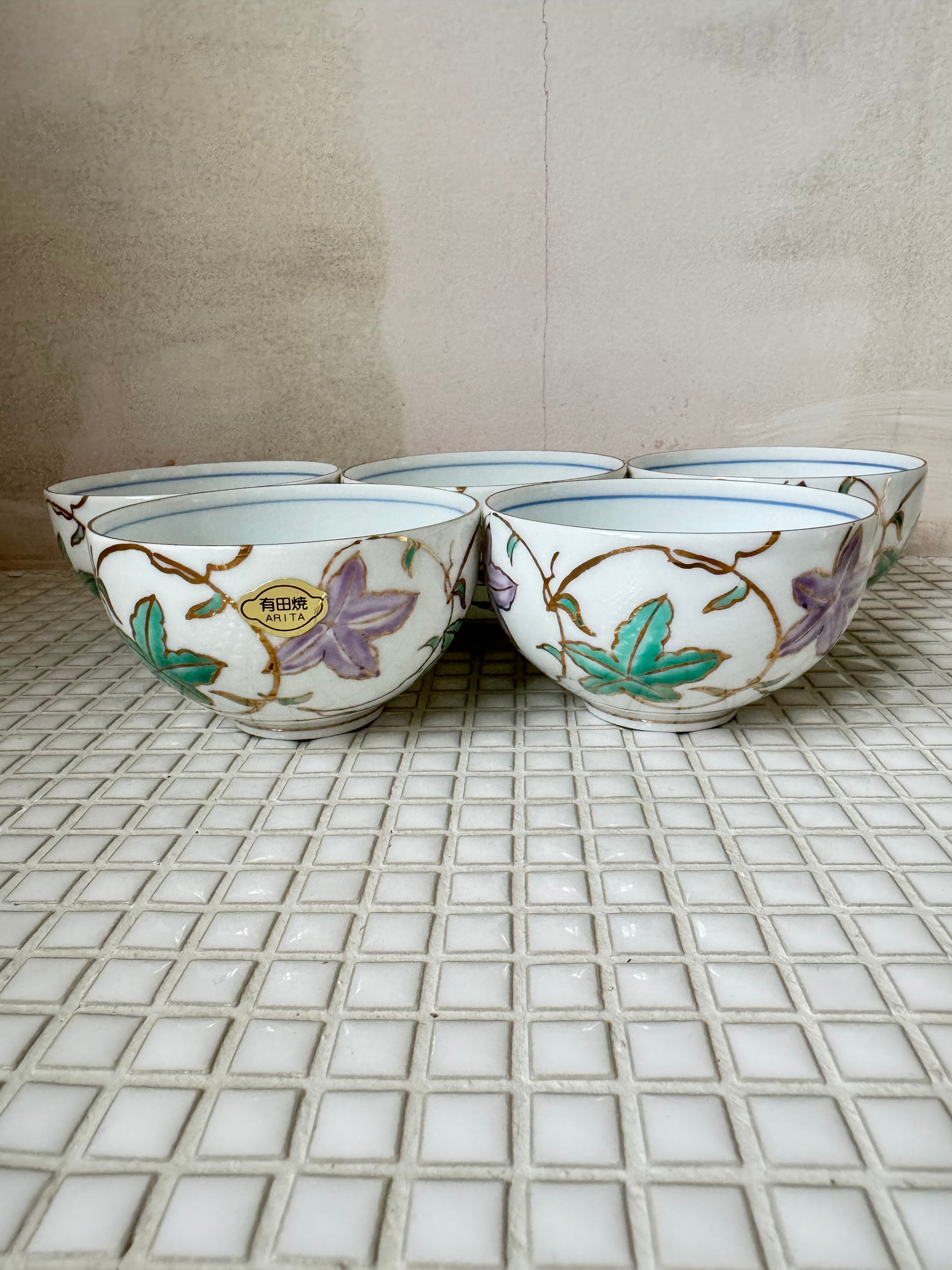 紫とエメラルドグリーンの綺麗な植物柄で、とても素敵なお茶のセットです。