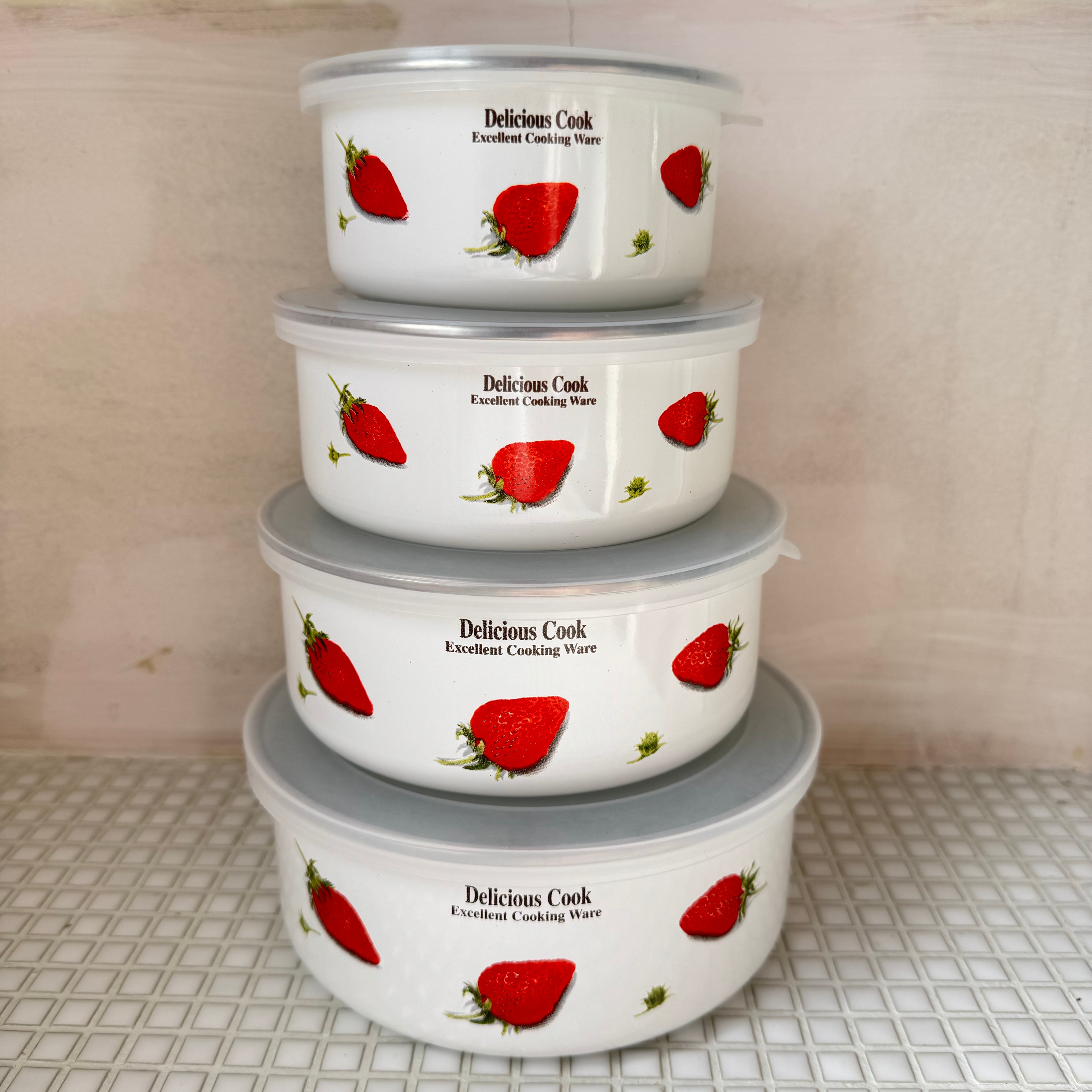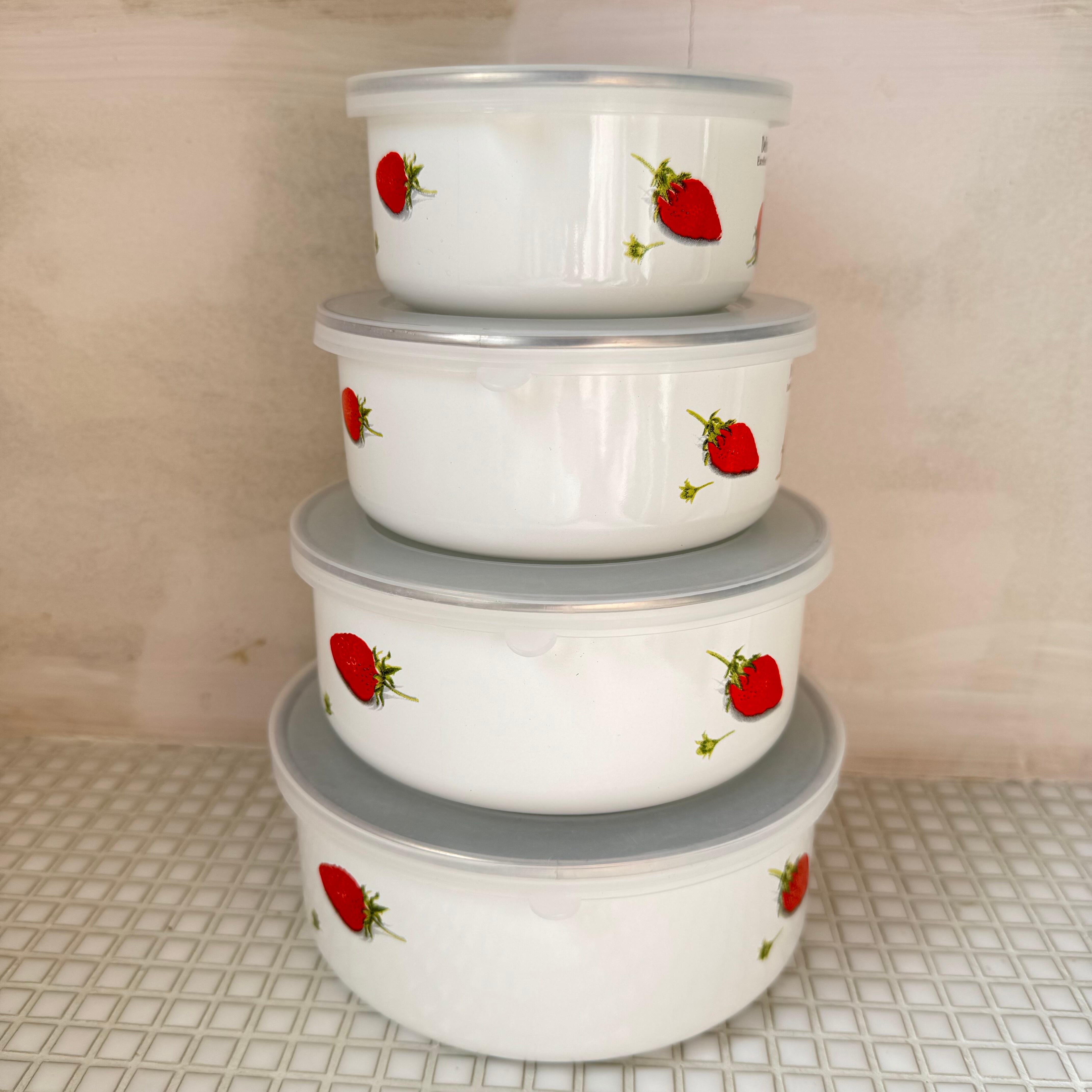 イチゴの柄の、ちょっとレトロ感漂うホーローの保存容器。4つセット。
