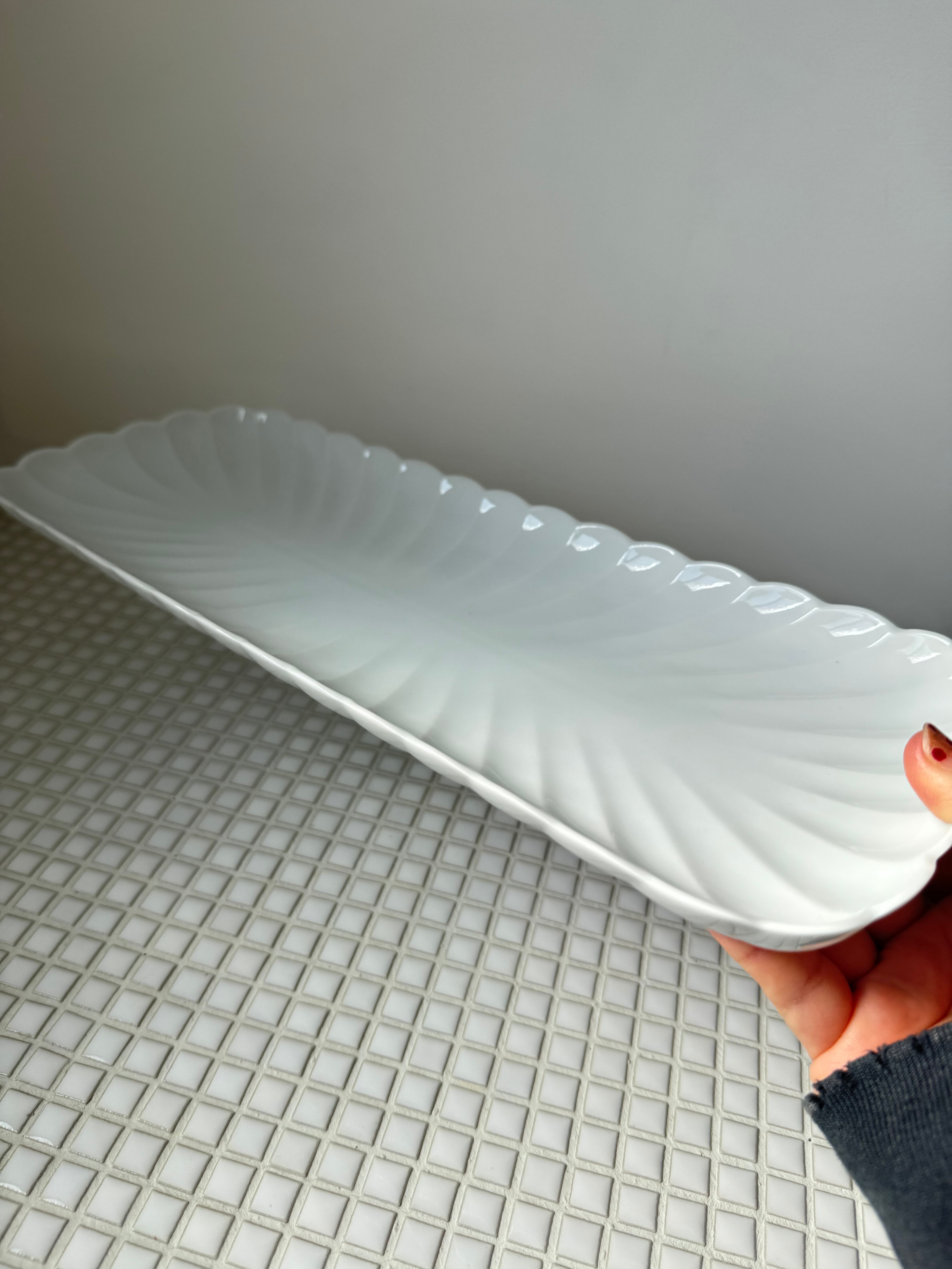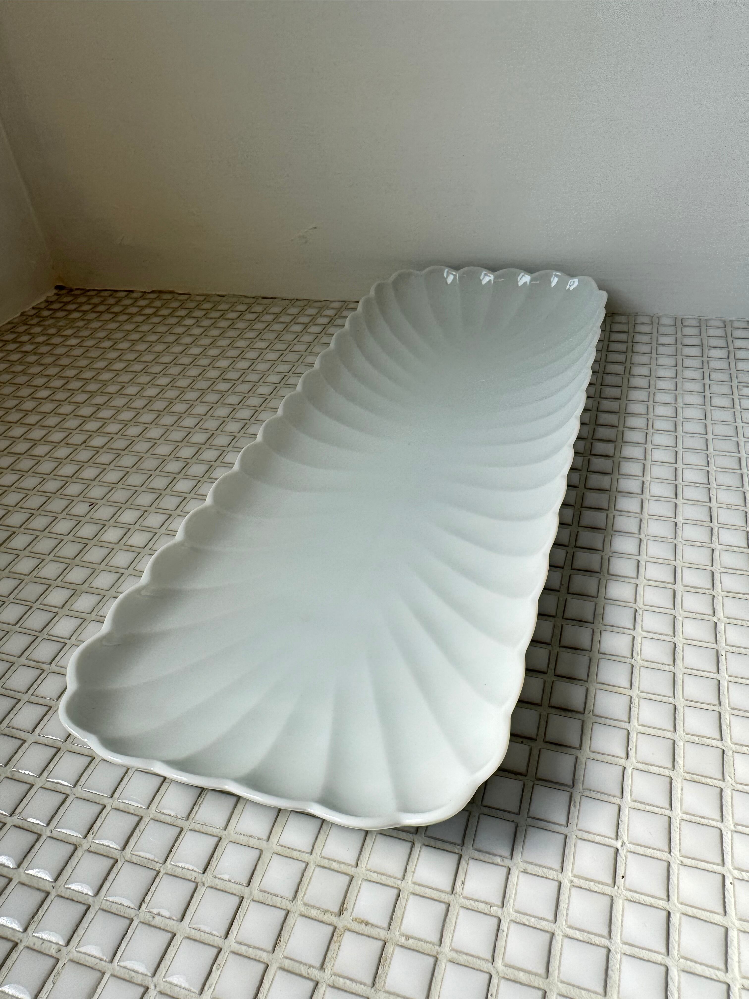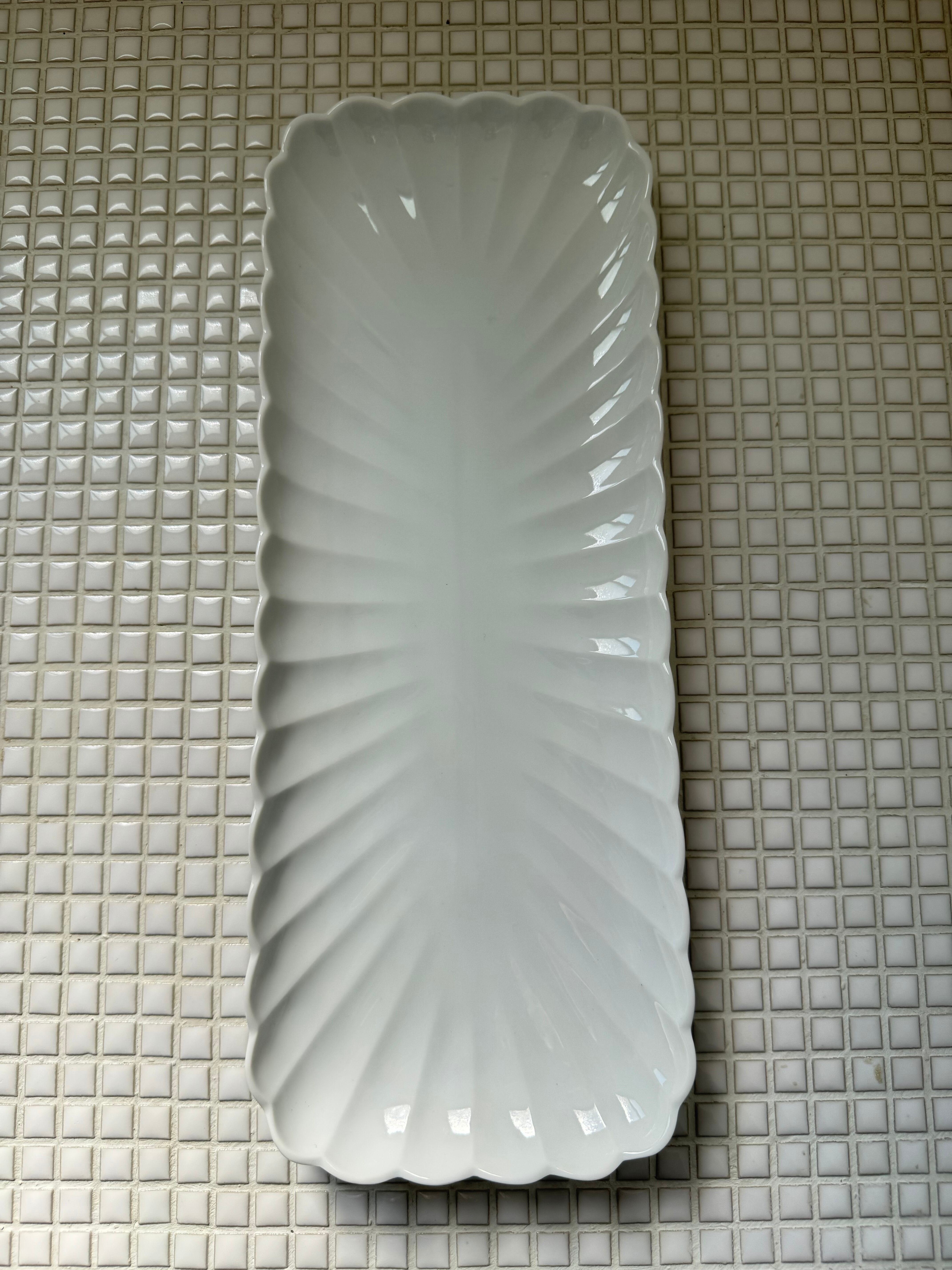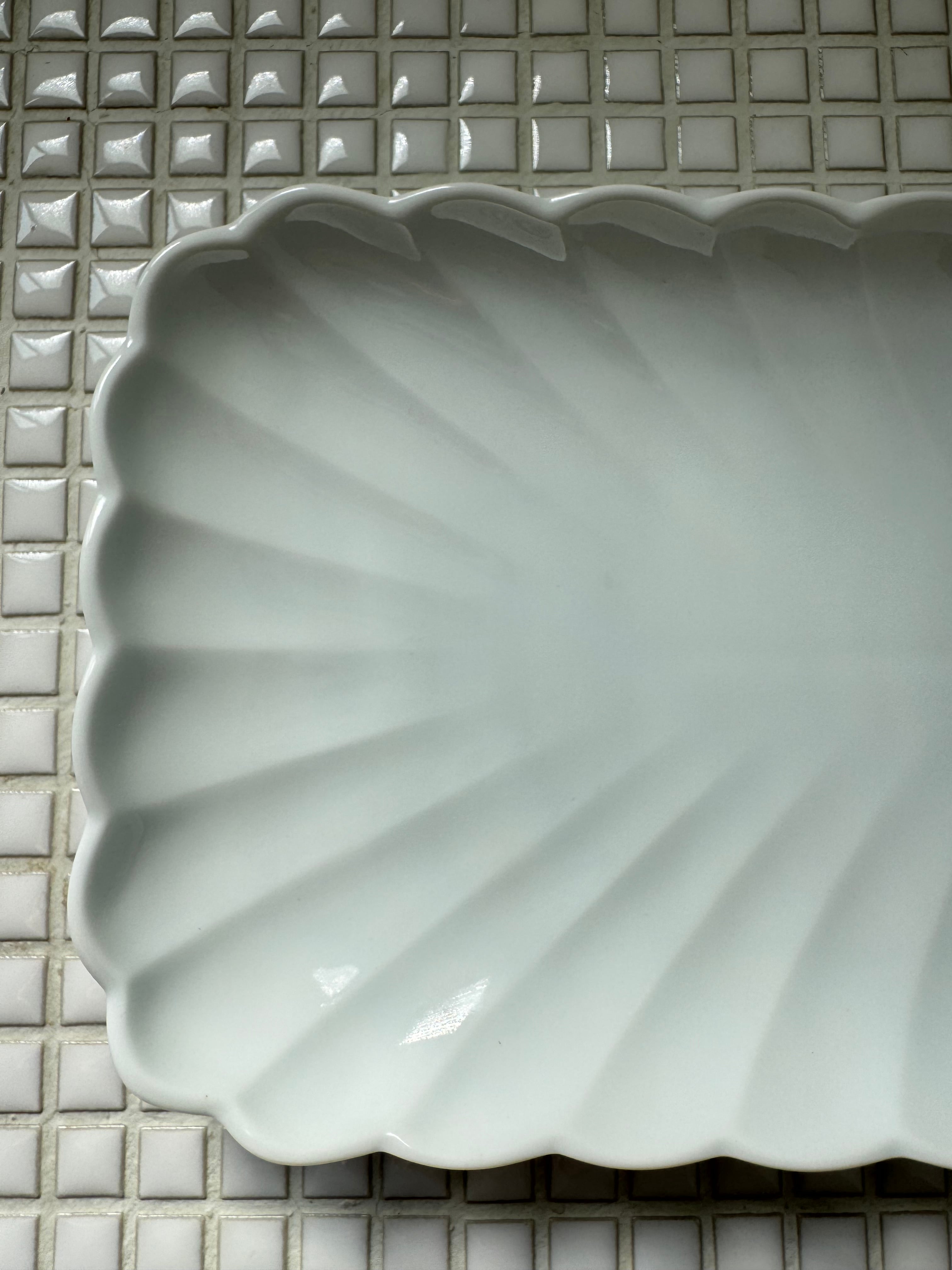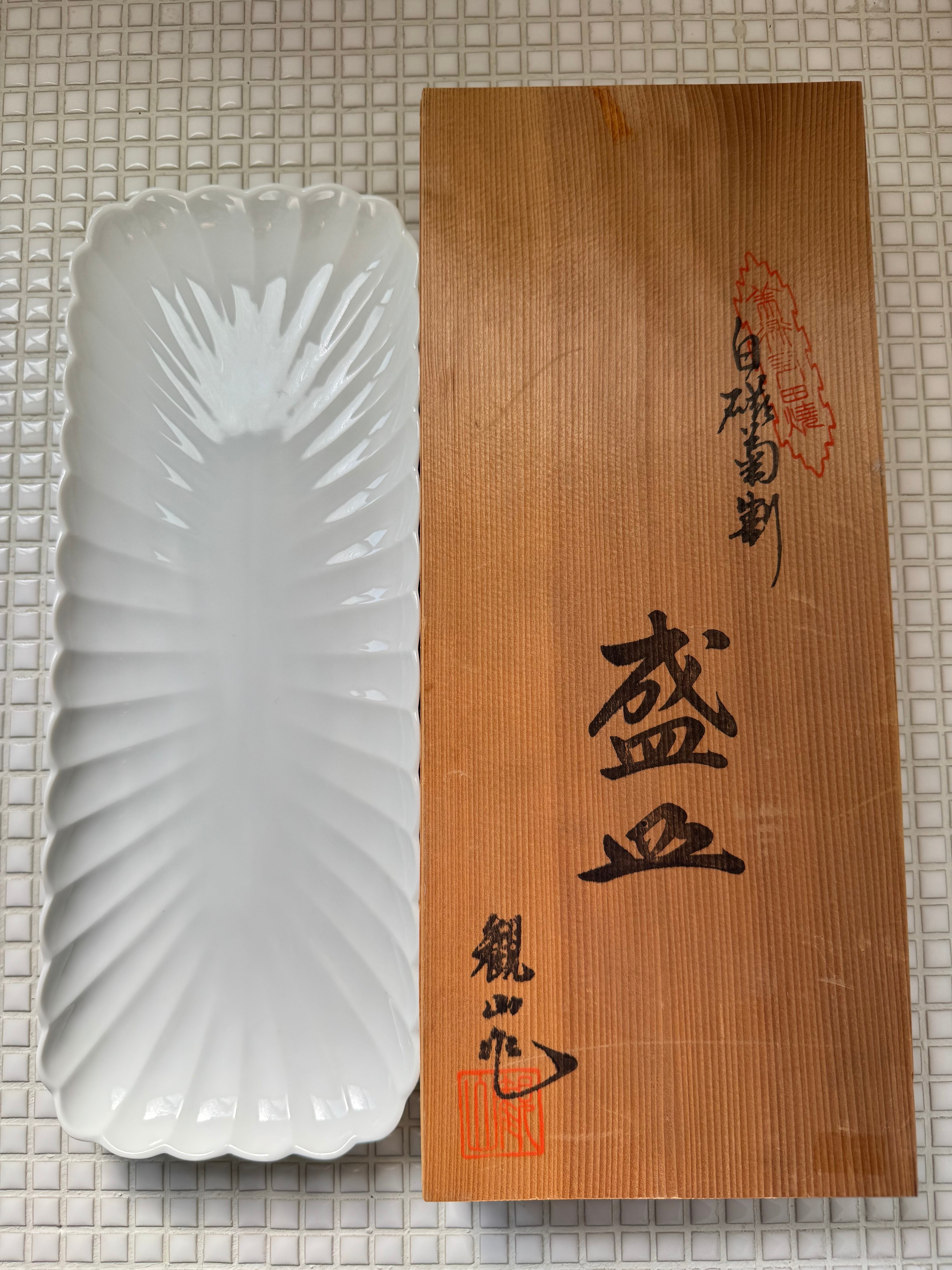 菊割の形状と白磁の白が美しい、長方形の大きめな盛り皿です。