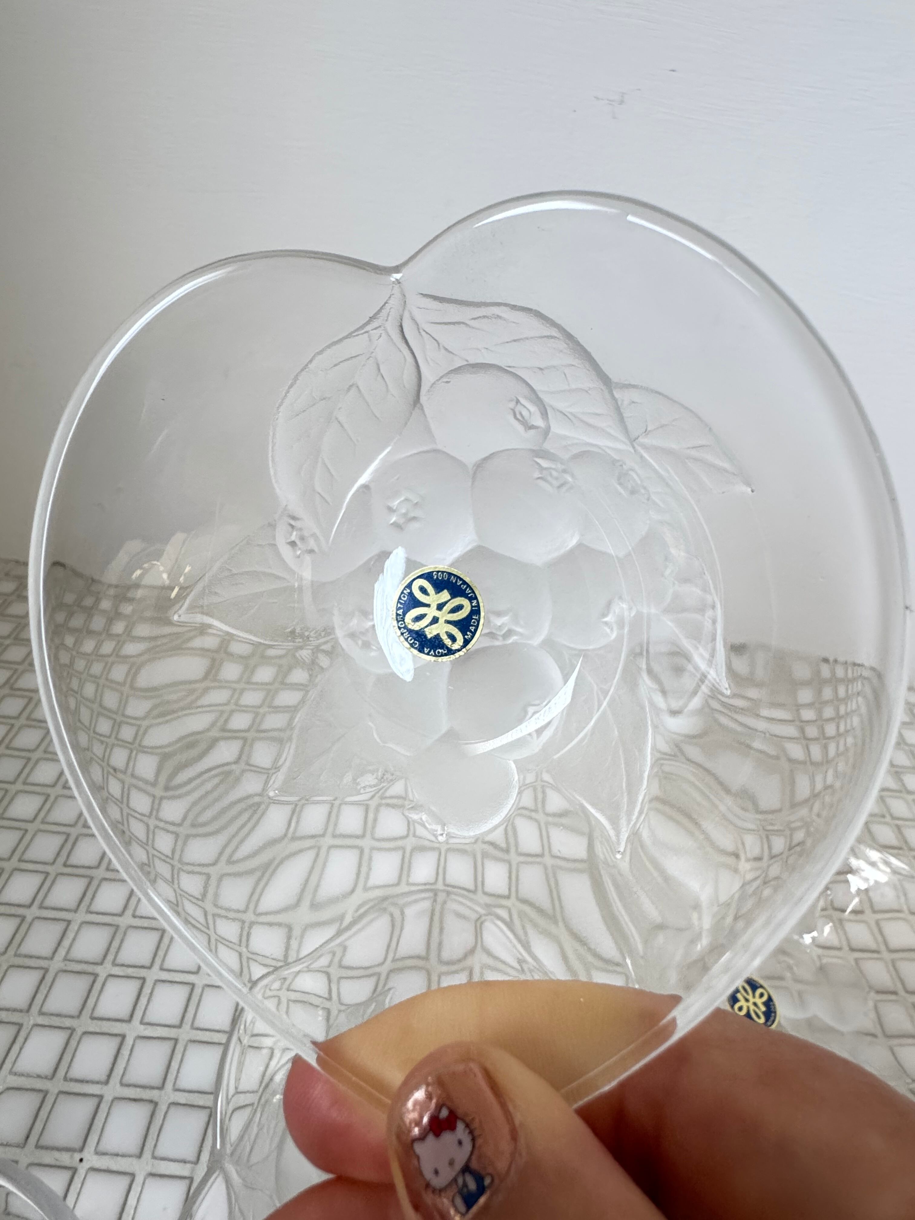 ブルーベリーの押し型が可愛い、HOYAクリスタルガラスの器。かたちもハート型で可愛いです。