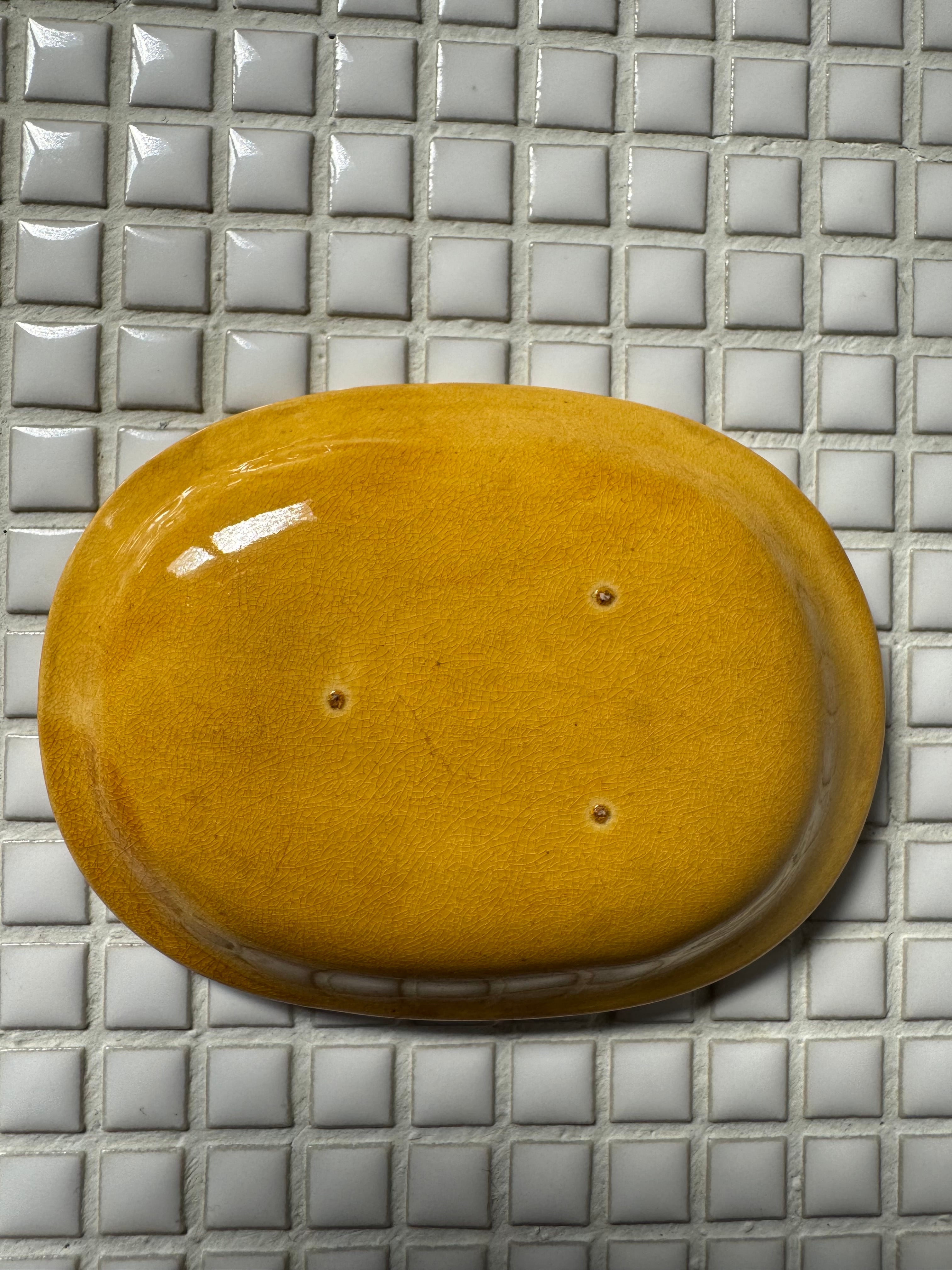 珉平焼 黄釉浮彫龍紋小判皿。