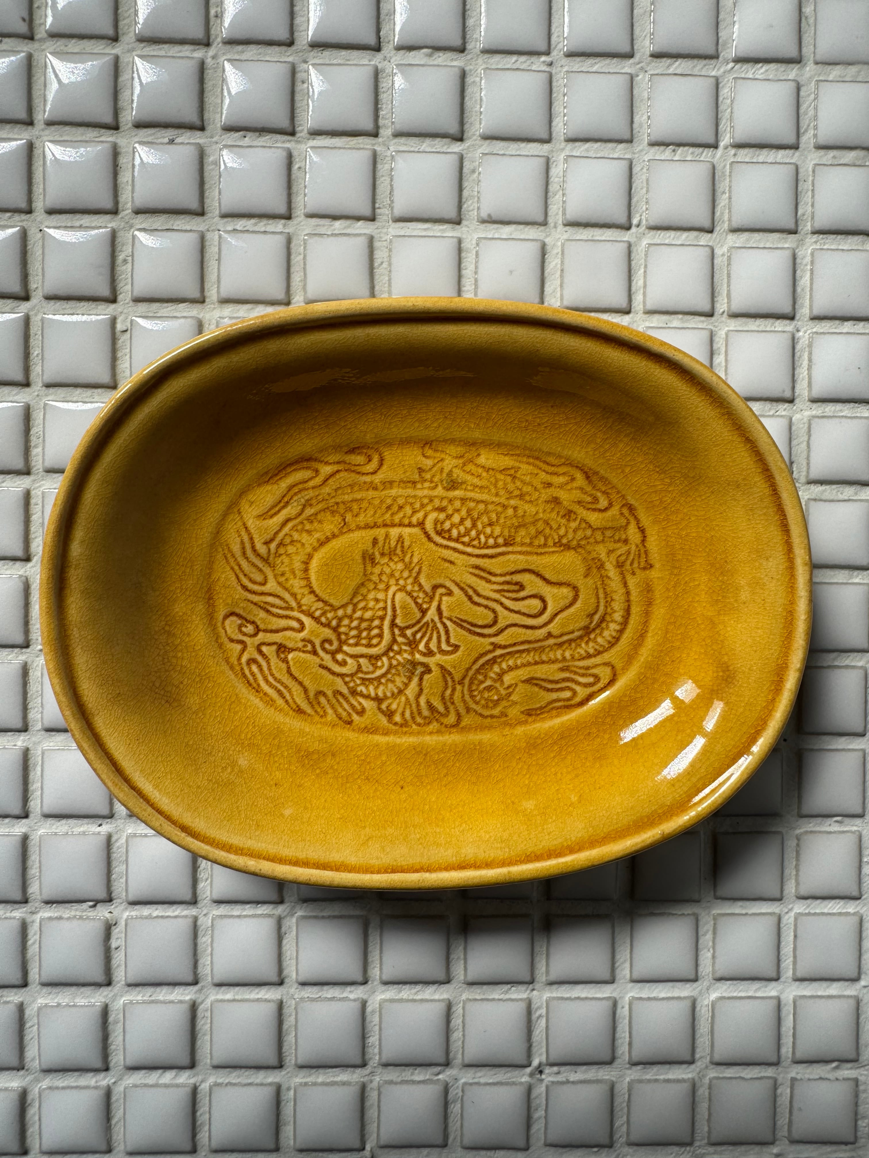 珉平焼 黄釉浮彫龍紋小判皿。