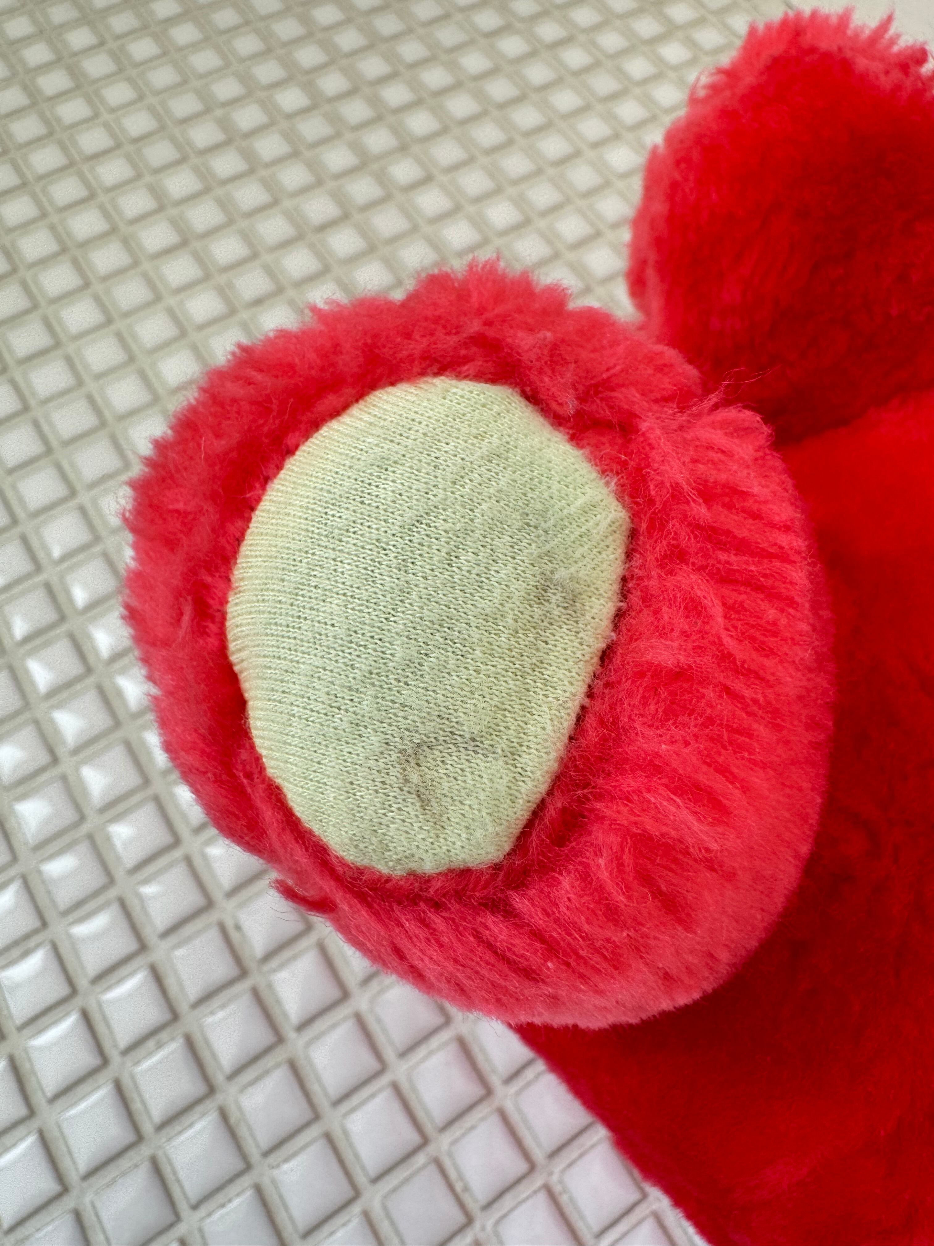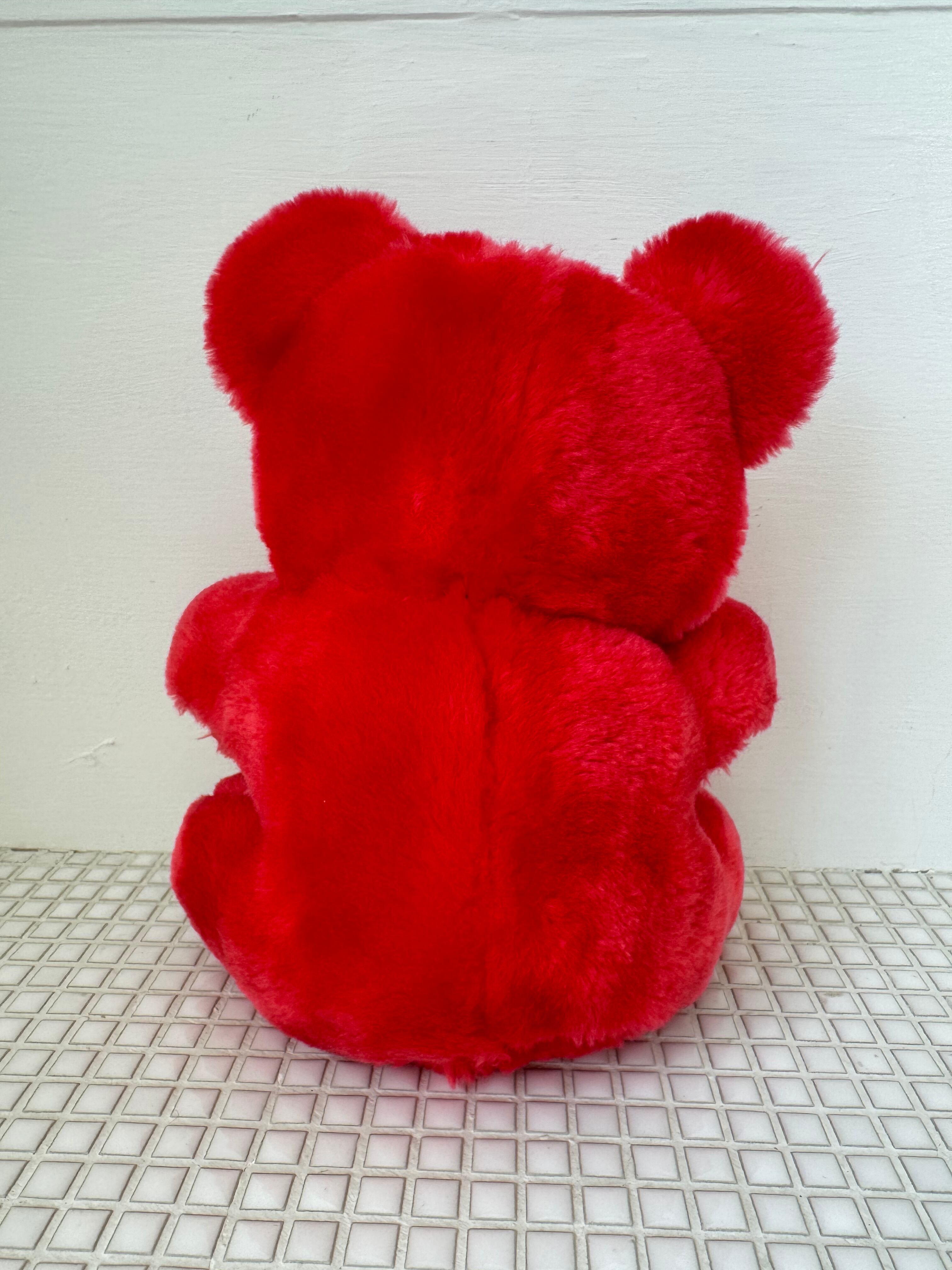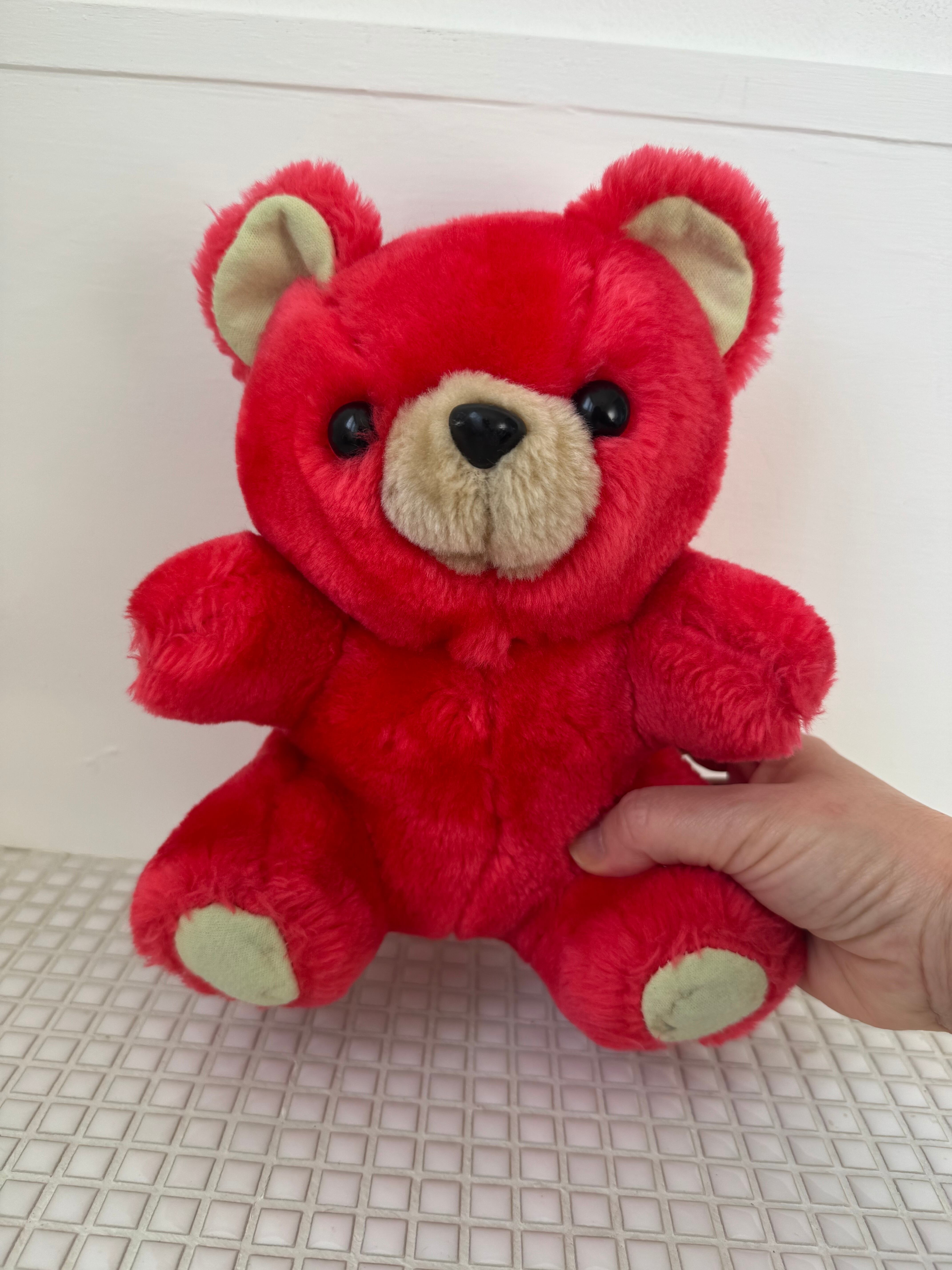 ちょっとネオンカラーチックな赤色が可愛いくまのぬいぐるみ。