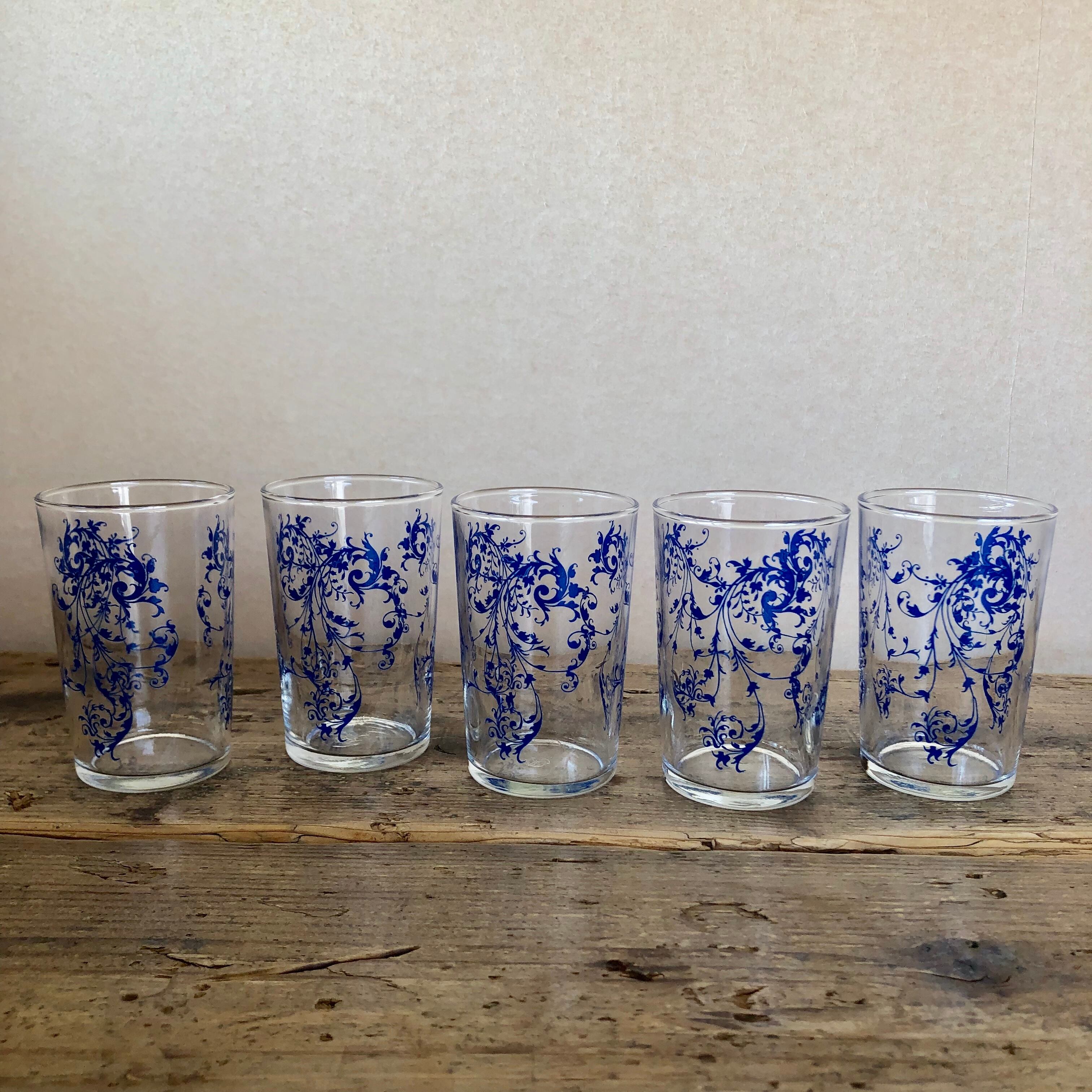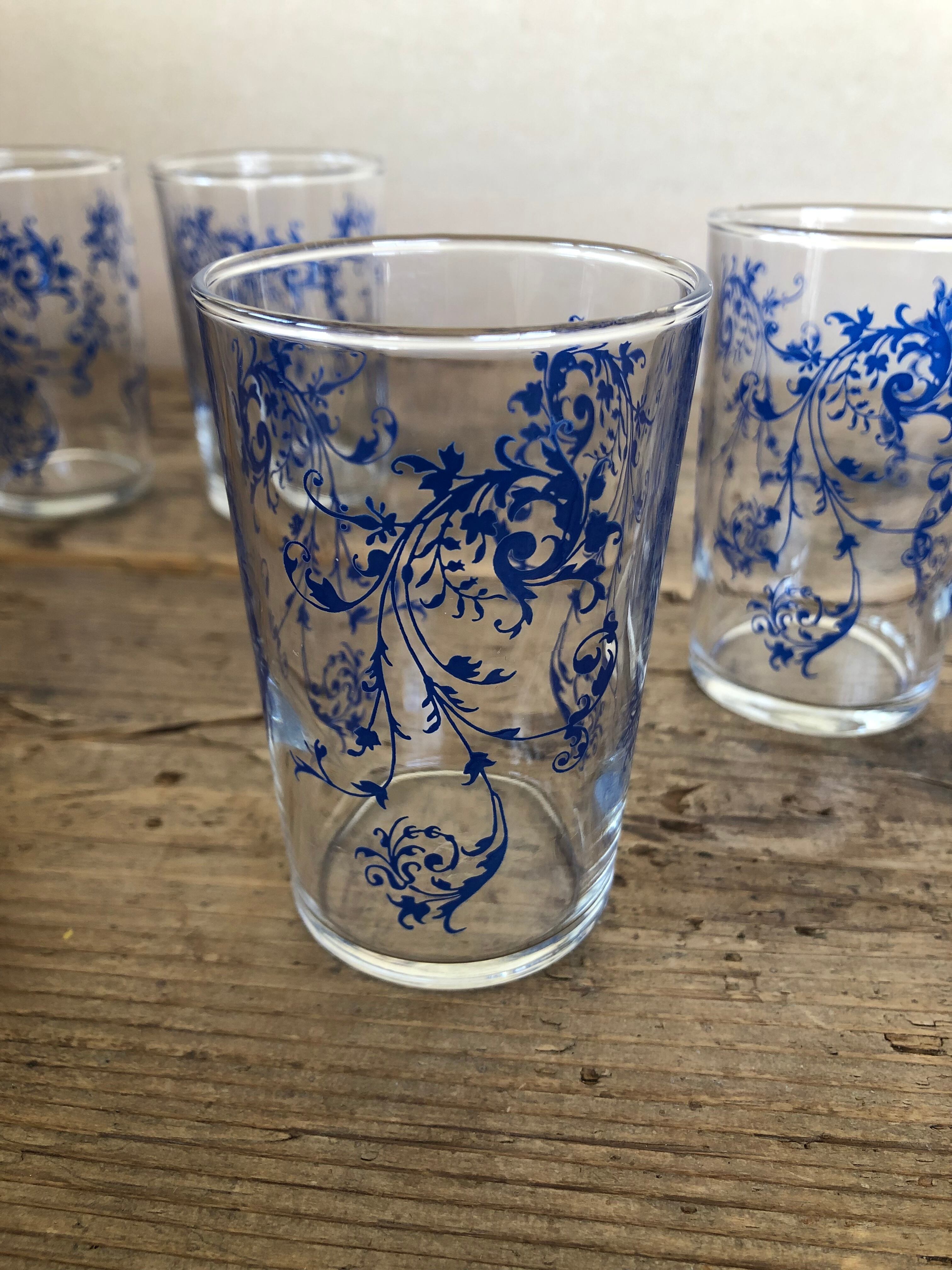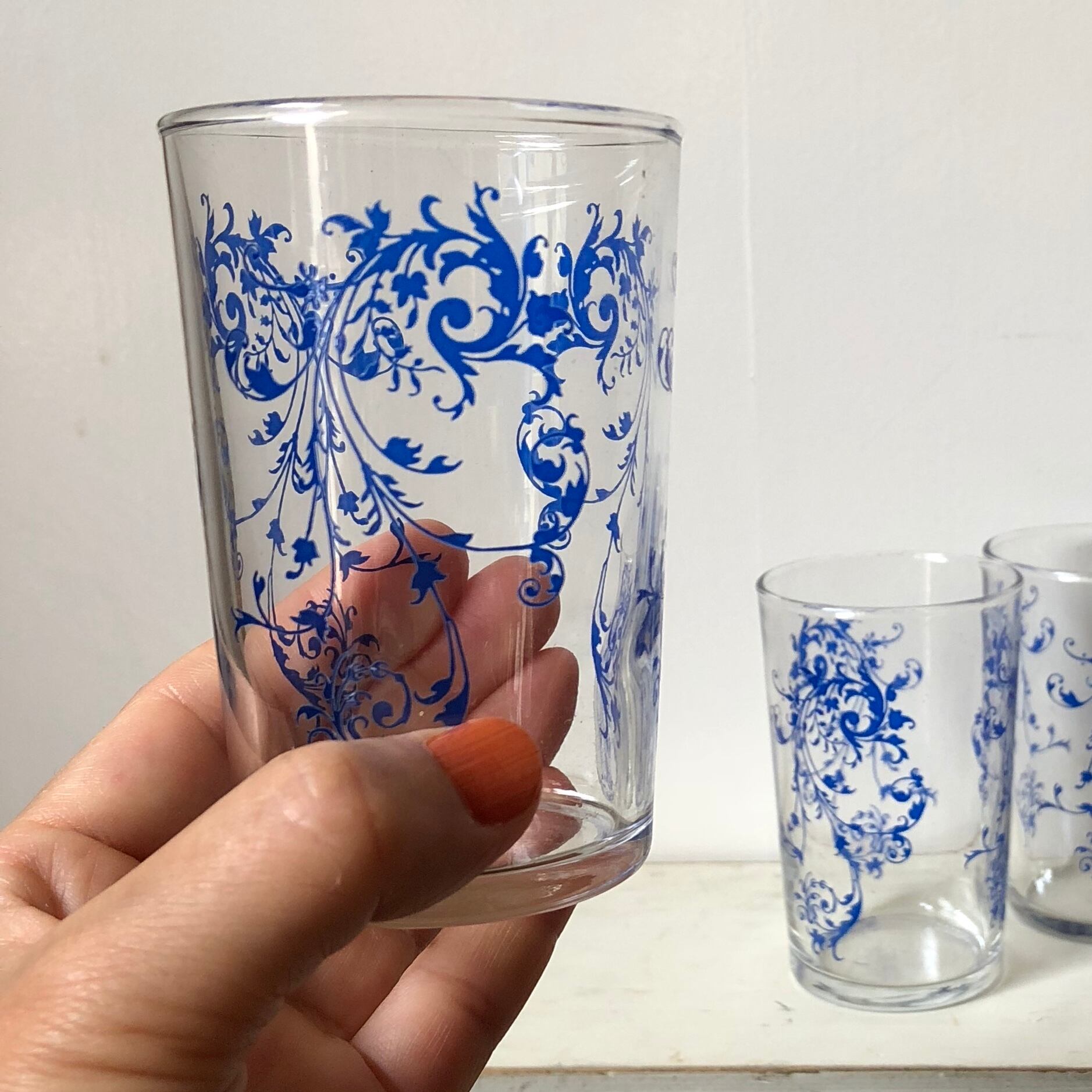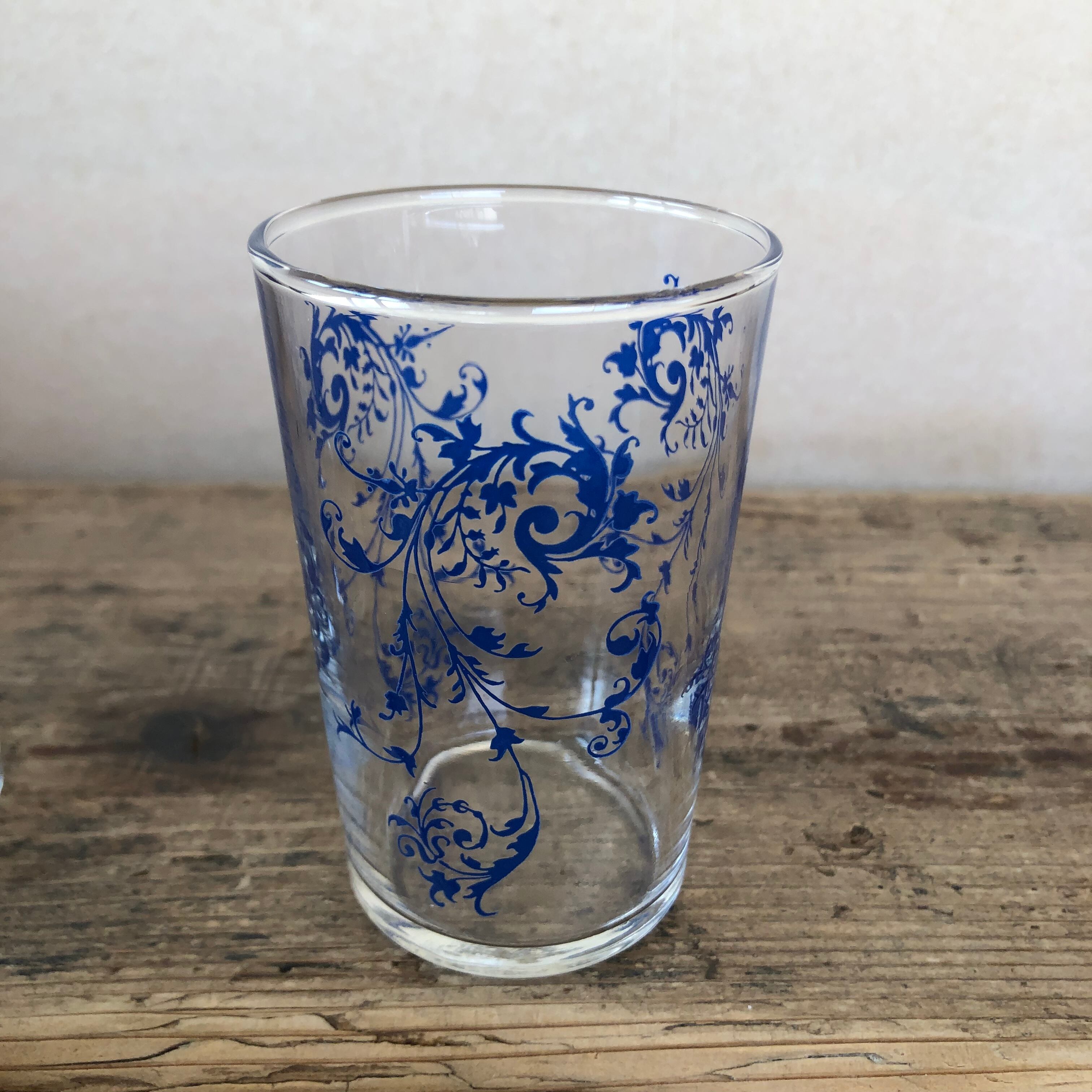 アラベスク調の葉っぱ模様が可愛いガラスコップ。ブルーの模様で爽やかです。