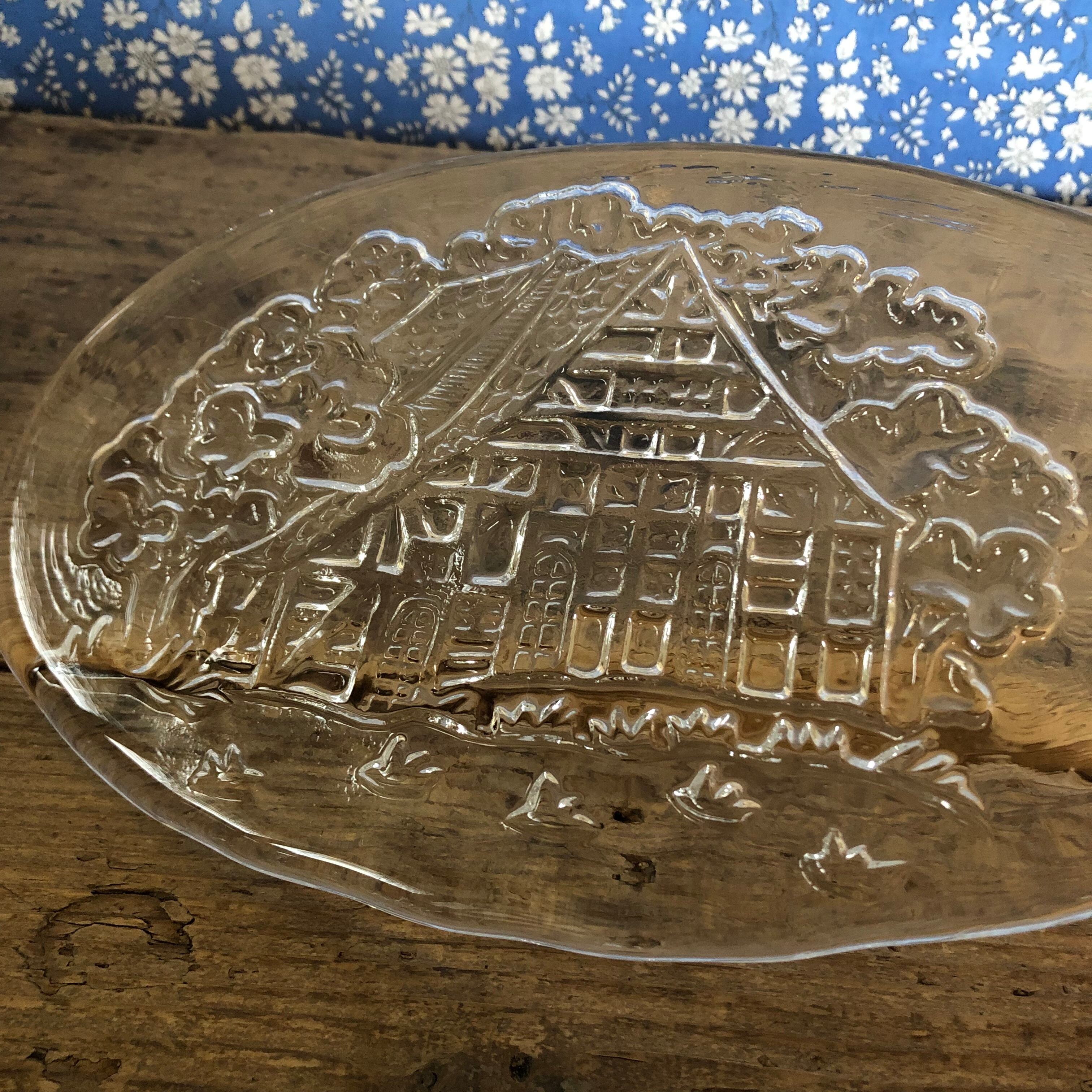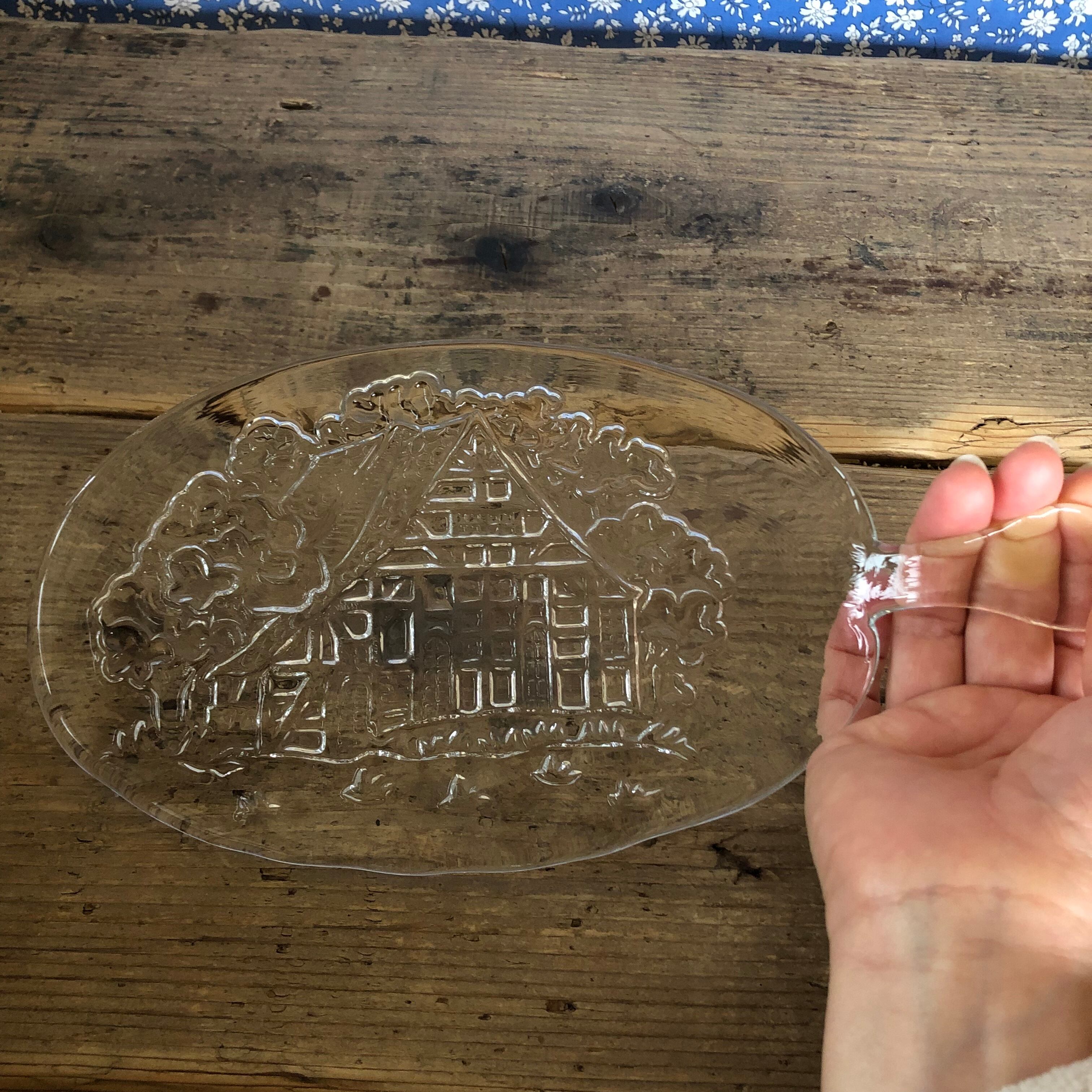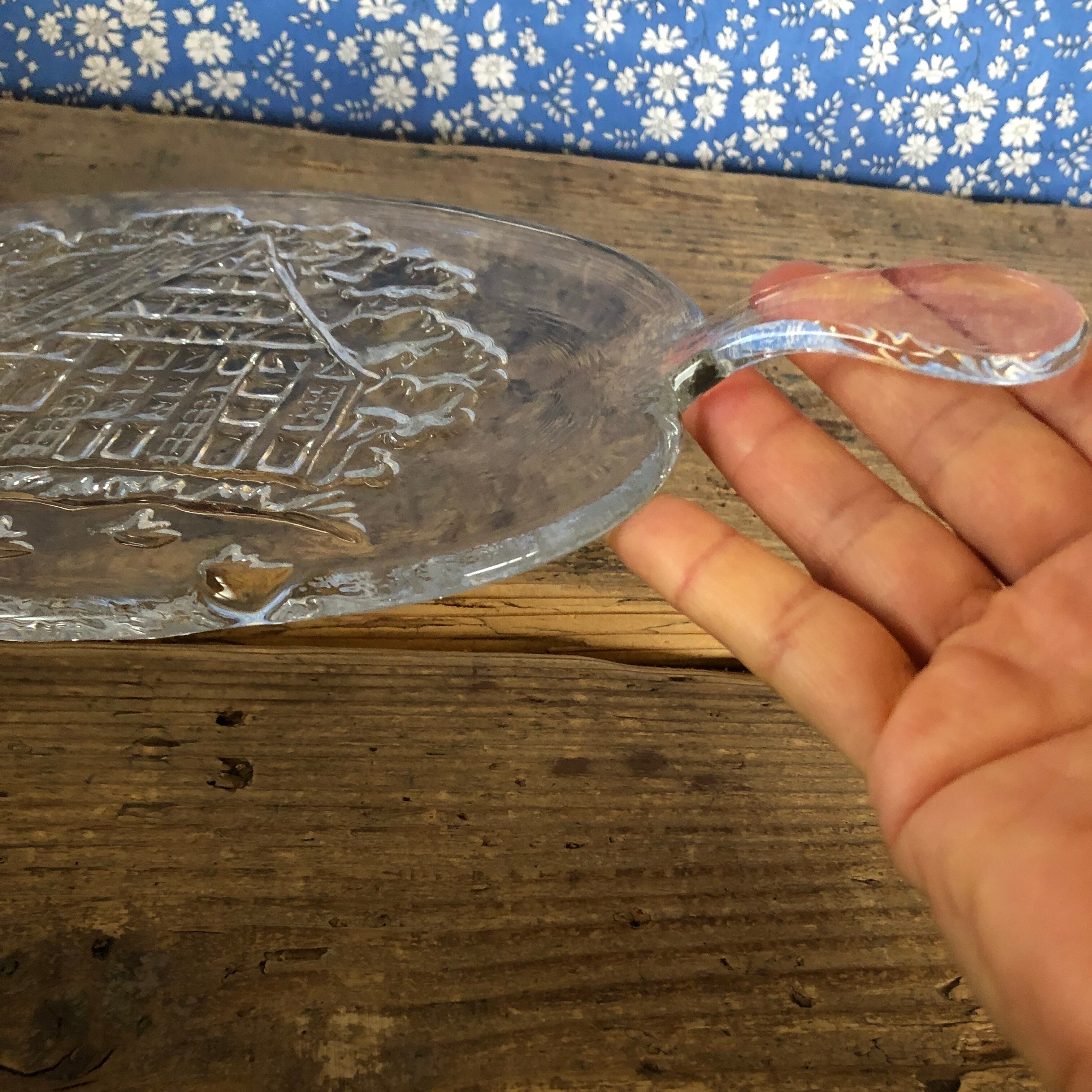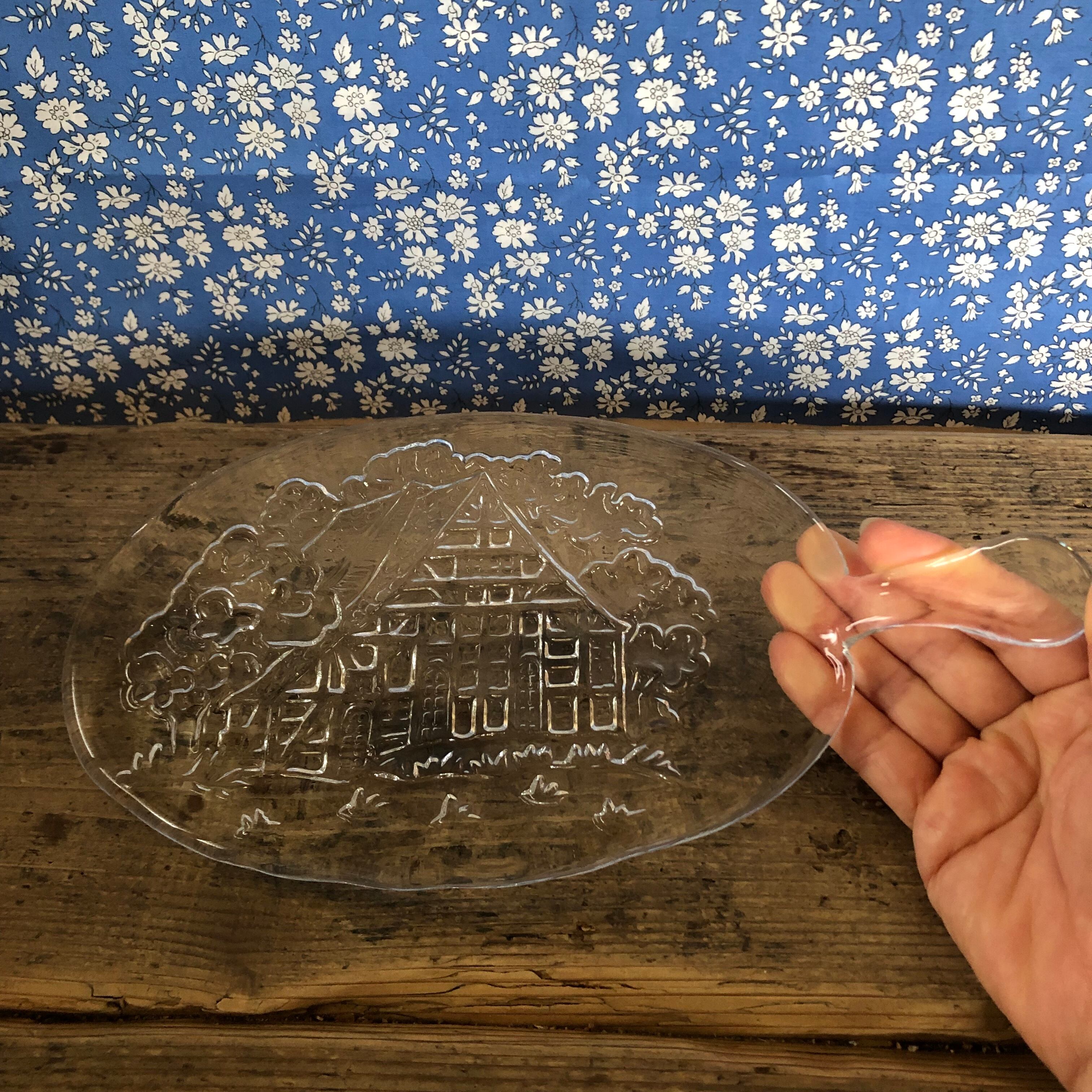 森の中に佇むおうちがデザインされた可愛いガラスプレート。裏面に型押しされた創りになっています。