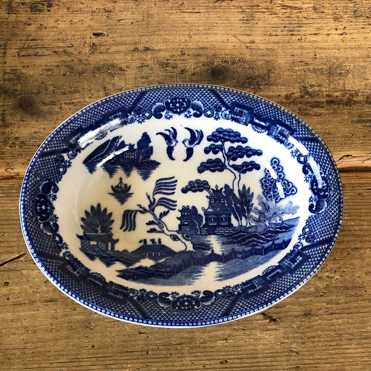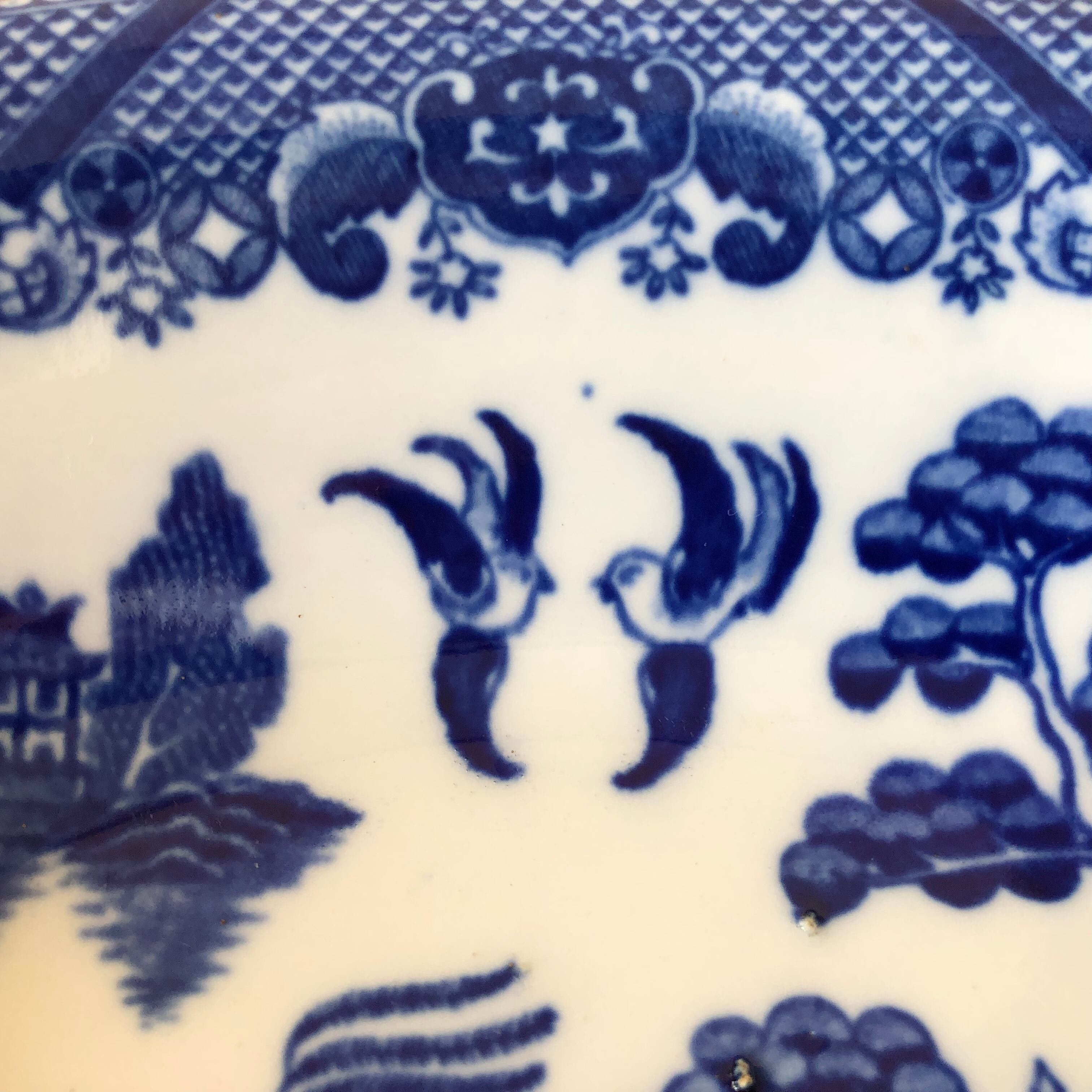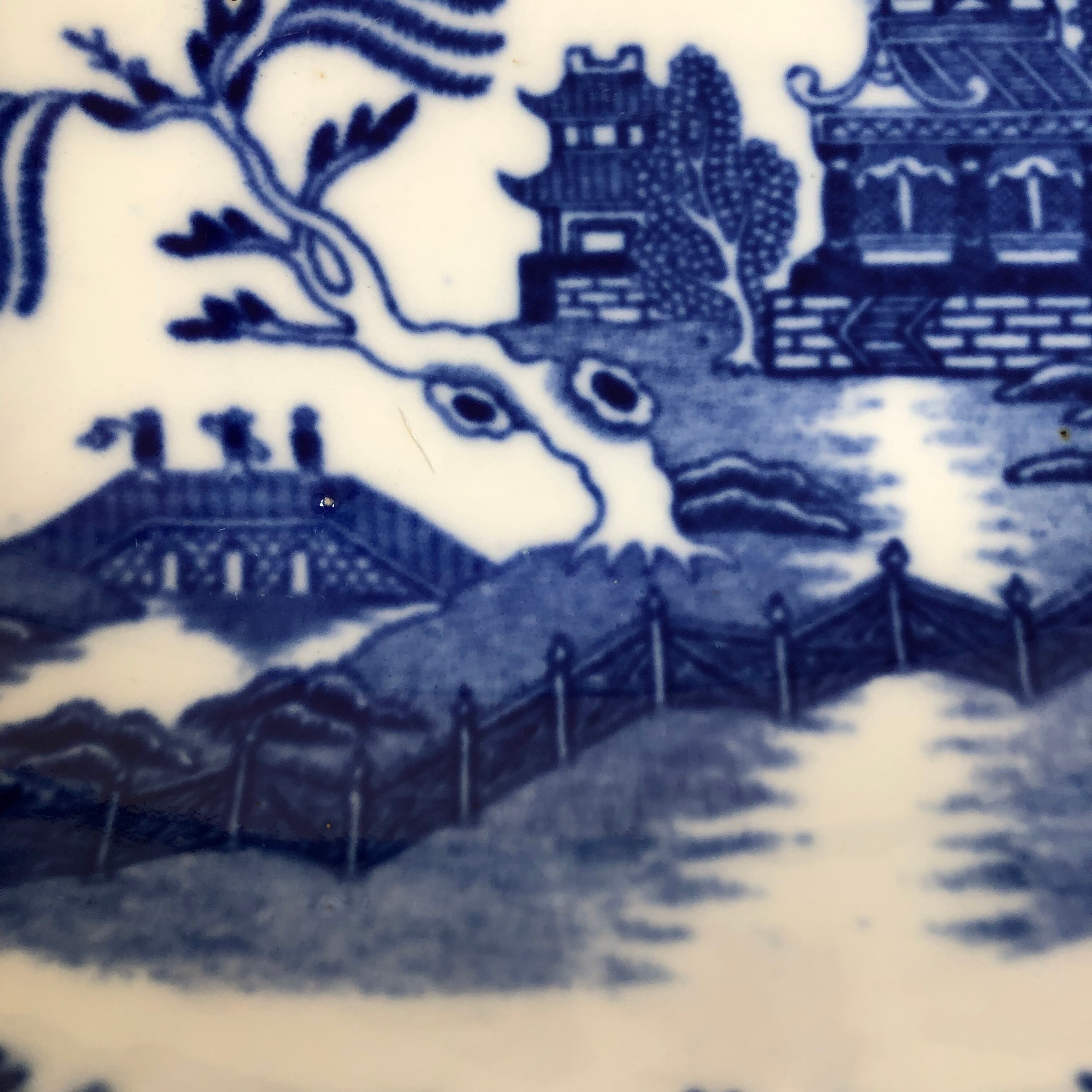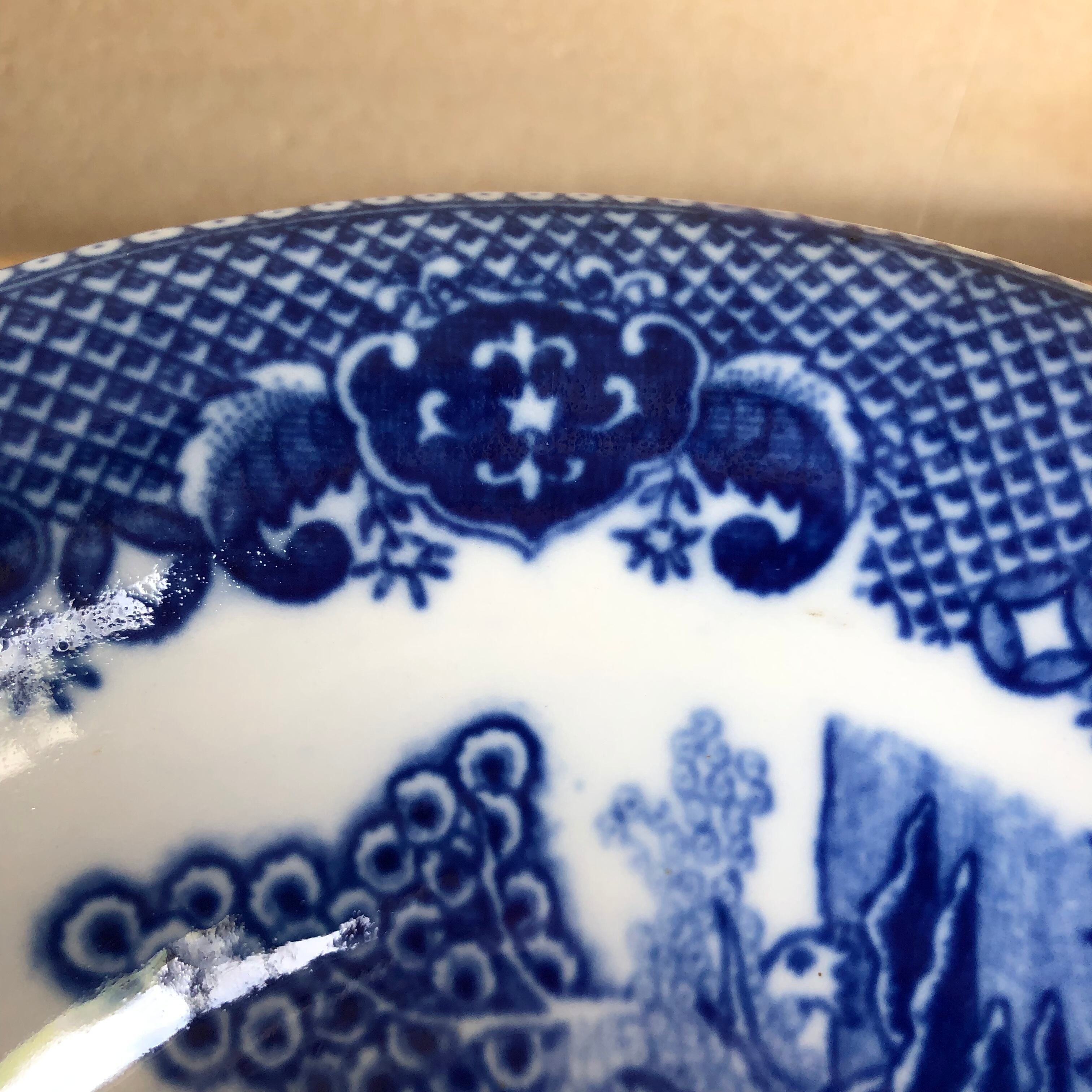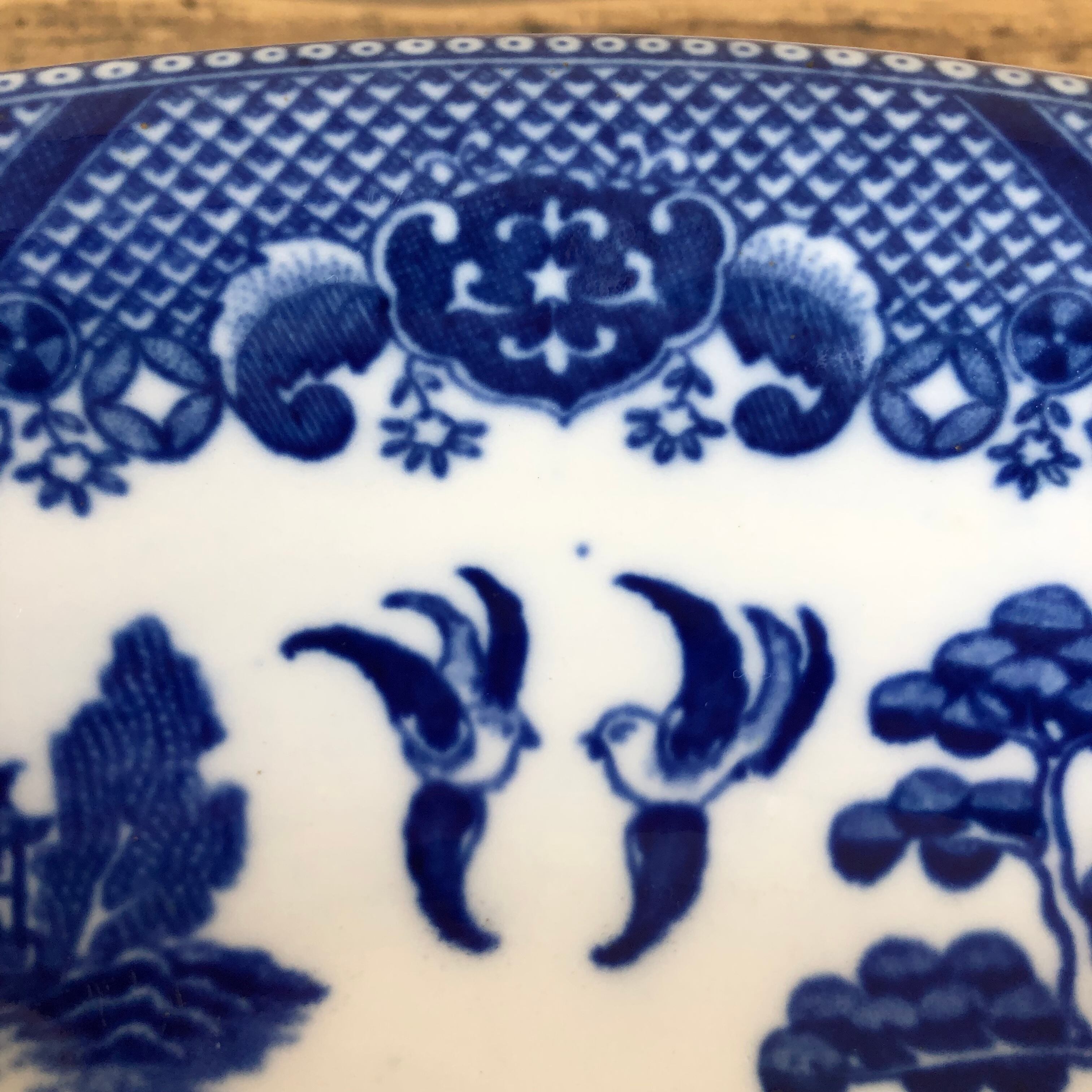 二羽の鳥や、柳の木、橋を渡る3人の人物、大きなお屋敷が印象的に描かれたお皿です。