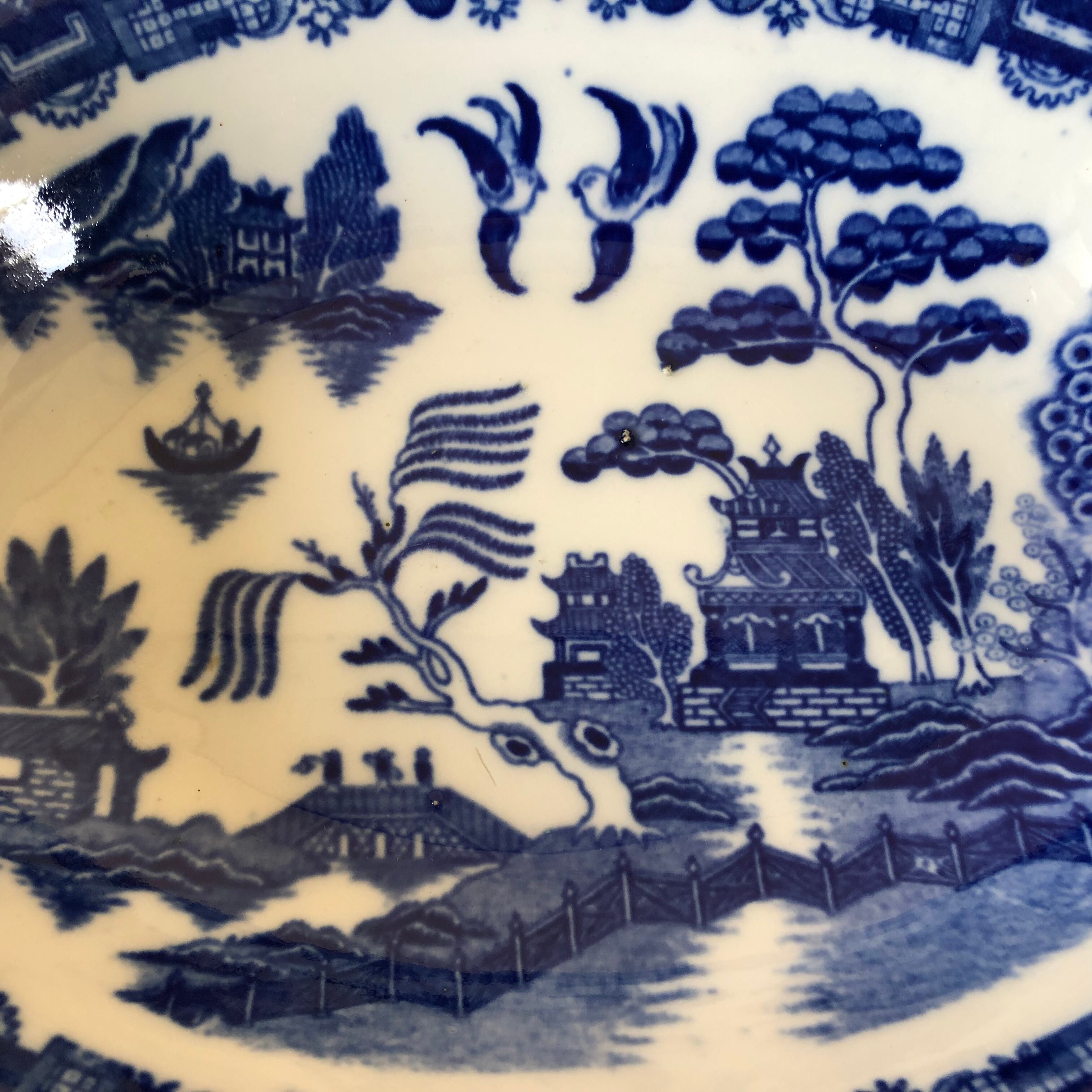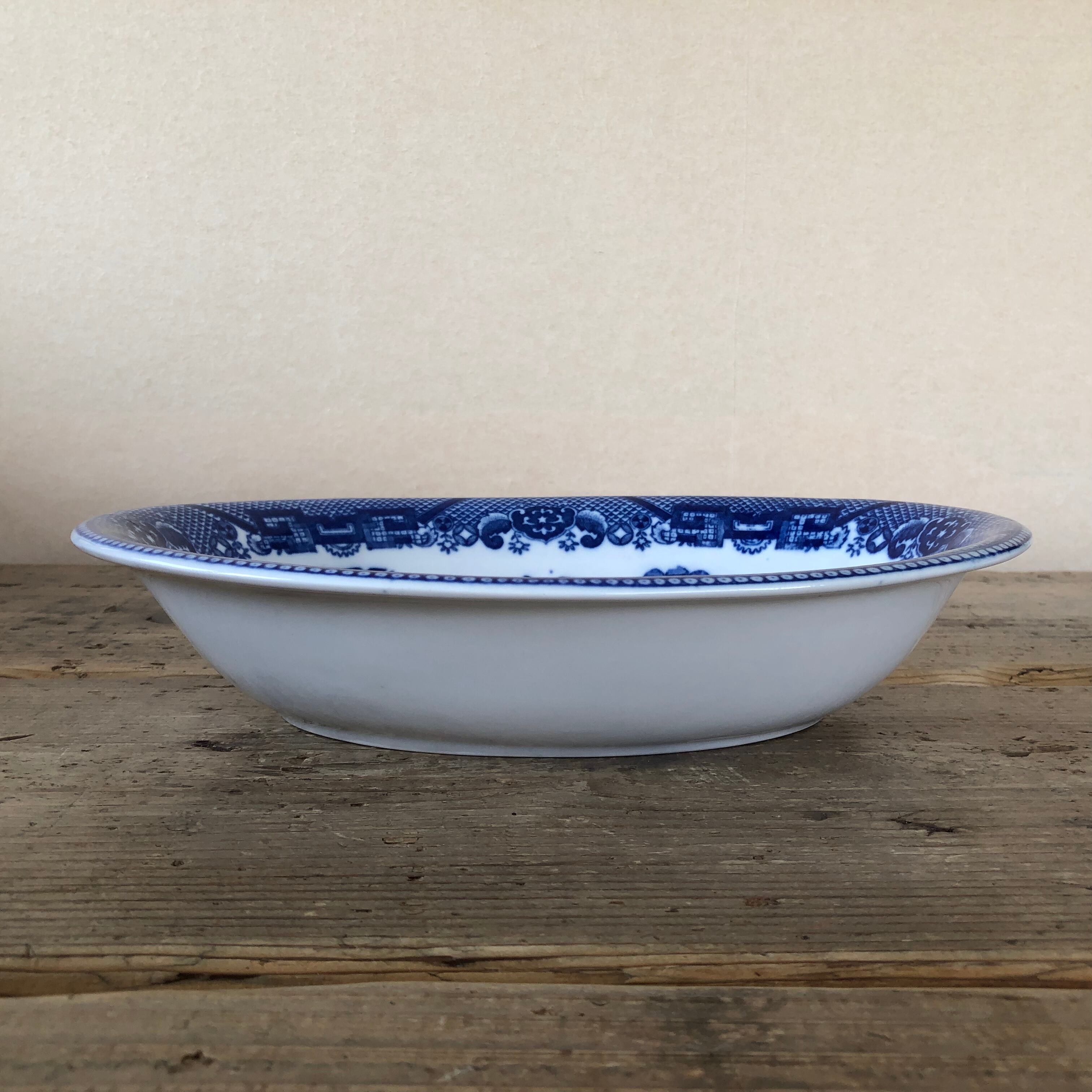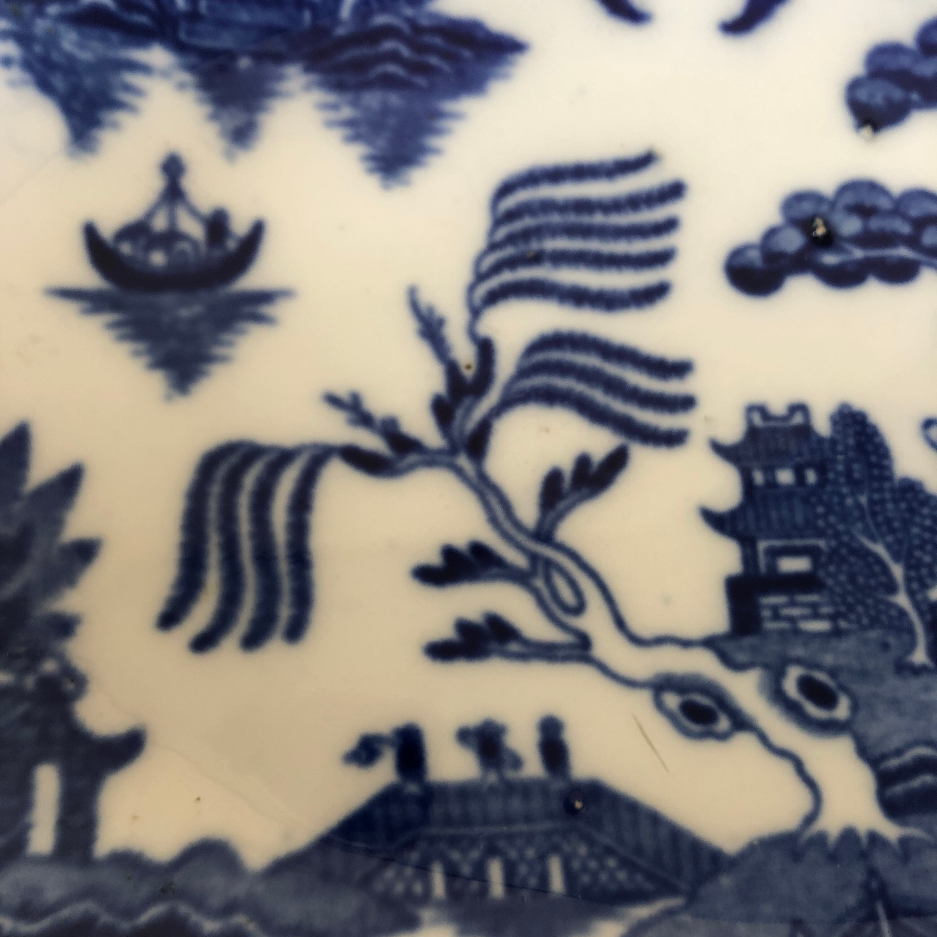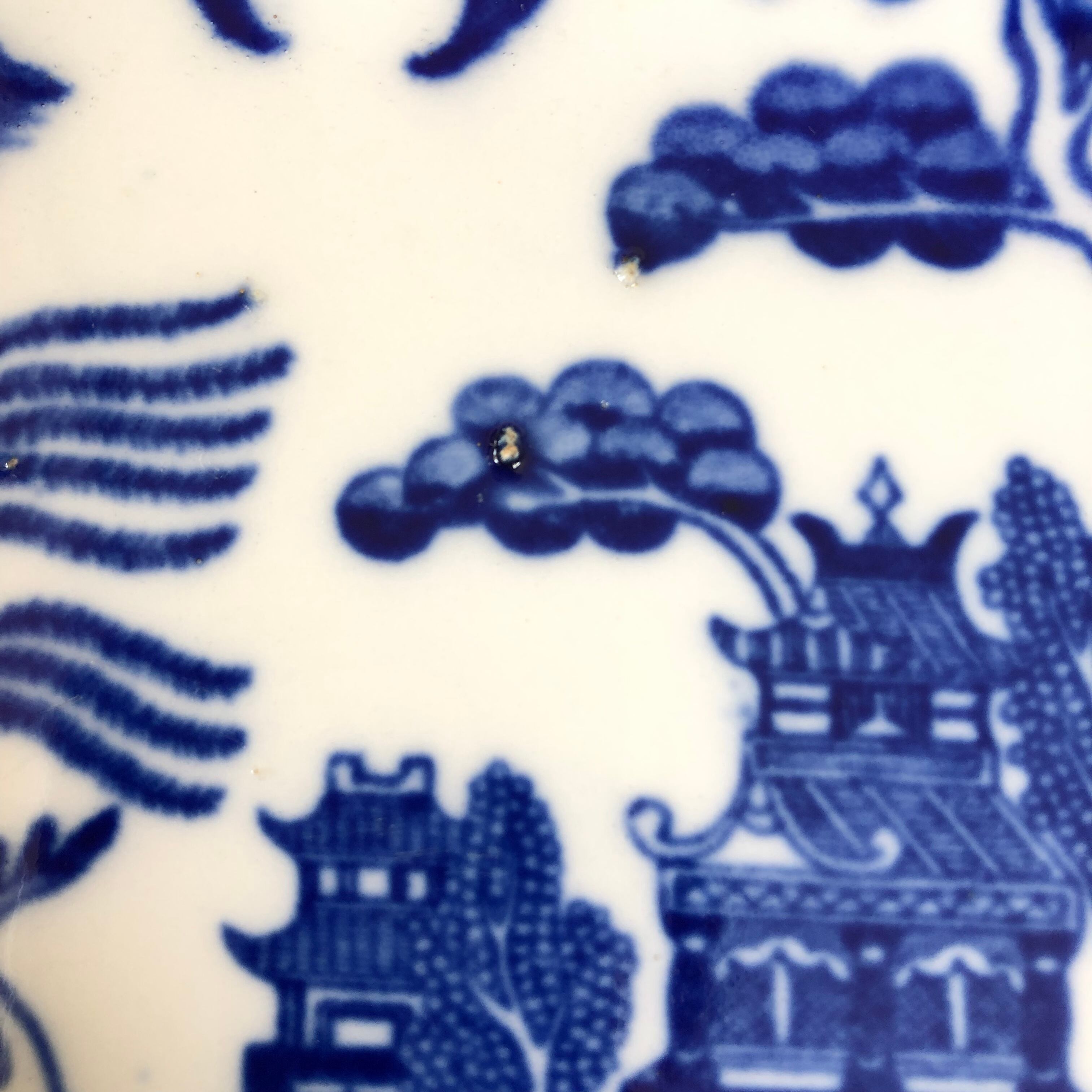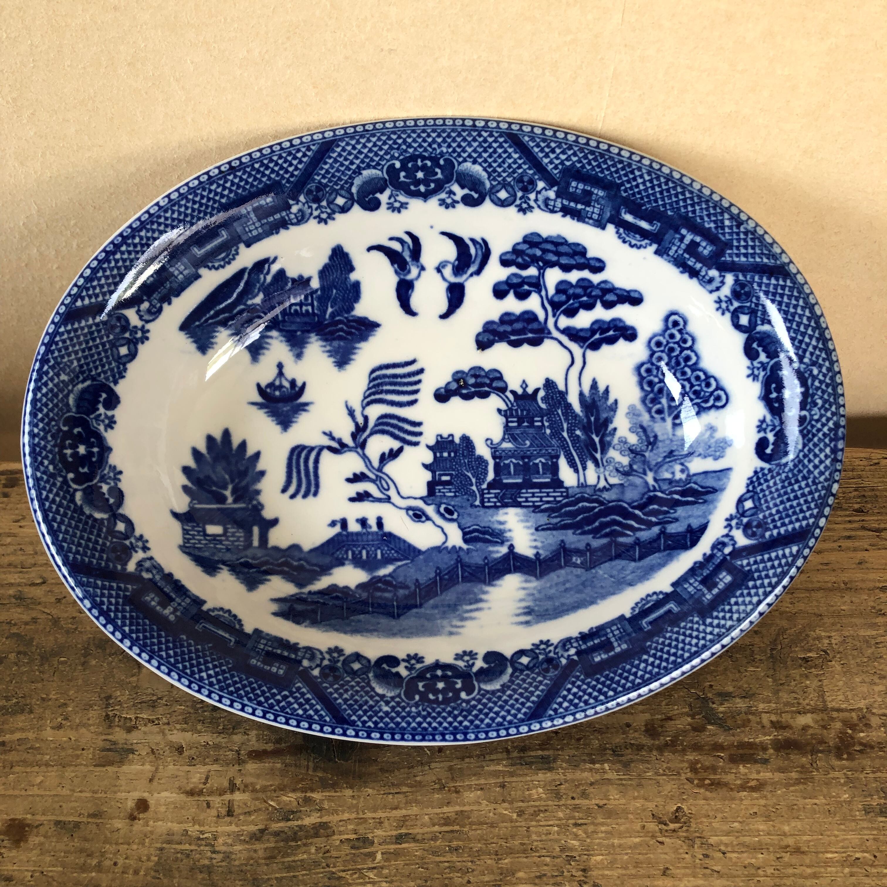 二羽の鳥や、柳の木、橋を渡る3人の人物、大きなお屋敷が印象的に描かれたお皿です。