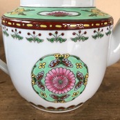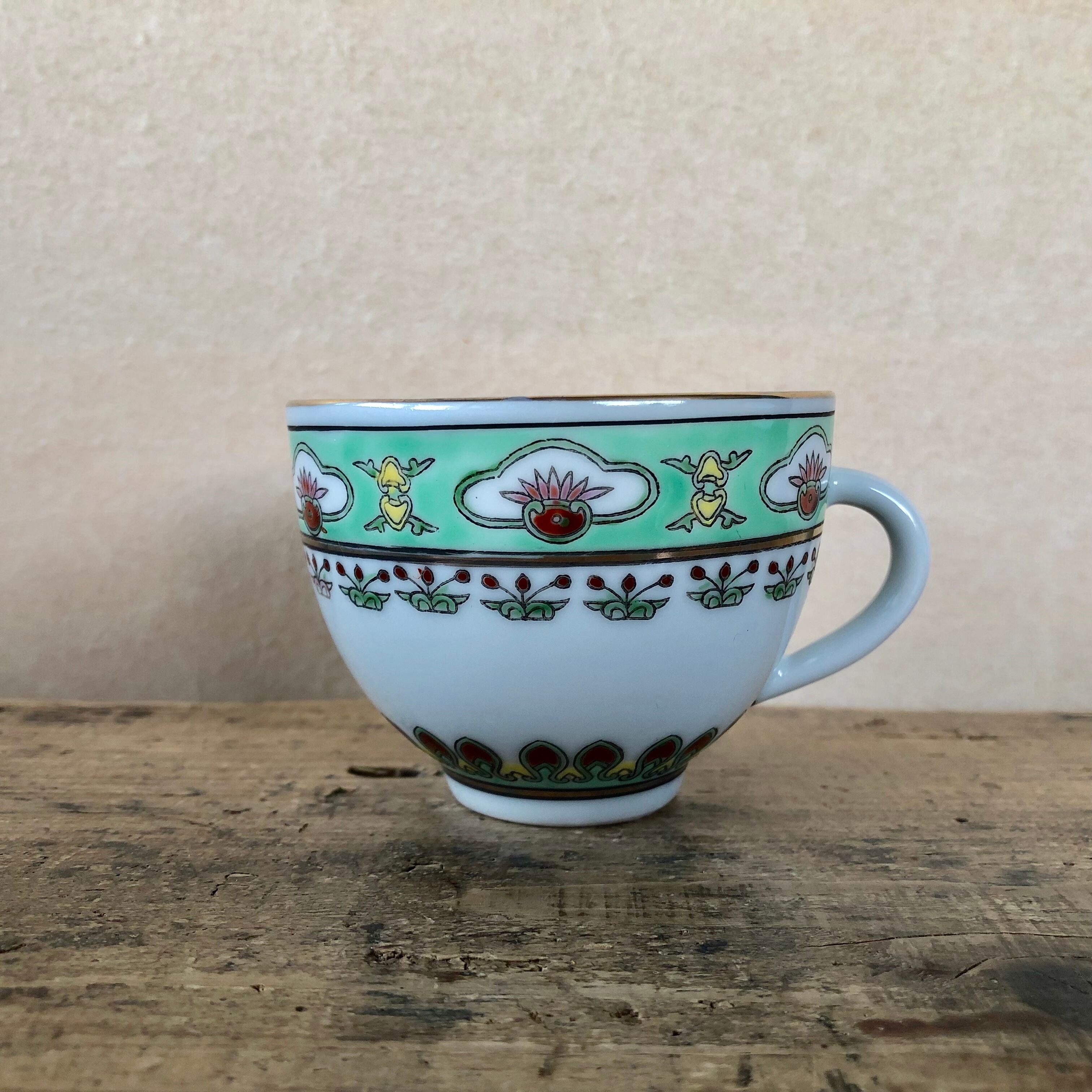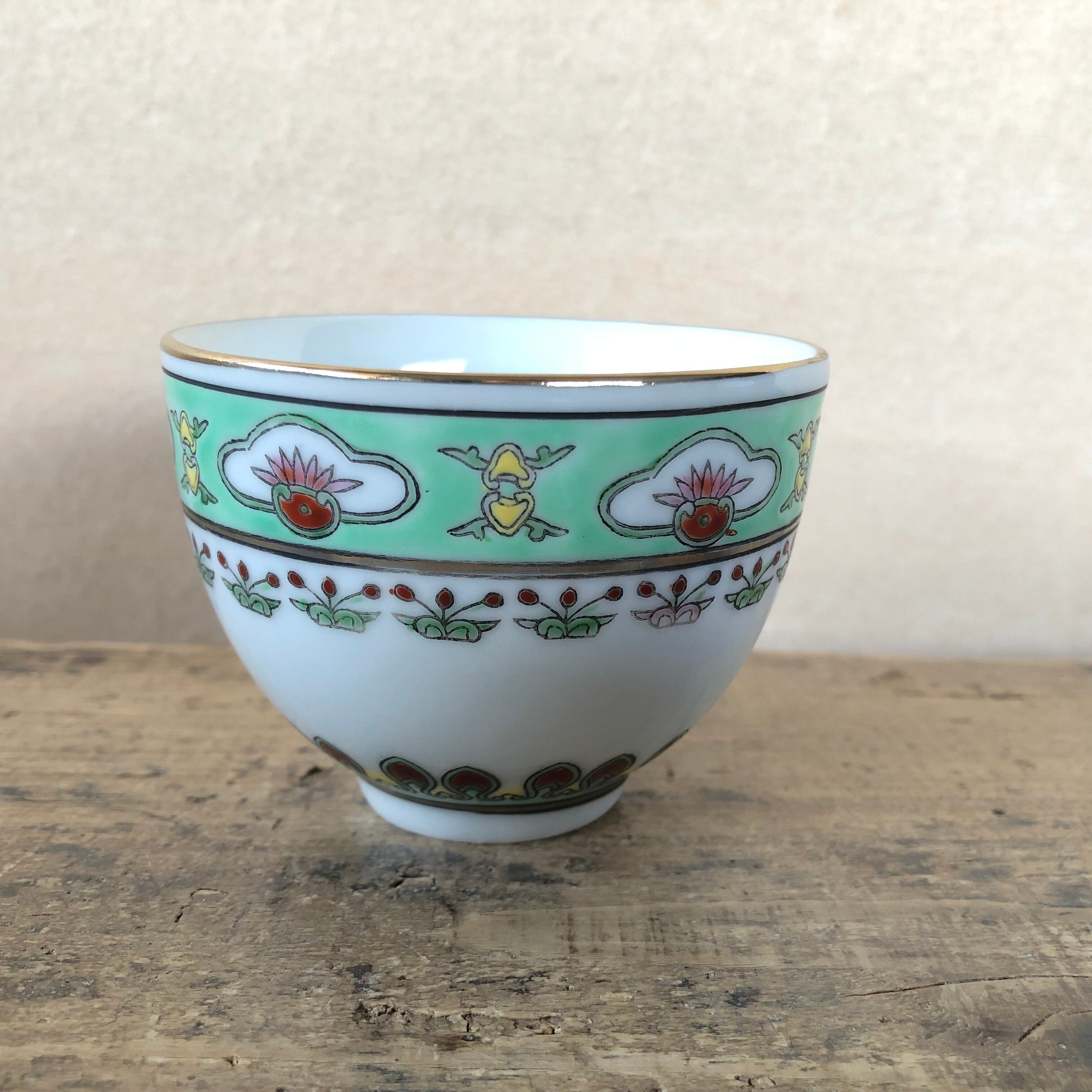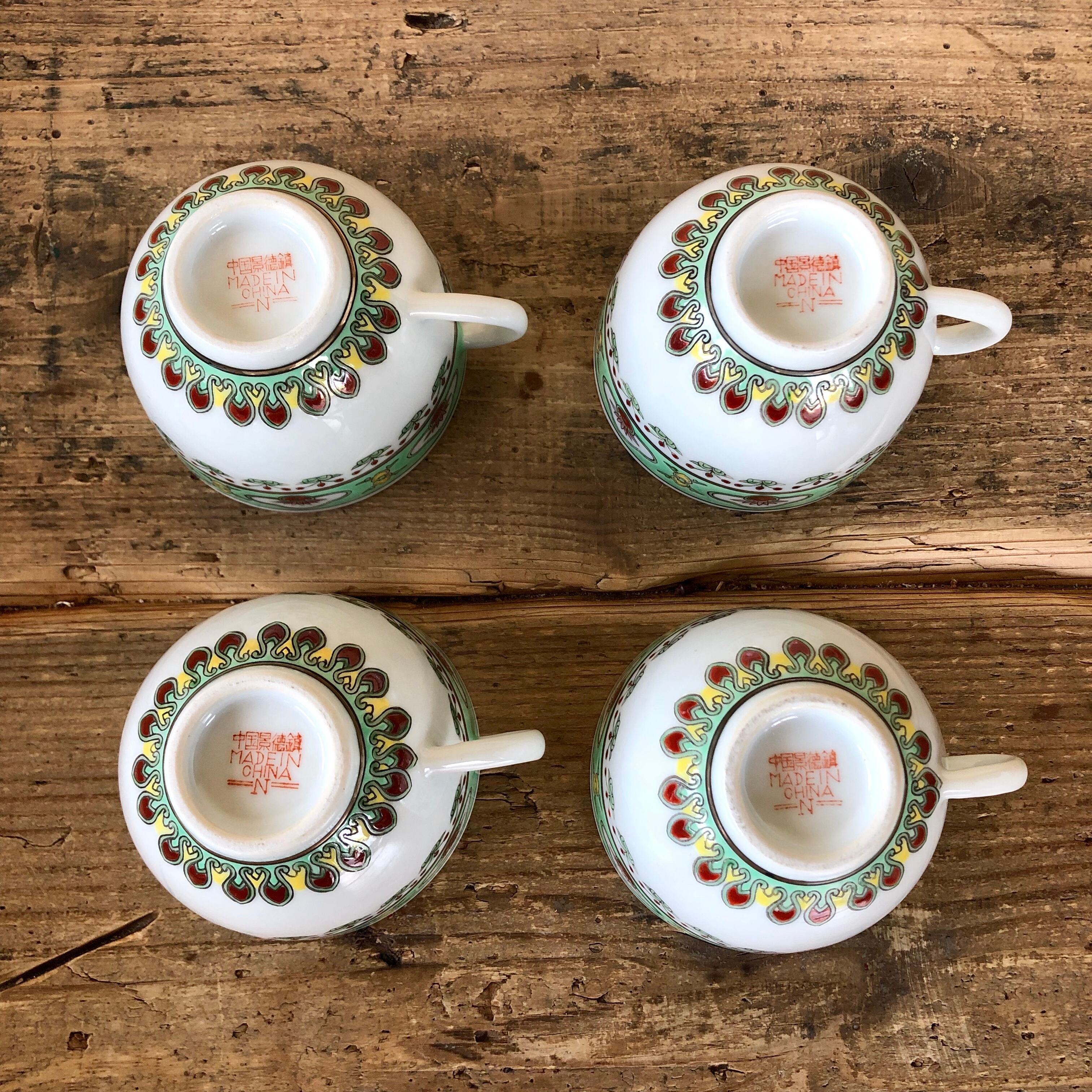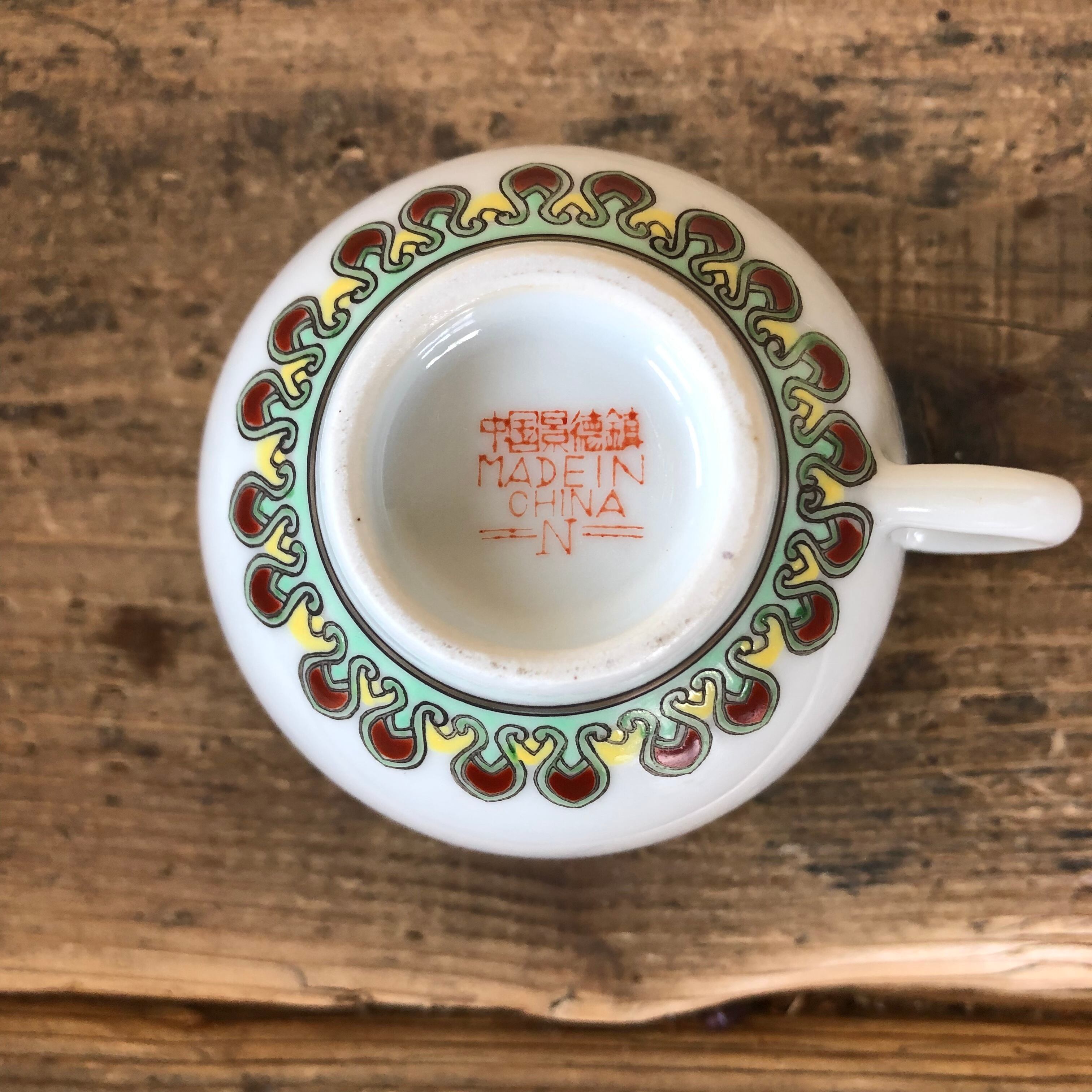 景徳鎮と言えば、白とブルーの物や、黄色の物、赤の物を良く見かけますが、こちらのセットの柄はあまり見かけない柄だと思います。