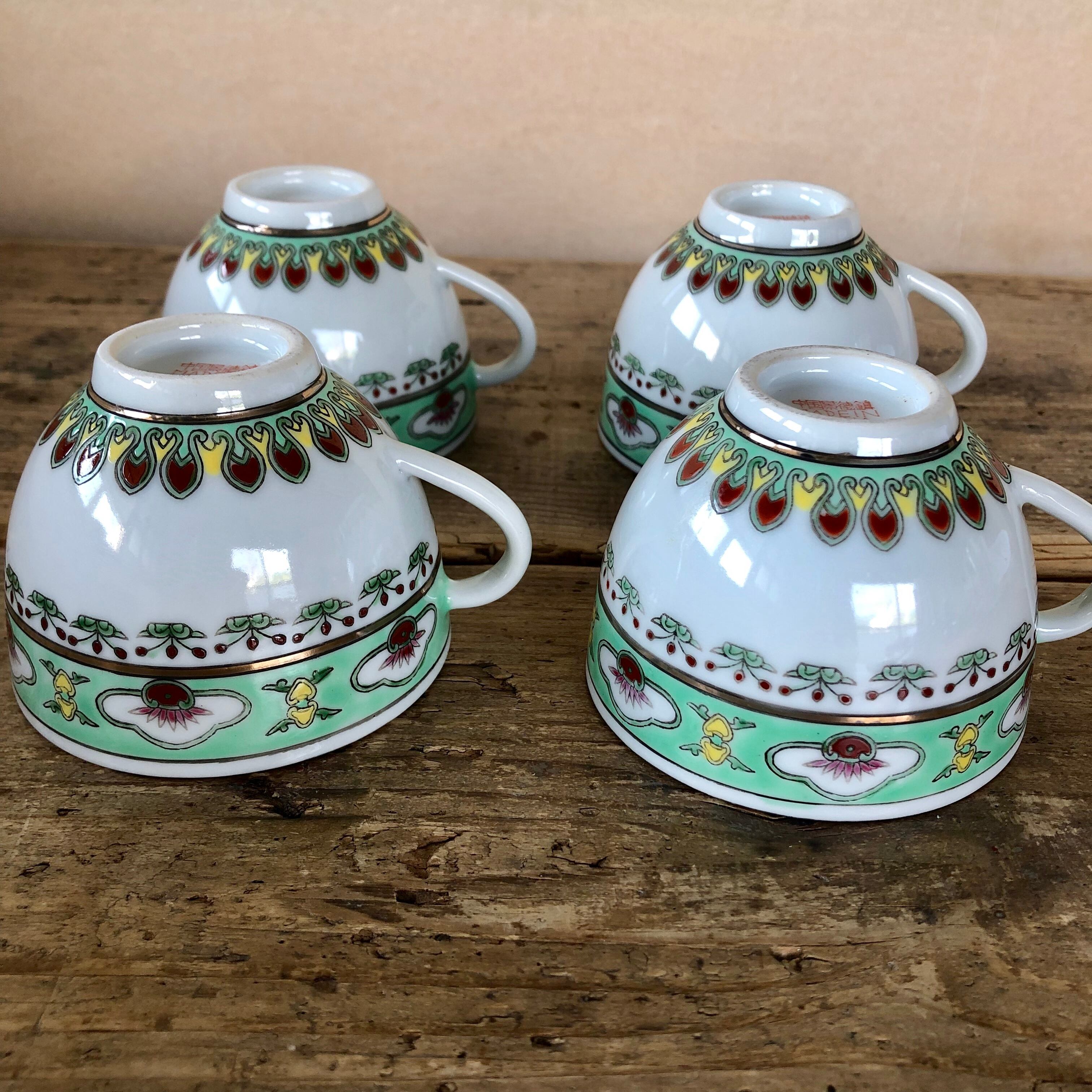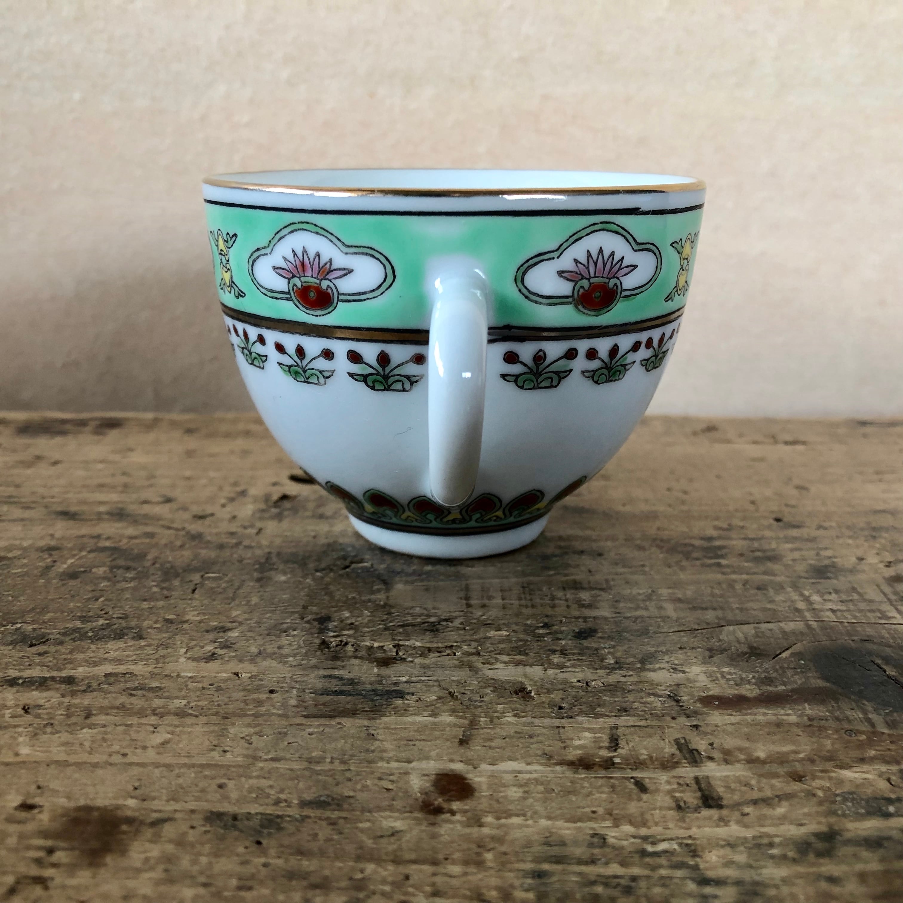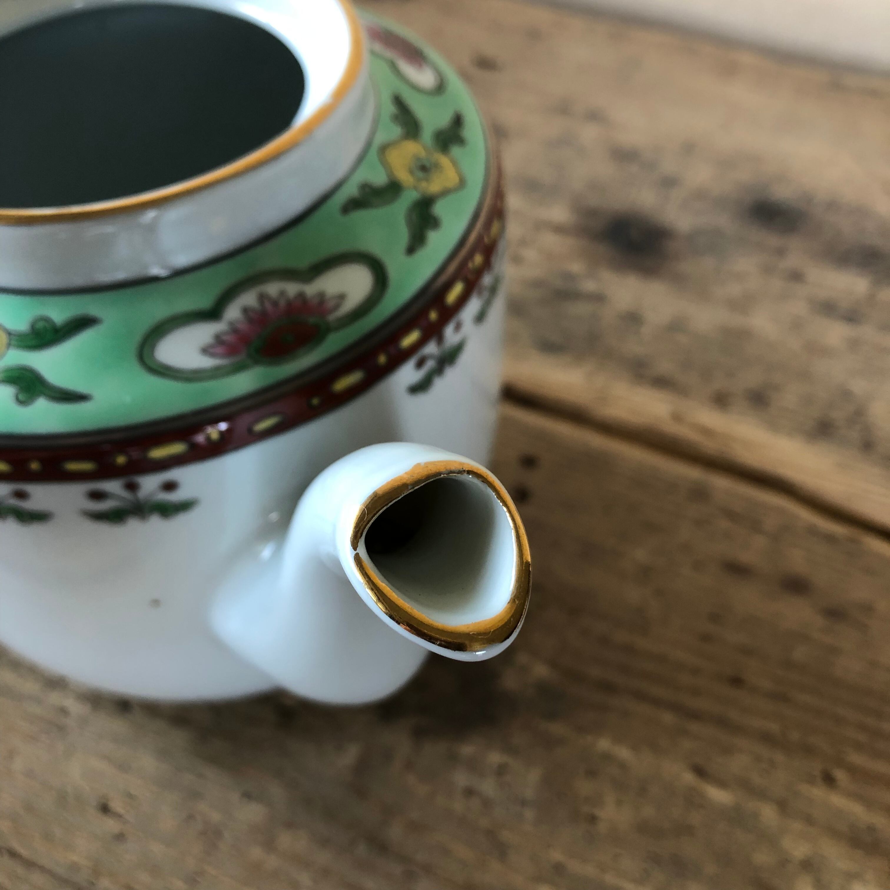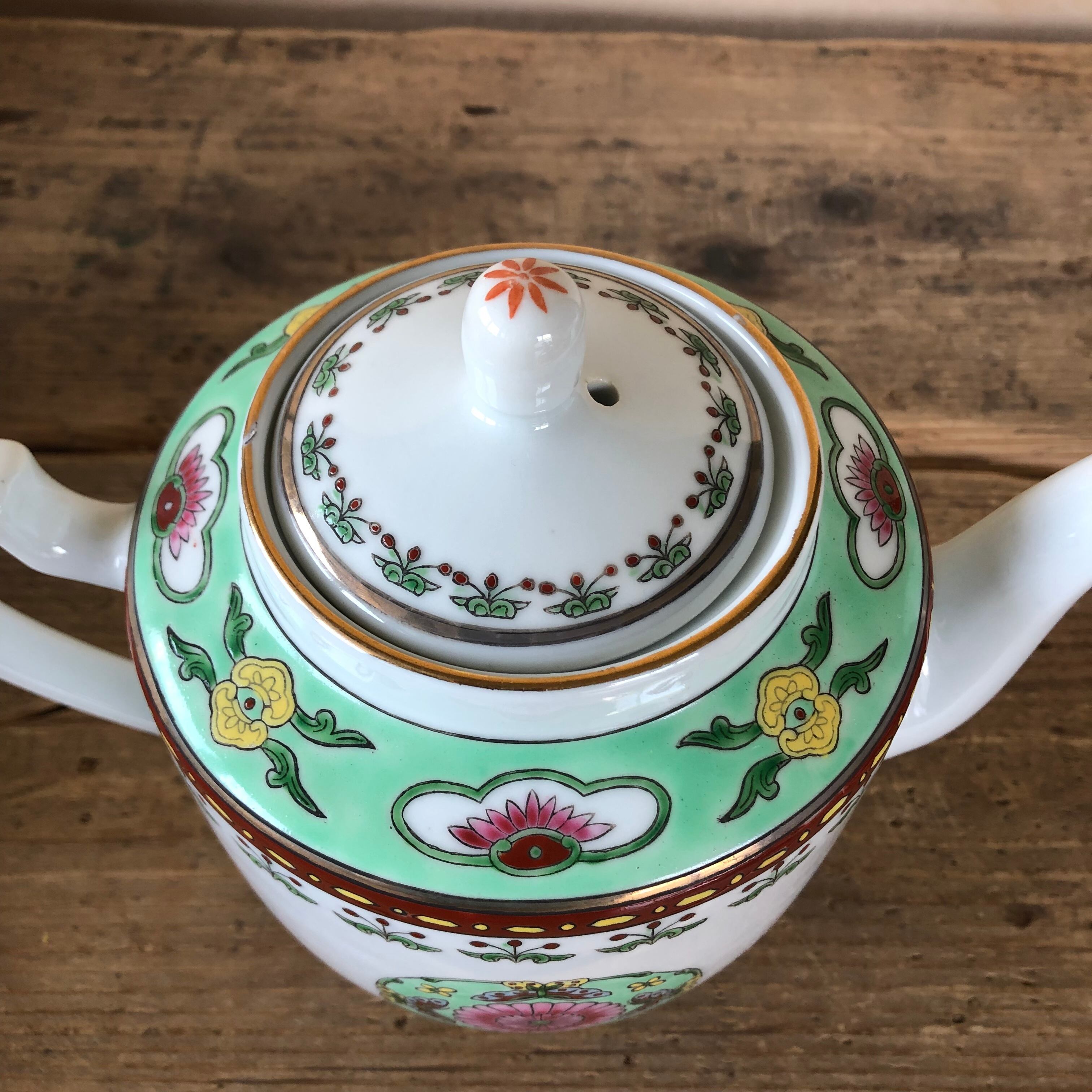 景徳鎮と言えば、白とブルーの物や、黄色の物、赤の物を良く見かけますが、こちらのセットの柄はあまり見かけない柄だと思います。