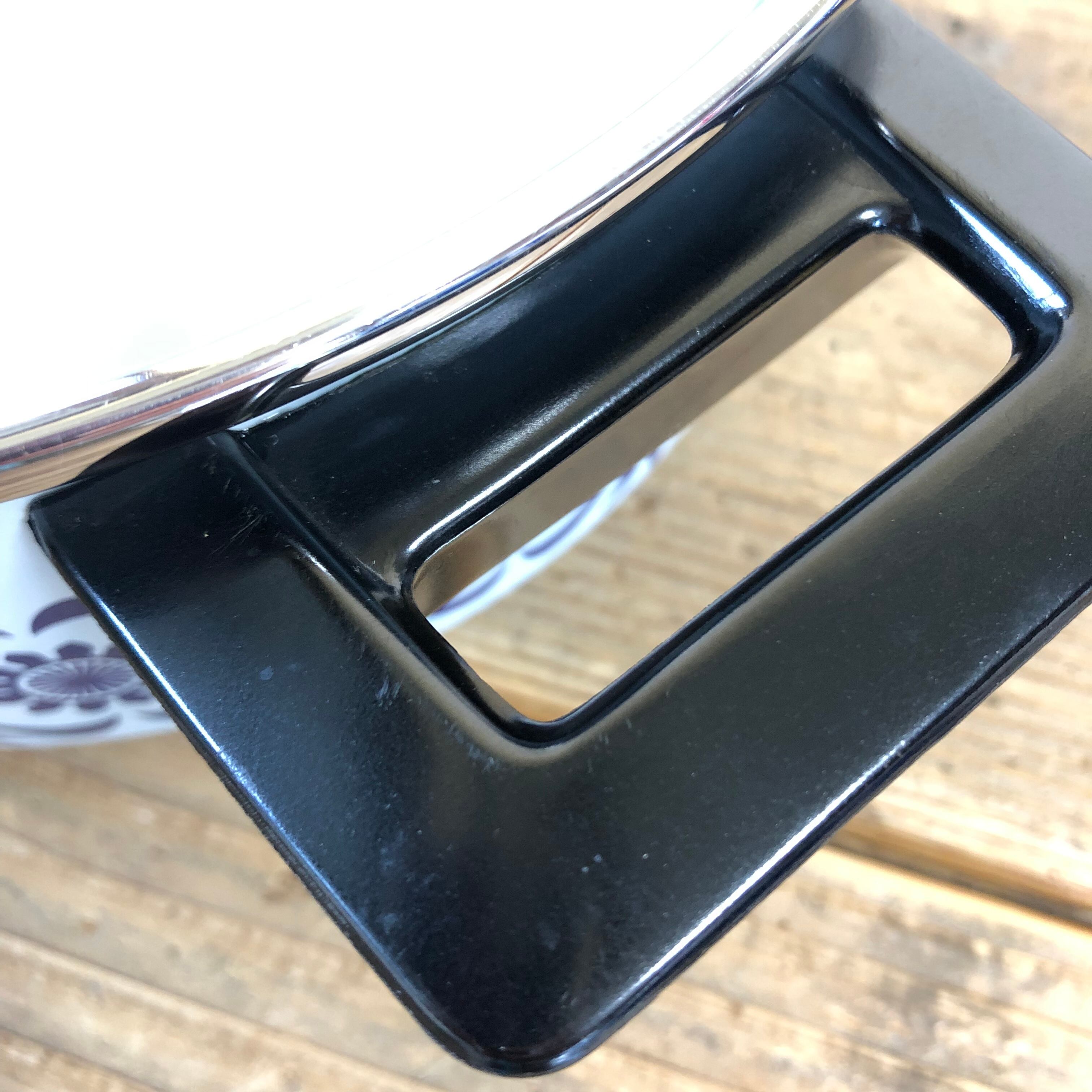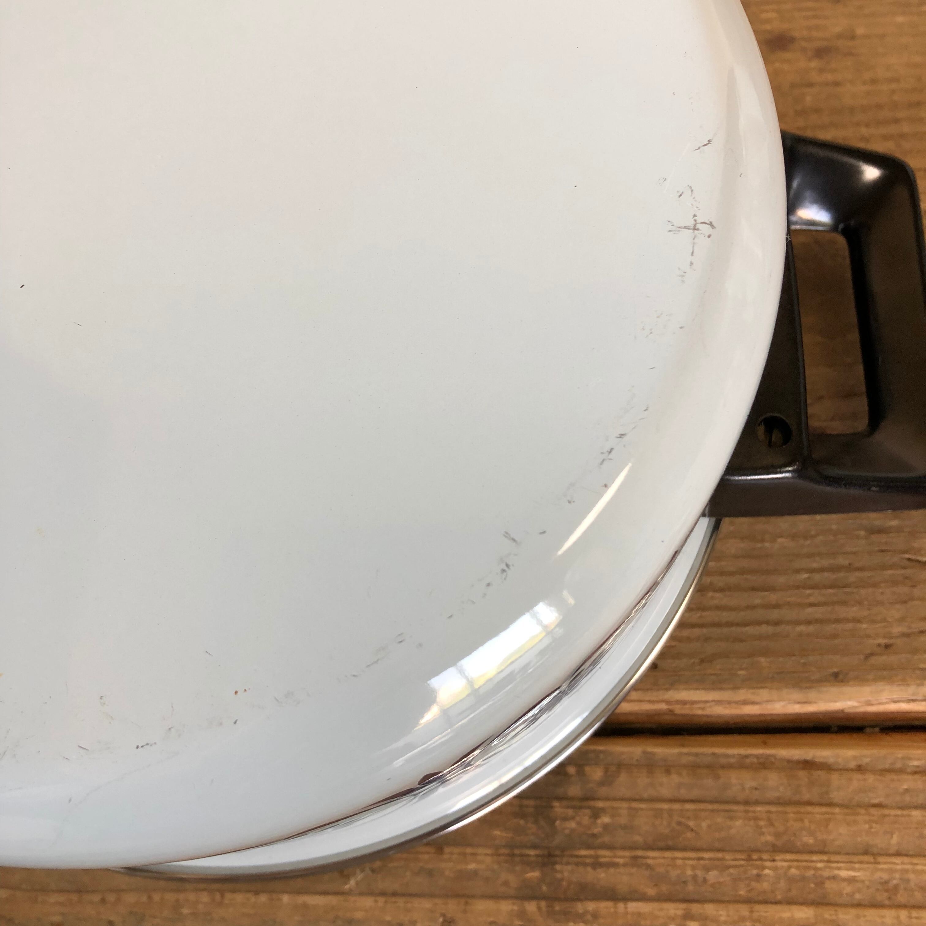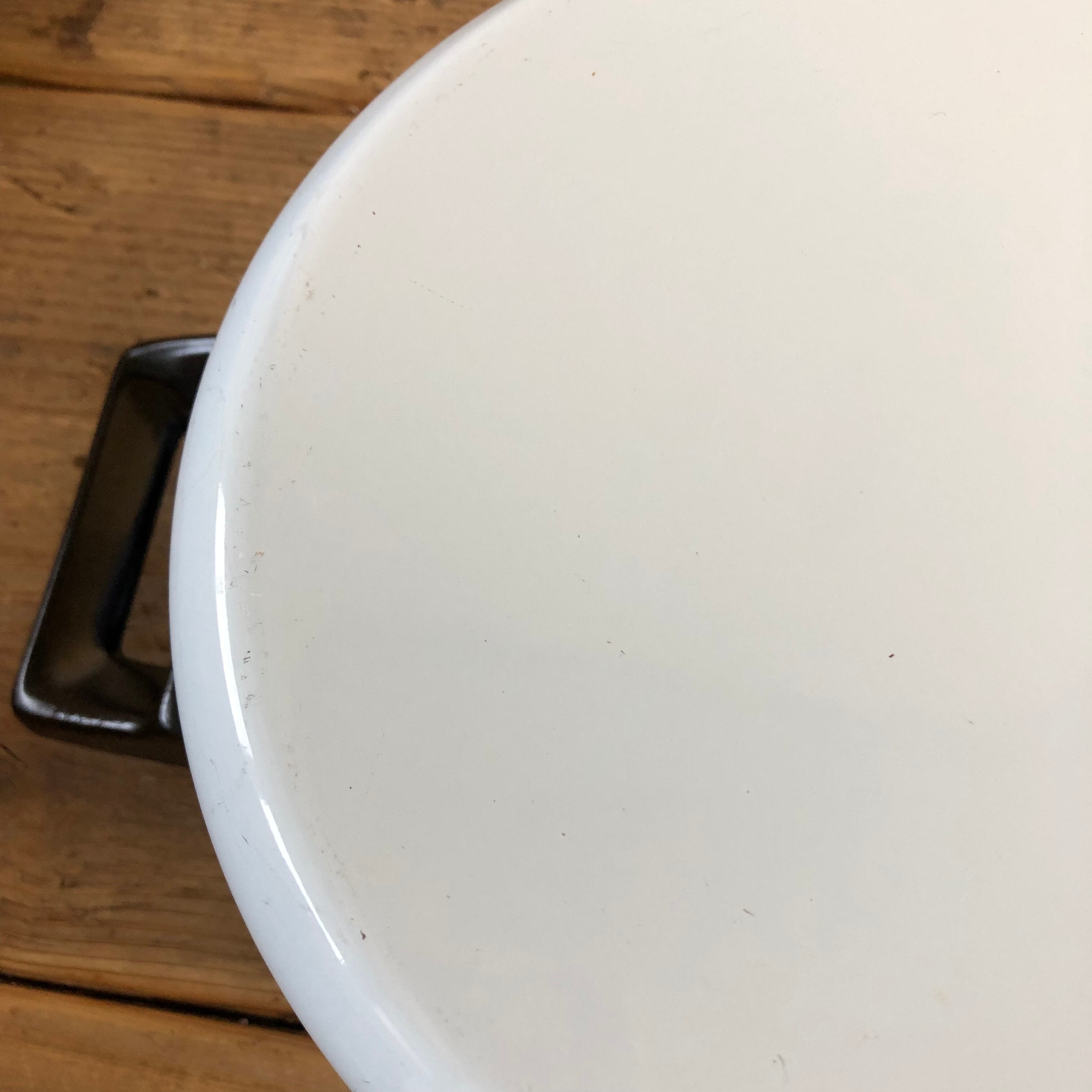 こちらのお鍋はused品ですので、鍋裏に傷や、淵に欠けがあったり、蓋のツマミにシミがあったり、持ち手も白っぽい跡が付いていたりしますが、まだまだお使いいただけるお品だと思います。