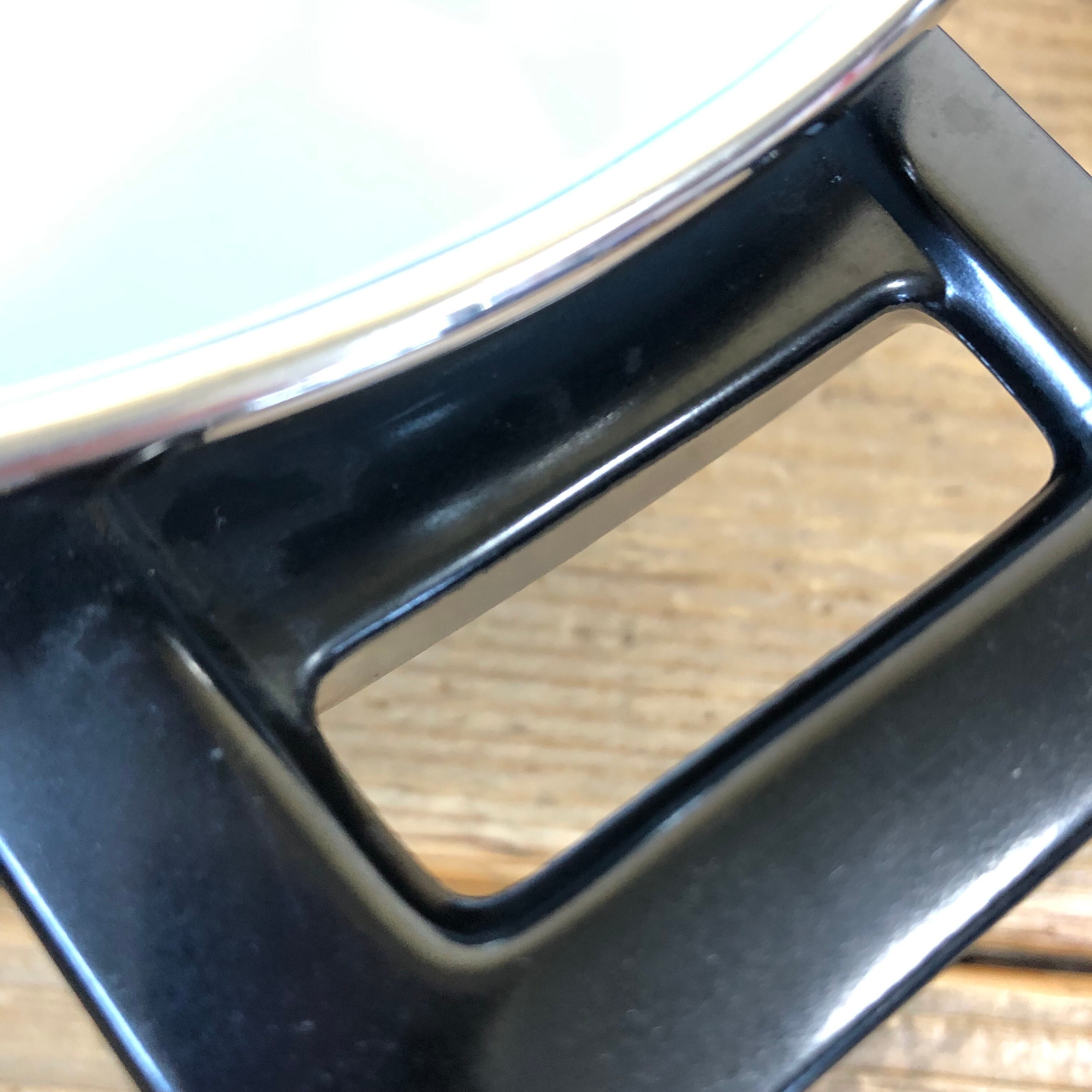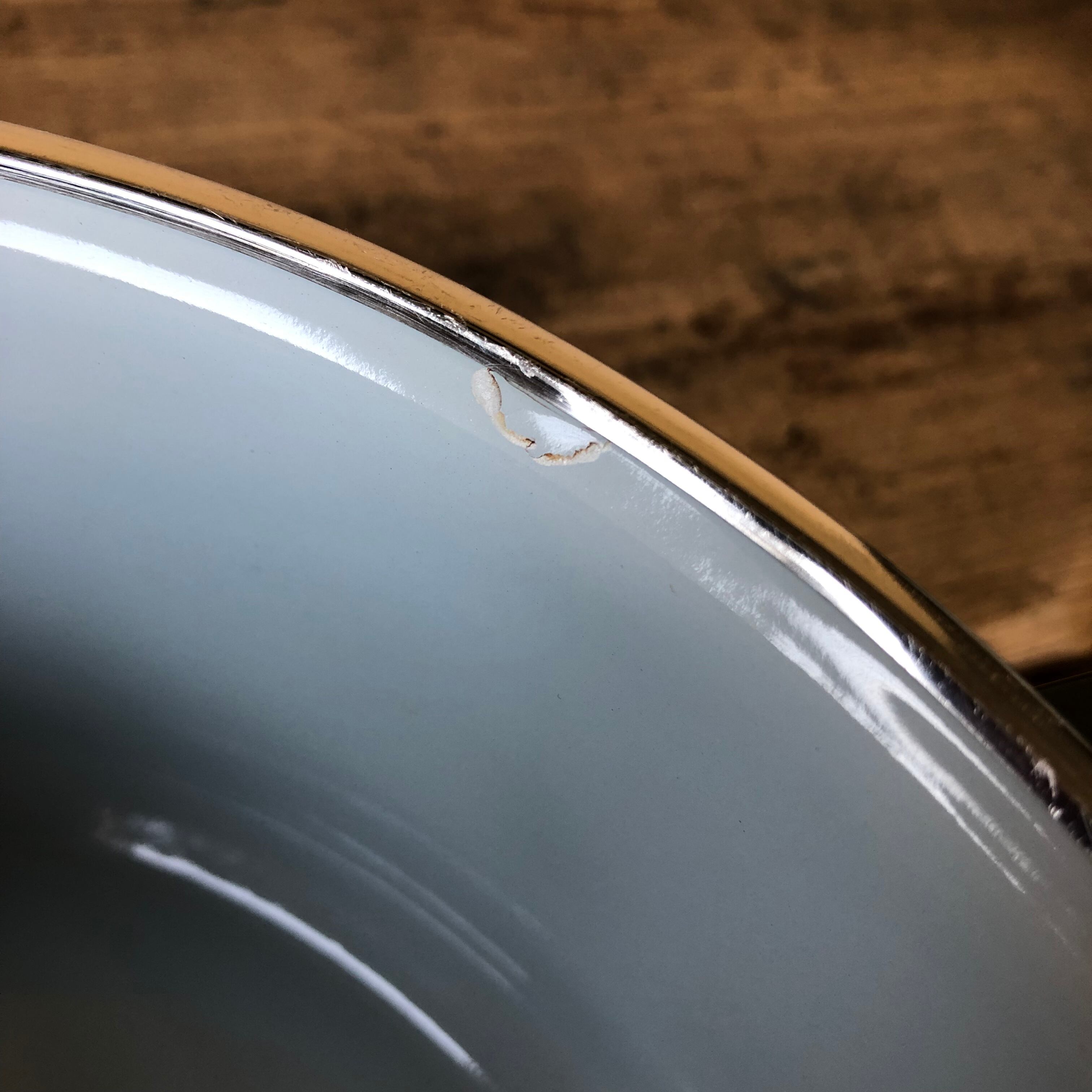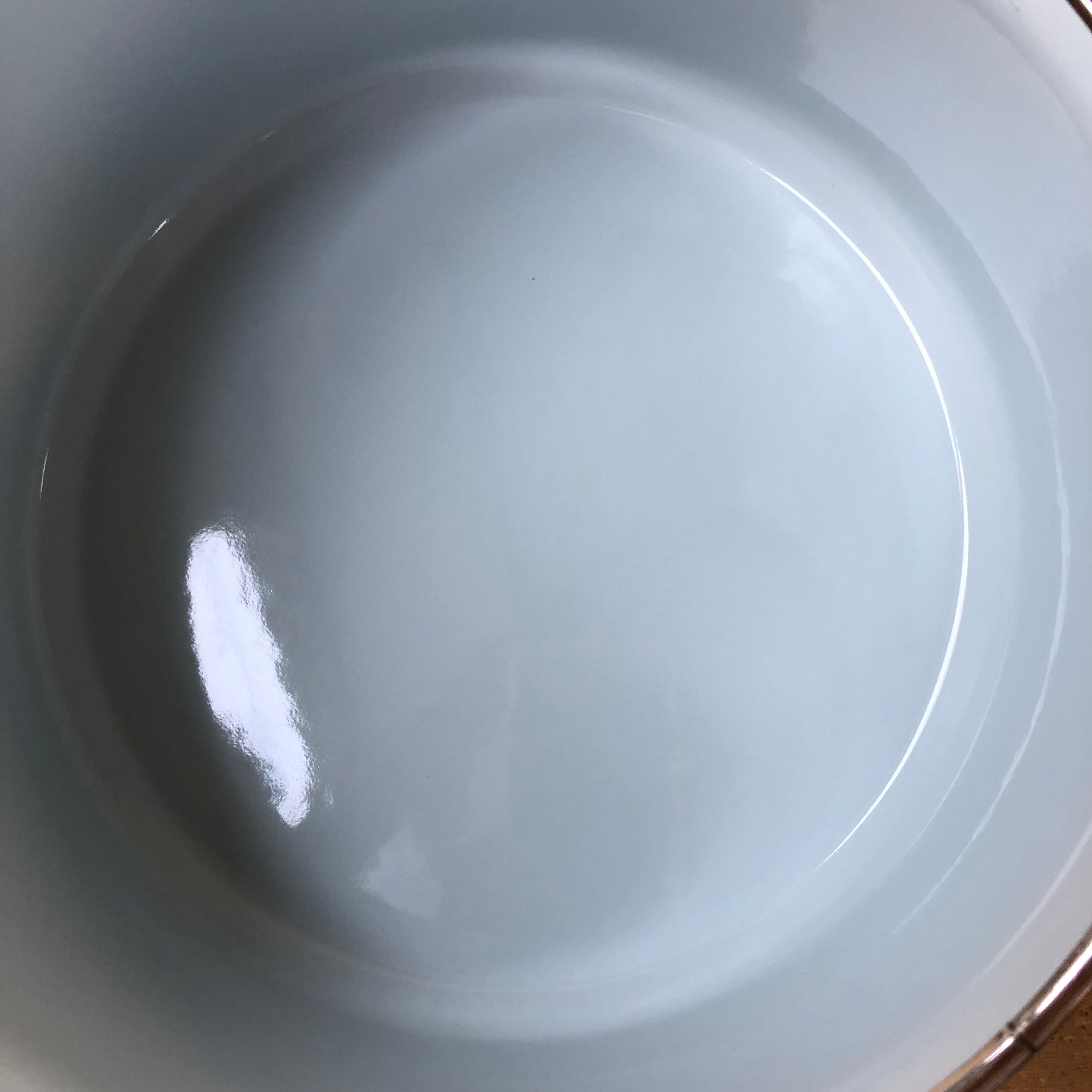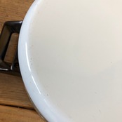 こちらのお鍋はused品ですので、鍋裏に傷や、淵に欠けがあったり、蓋のツマミにシミがあったり、持ち手も白っぽい跡が付いていたりしますが、まだまだお使いいただけるお品だと思います。