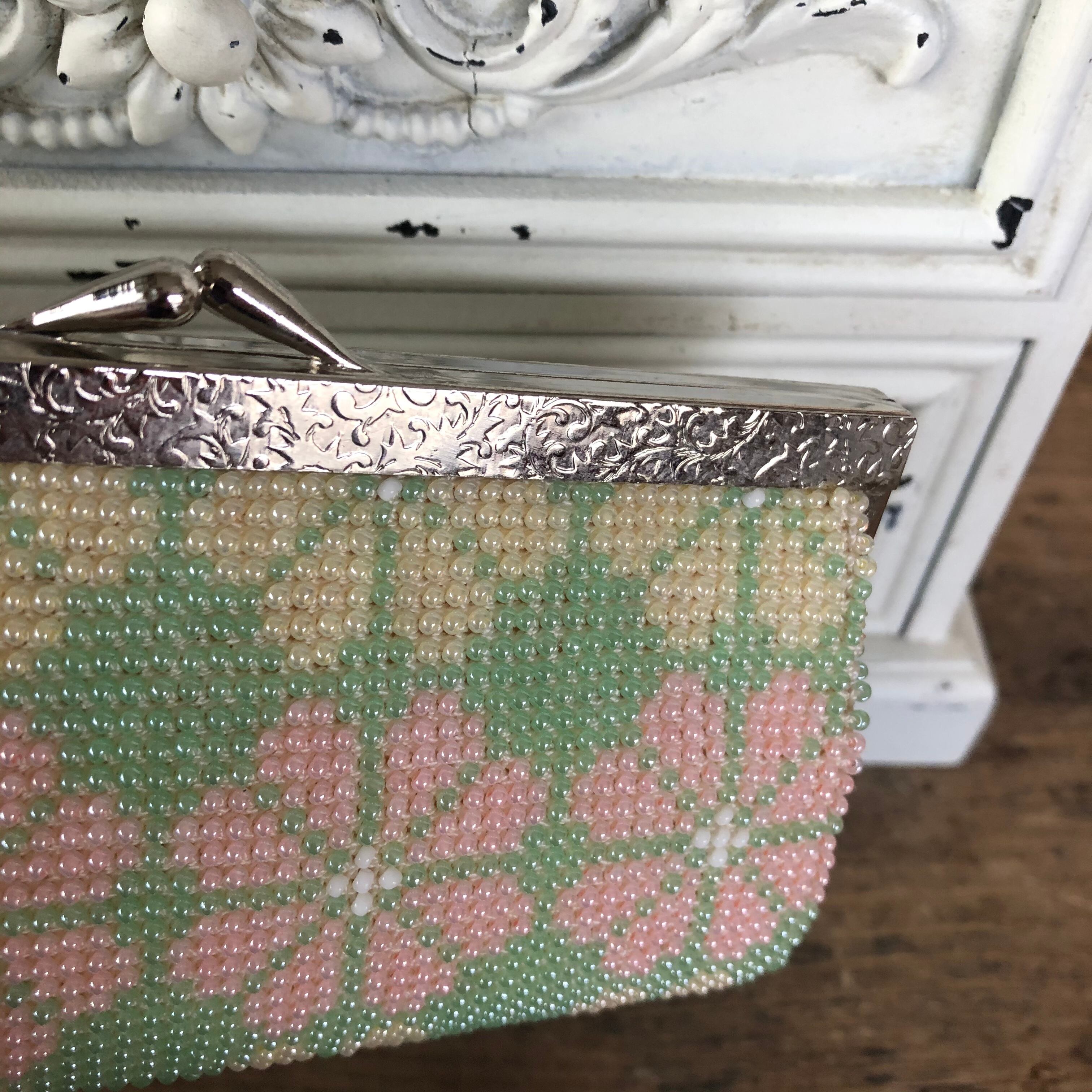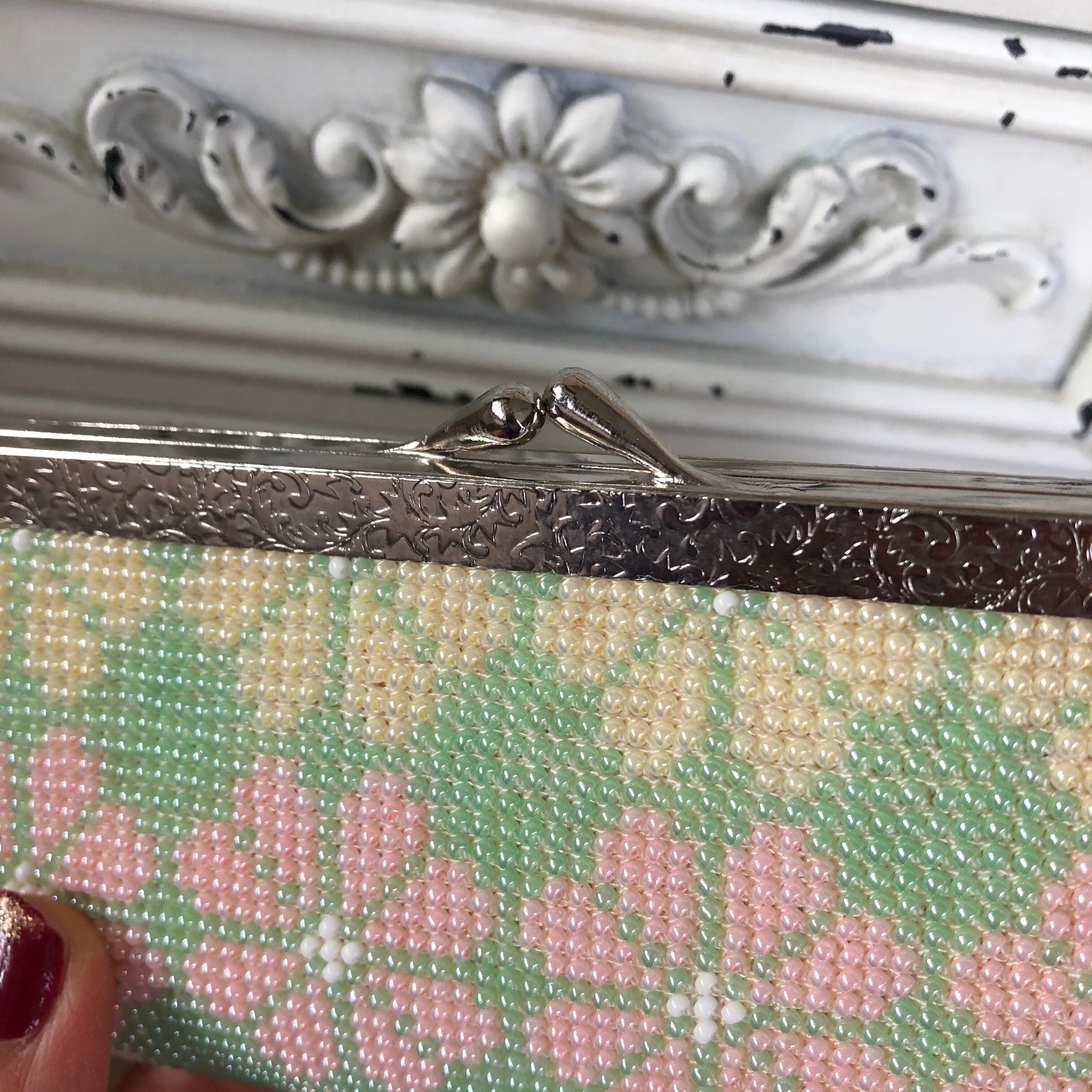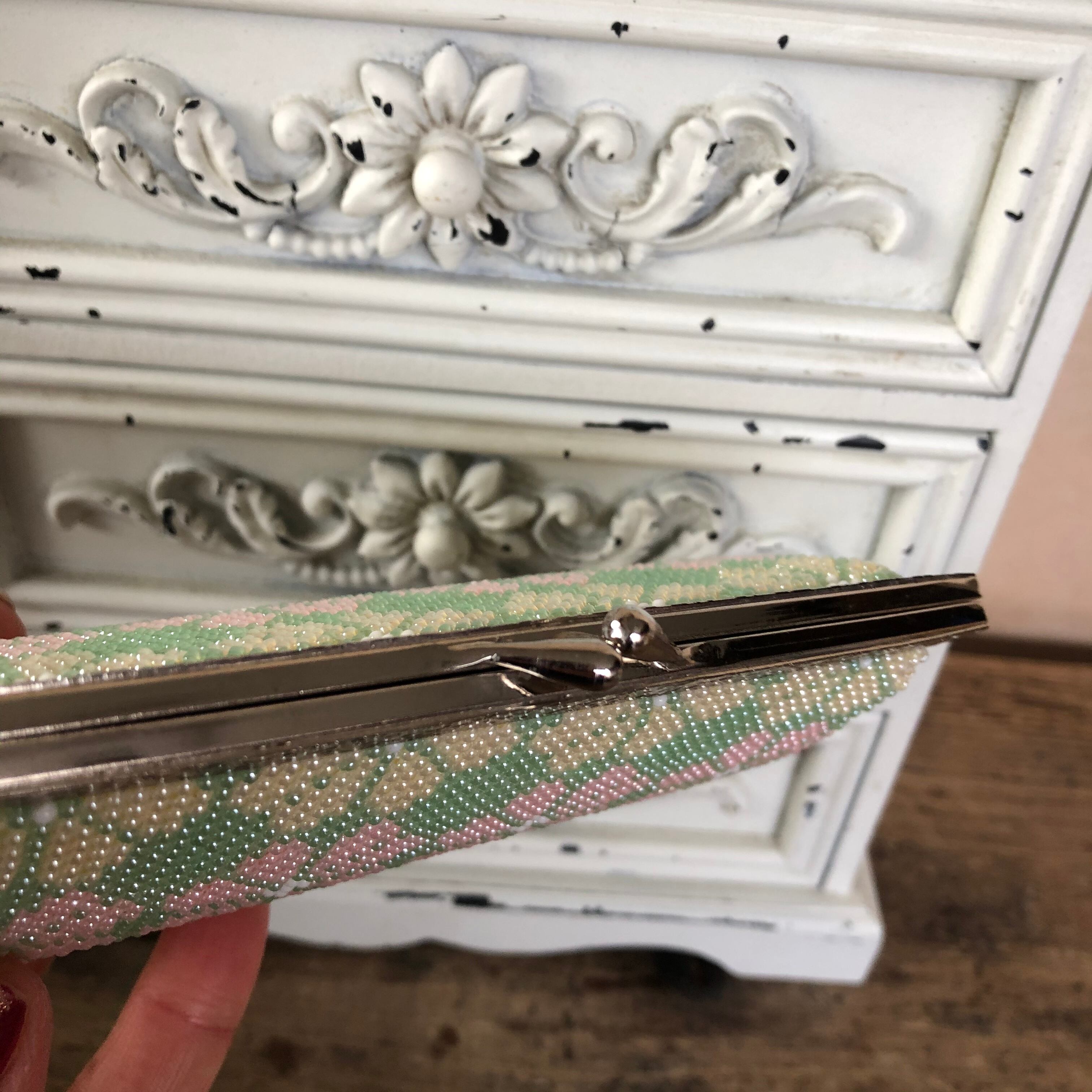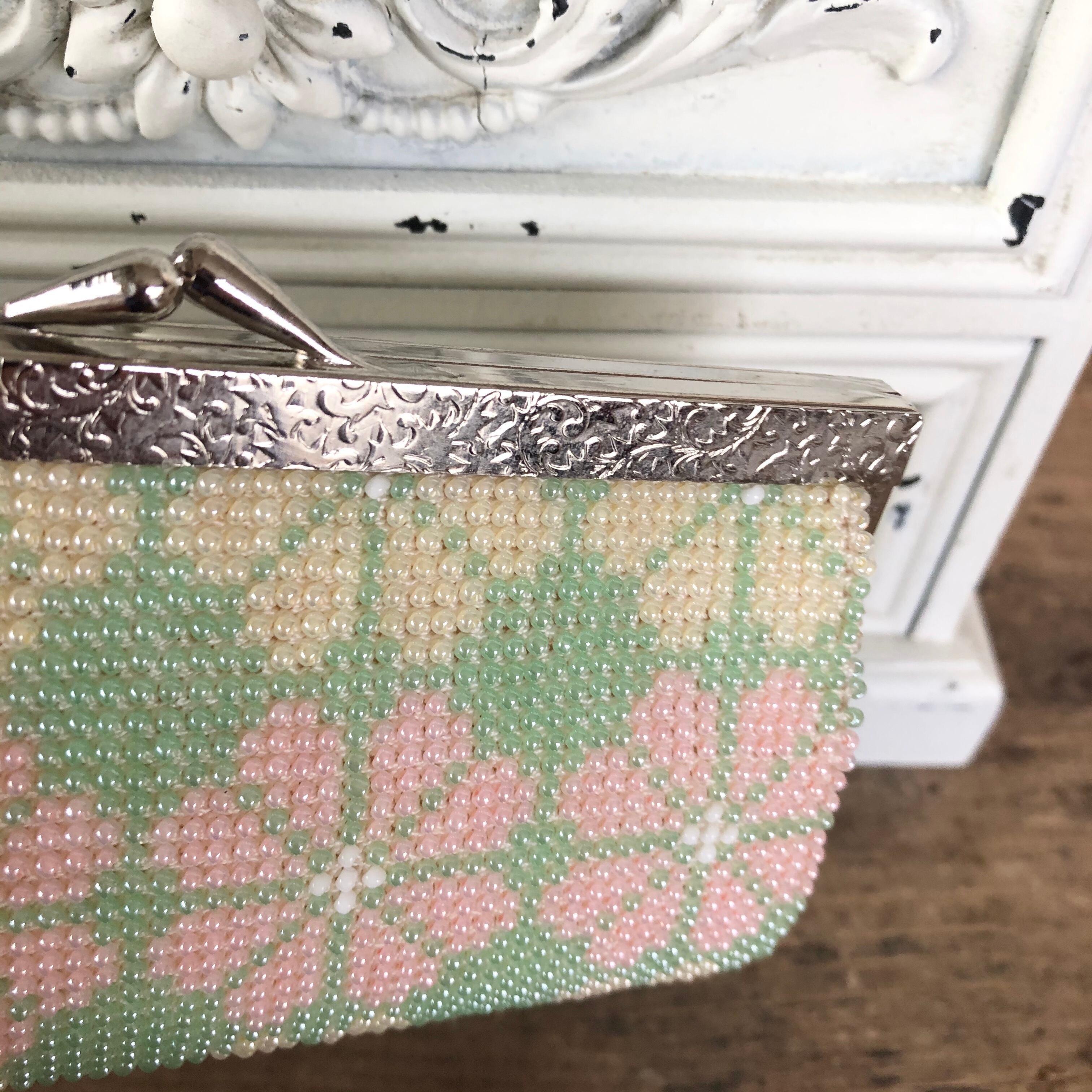 パステルカラーでビーズ刺繍が施された可愛いらしいがま口。色や金具の感じなどからレトロ感が漂っています。