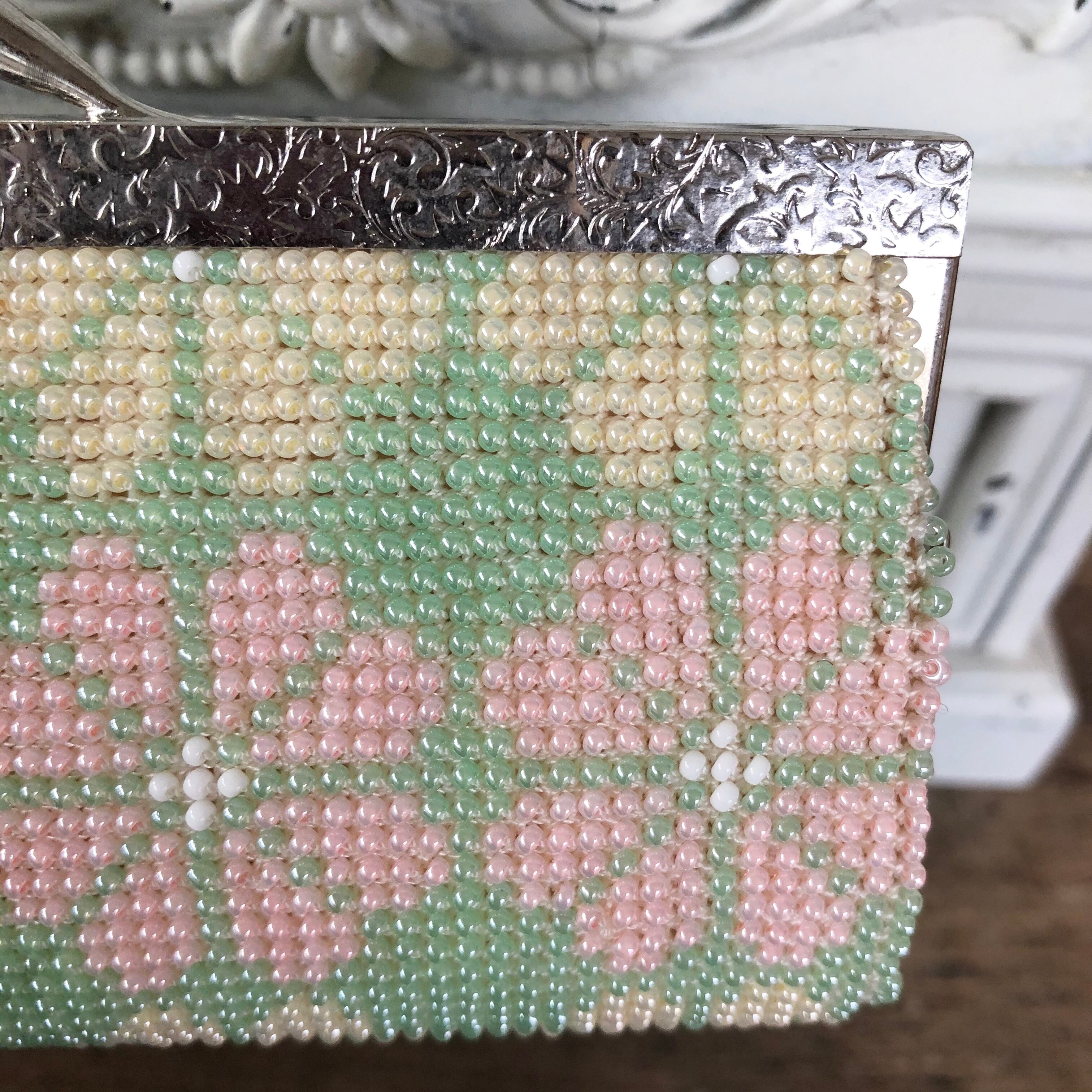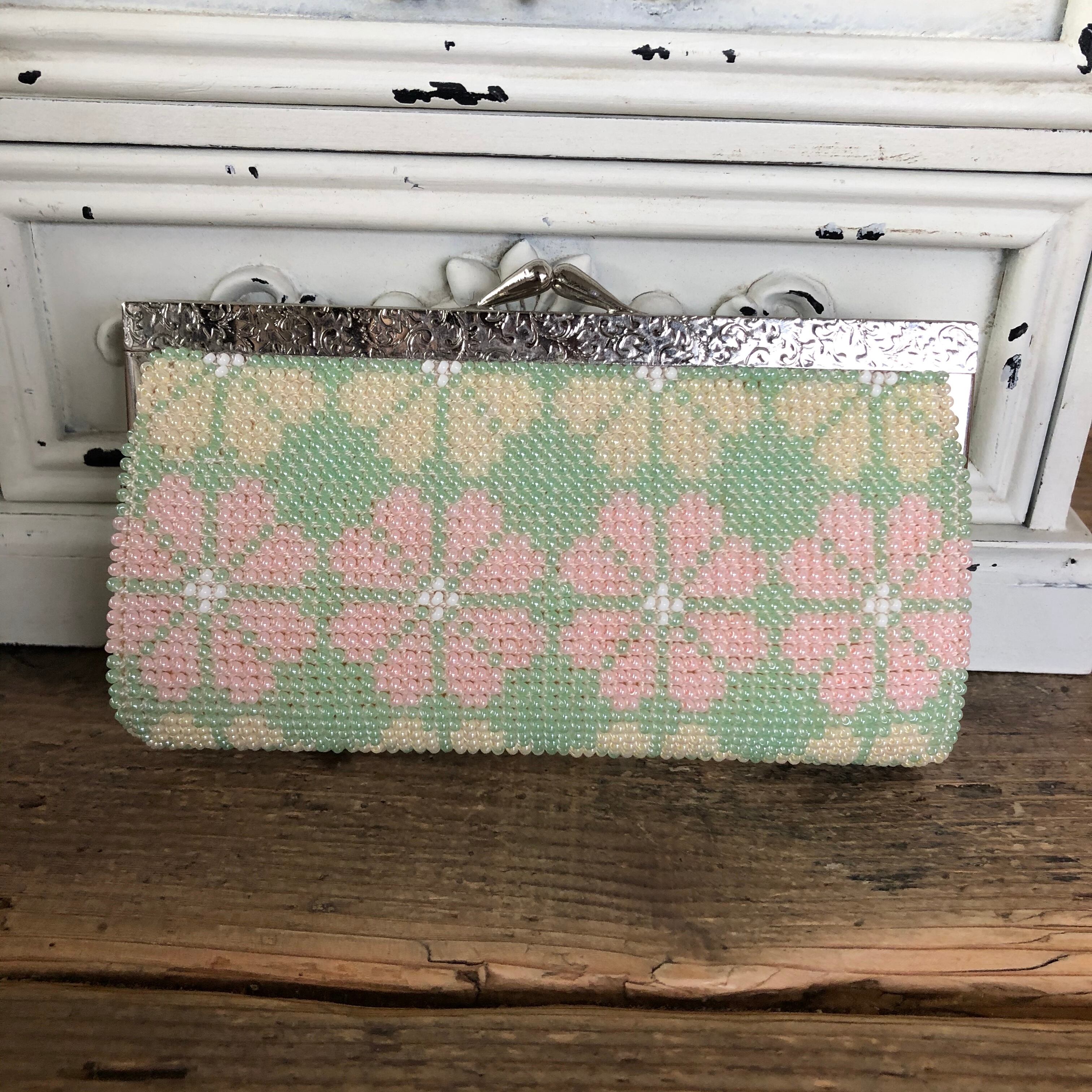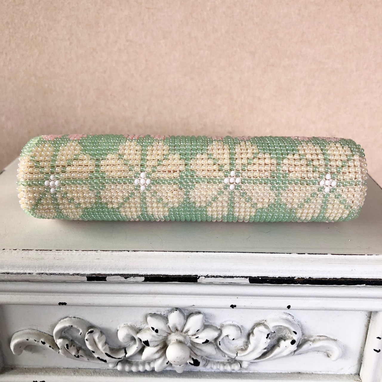 パステルカラーでビーズ刺繍が施された可愛いらしいがま口。色や金具の感じなどからレトロ感が漂っています。