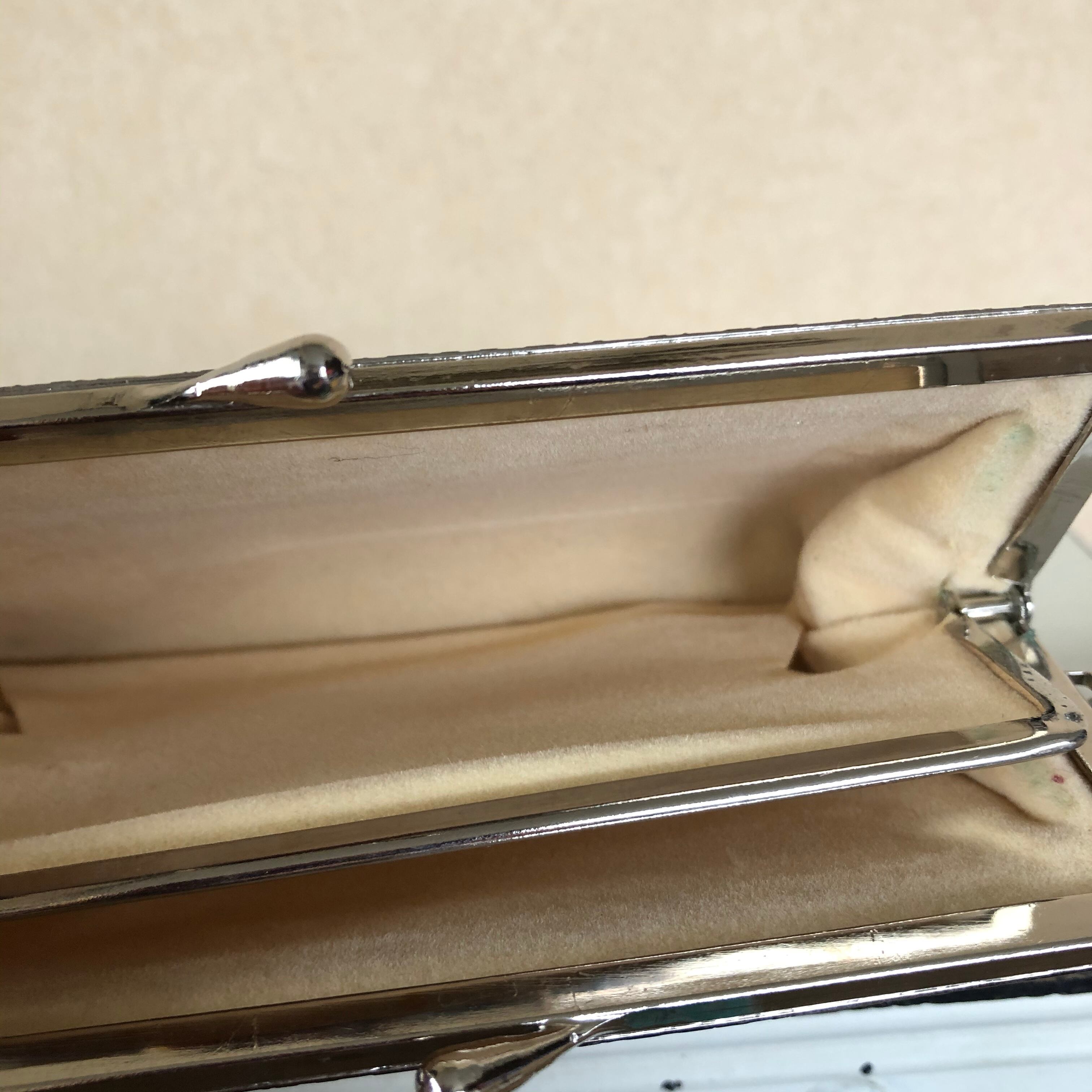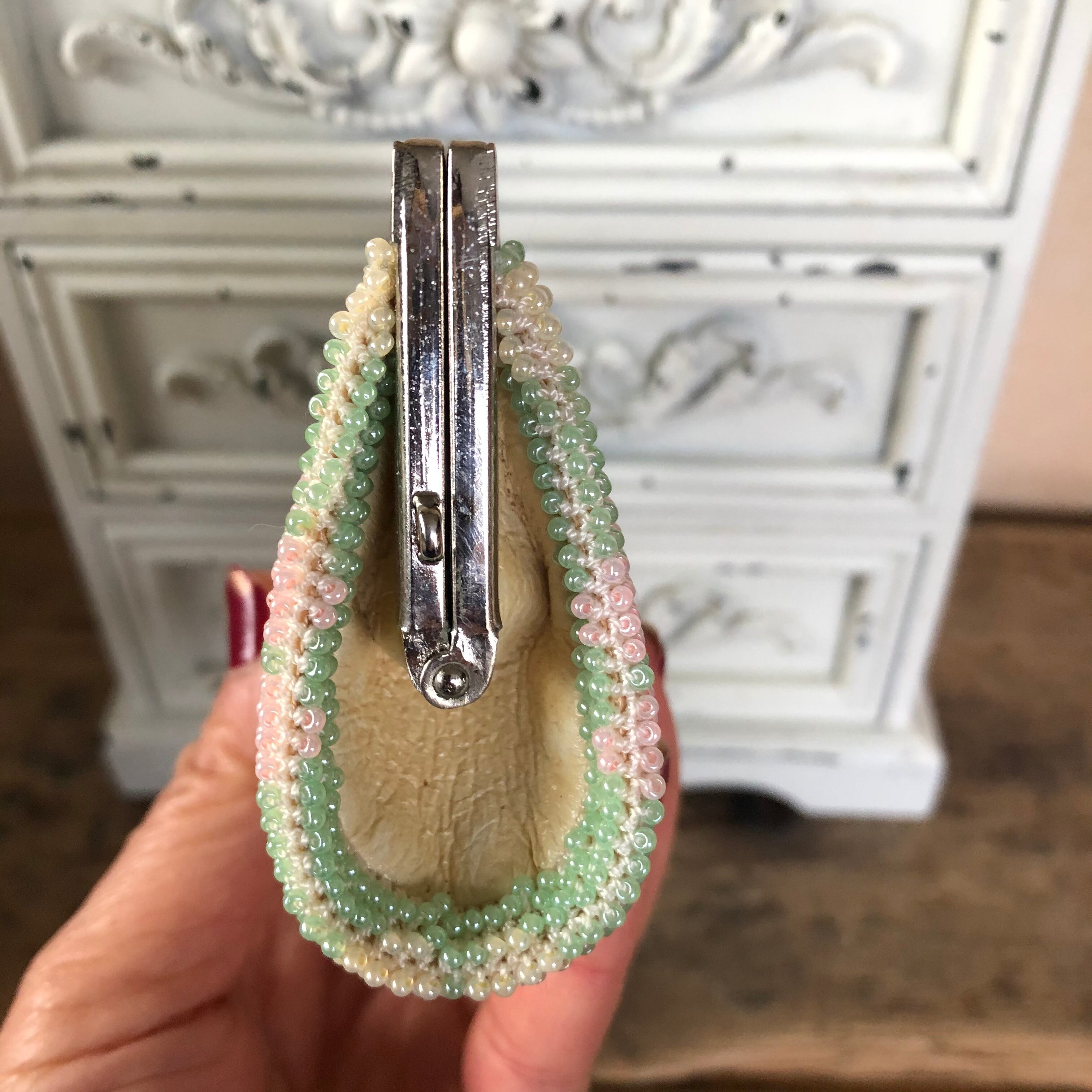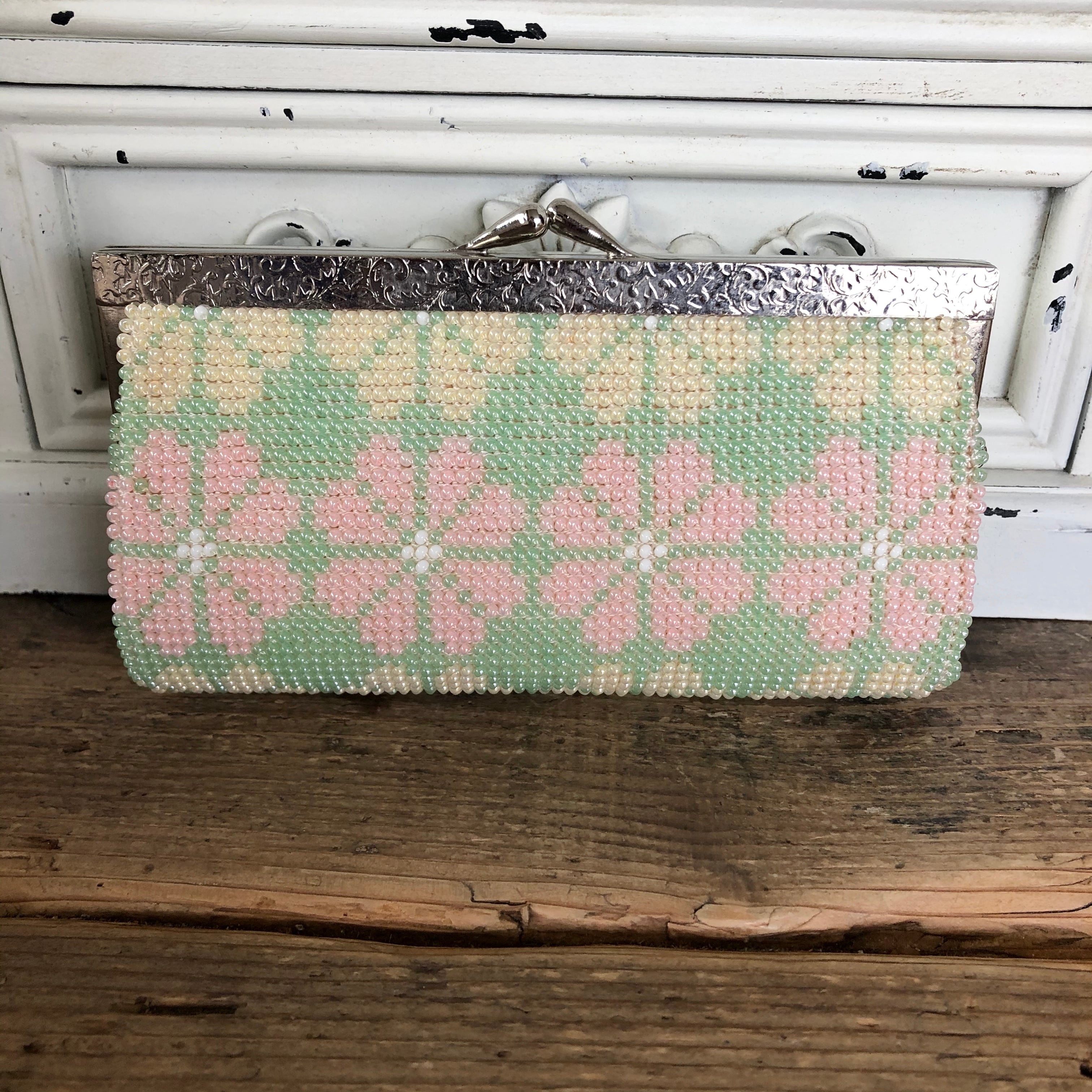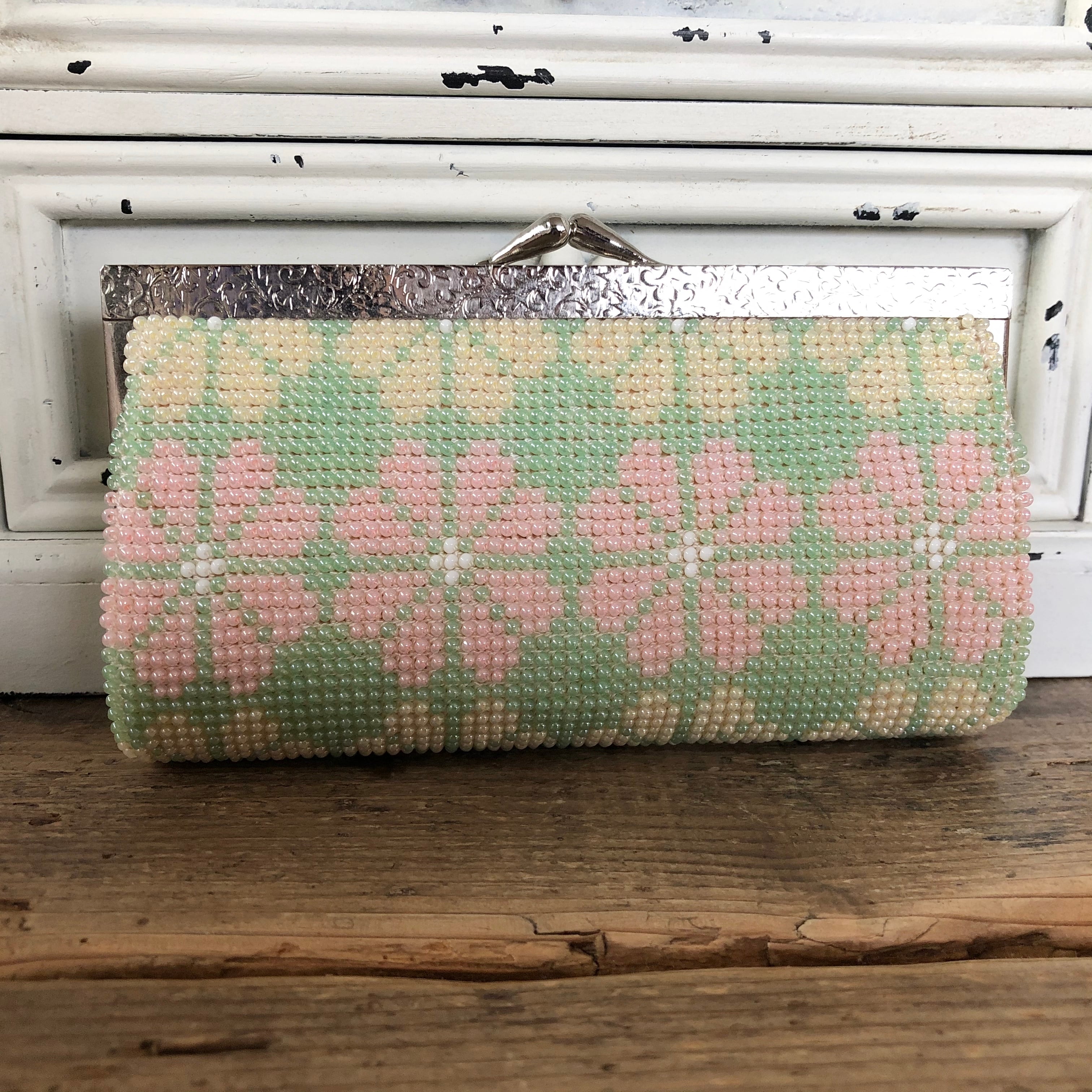 パステルカラーでビーズ刺繍が施された可愛いらしいがま口。色や金具の感じなどからレトロ感が漂っています。