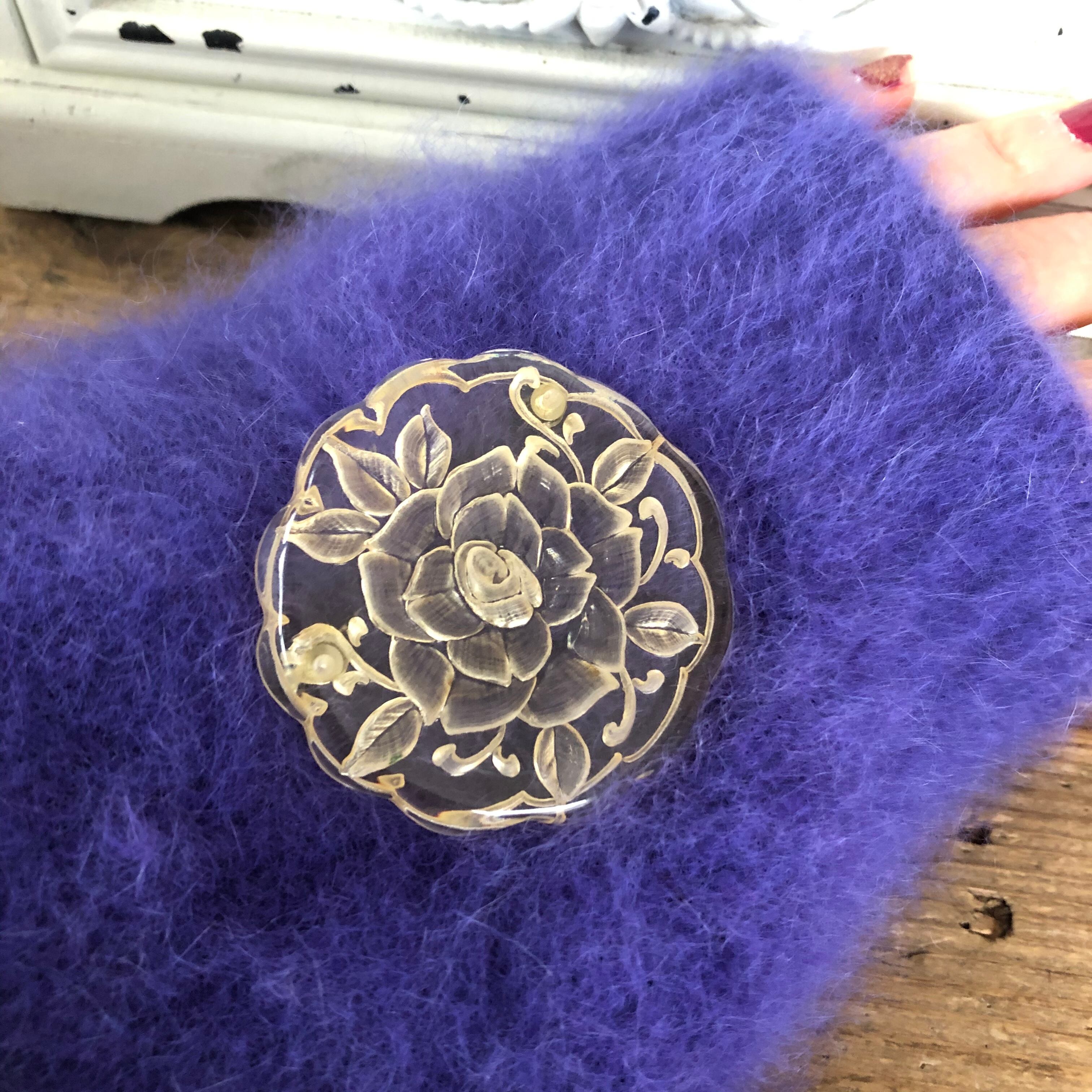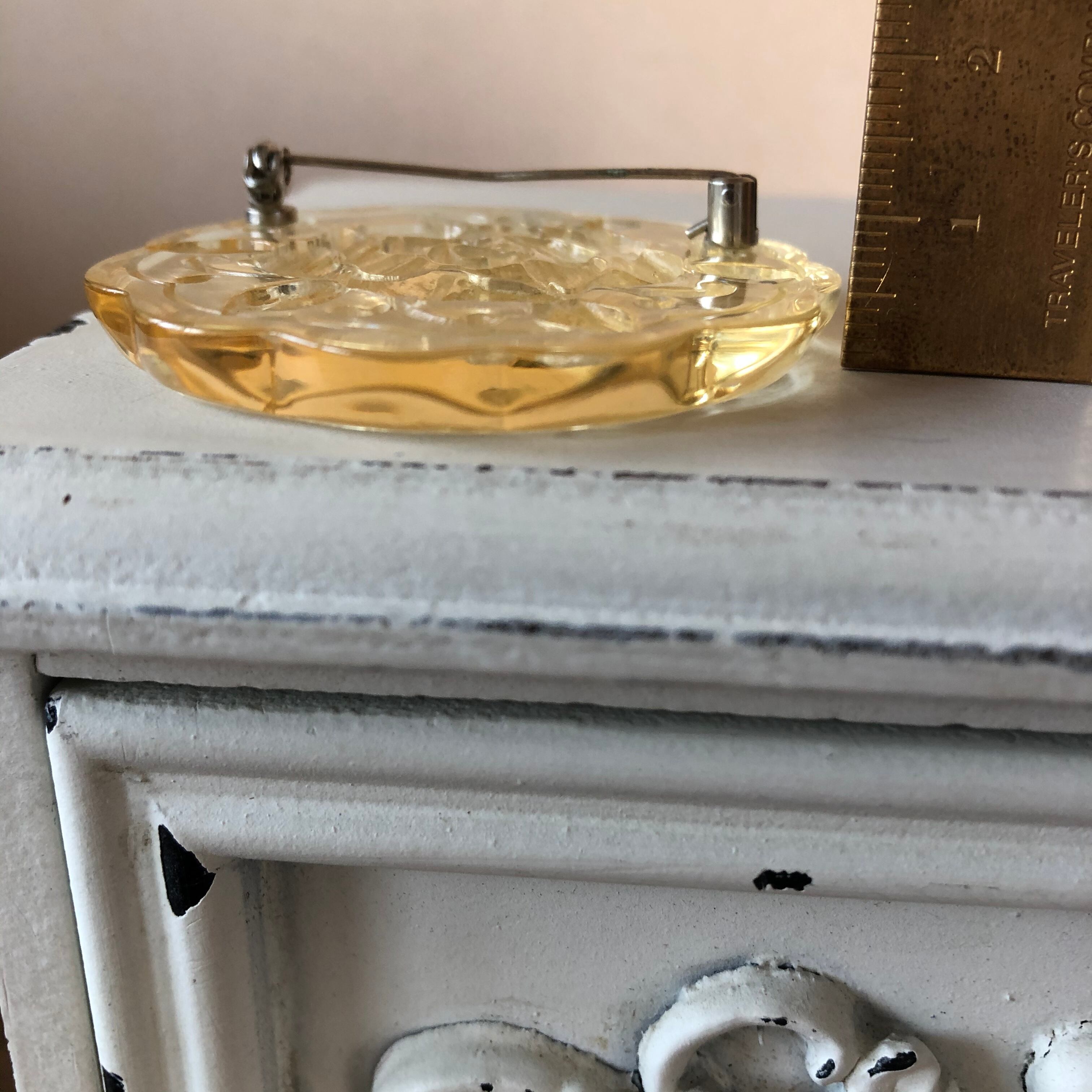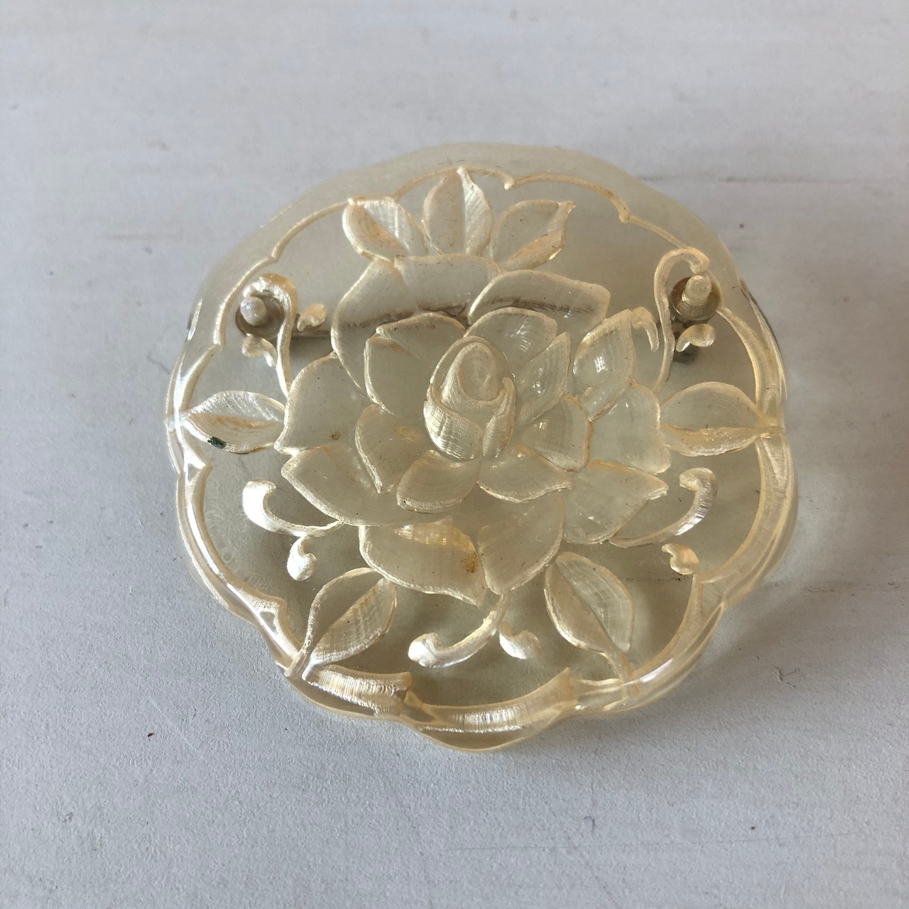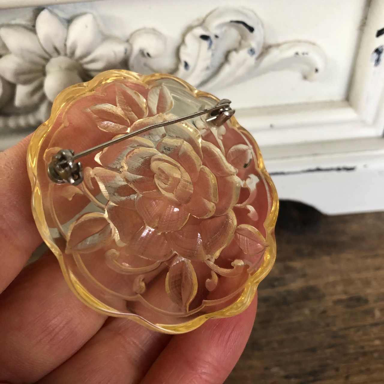 黄色味がかったクリアーなプレートに、綺麗にお花が彫り込まれたブローチ 。