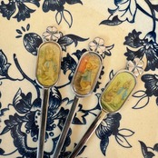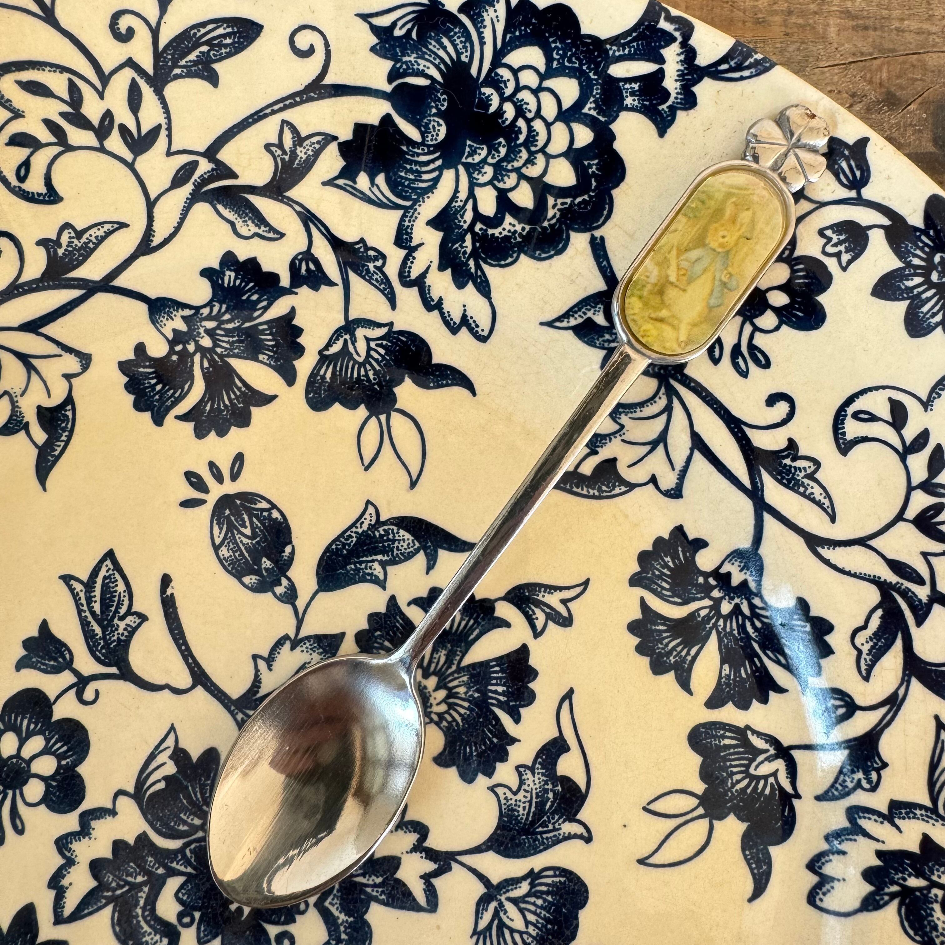 黒ずみなど、使用感はありますが、ピーターの絵やクローバーのモチーフが可愛いらしく、ティースプーンやちょっとしたデザート用などに便利にお使いいただけそうなスプーンです。